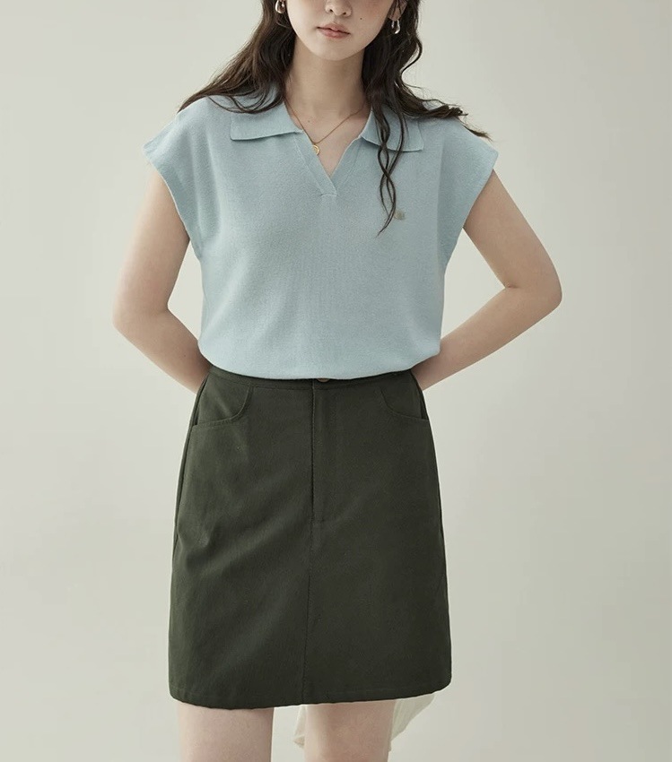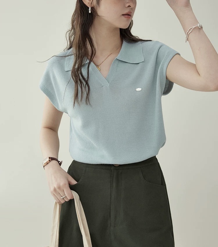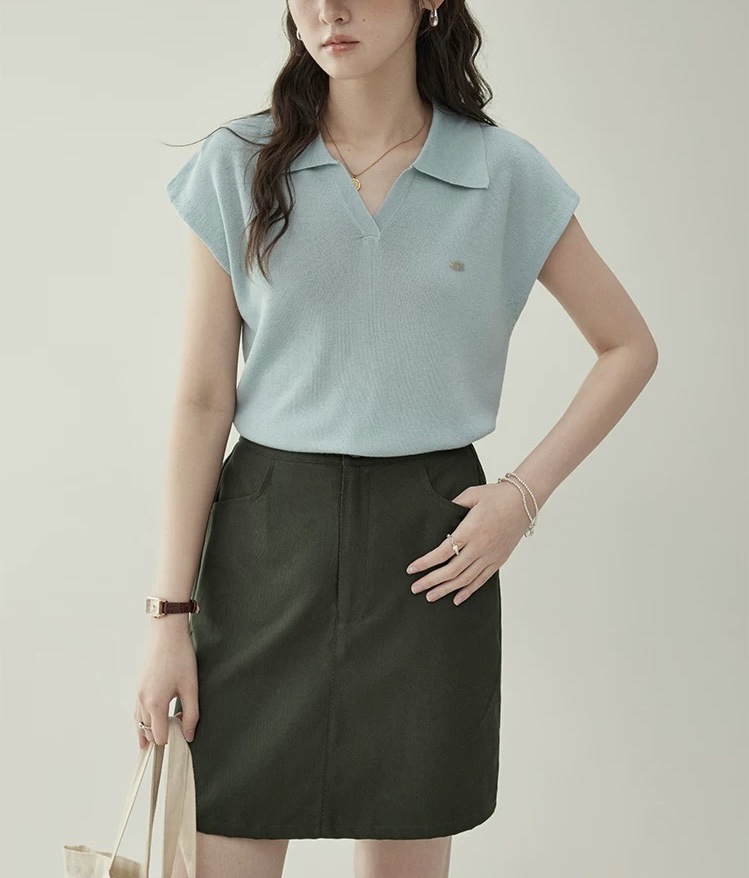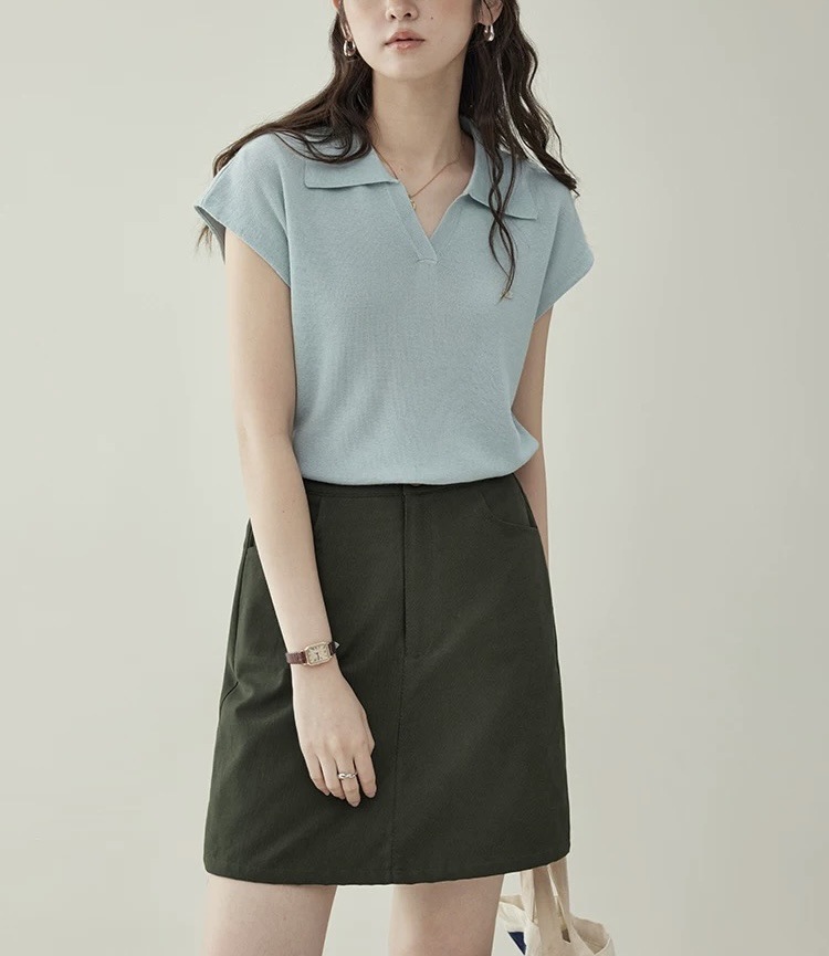 「北岛」法式纯色v领插肩袖针织t恤女夏新款收腰显瘦休闲上衣