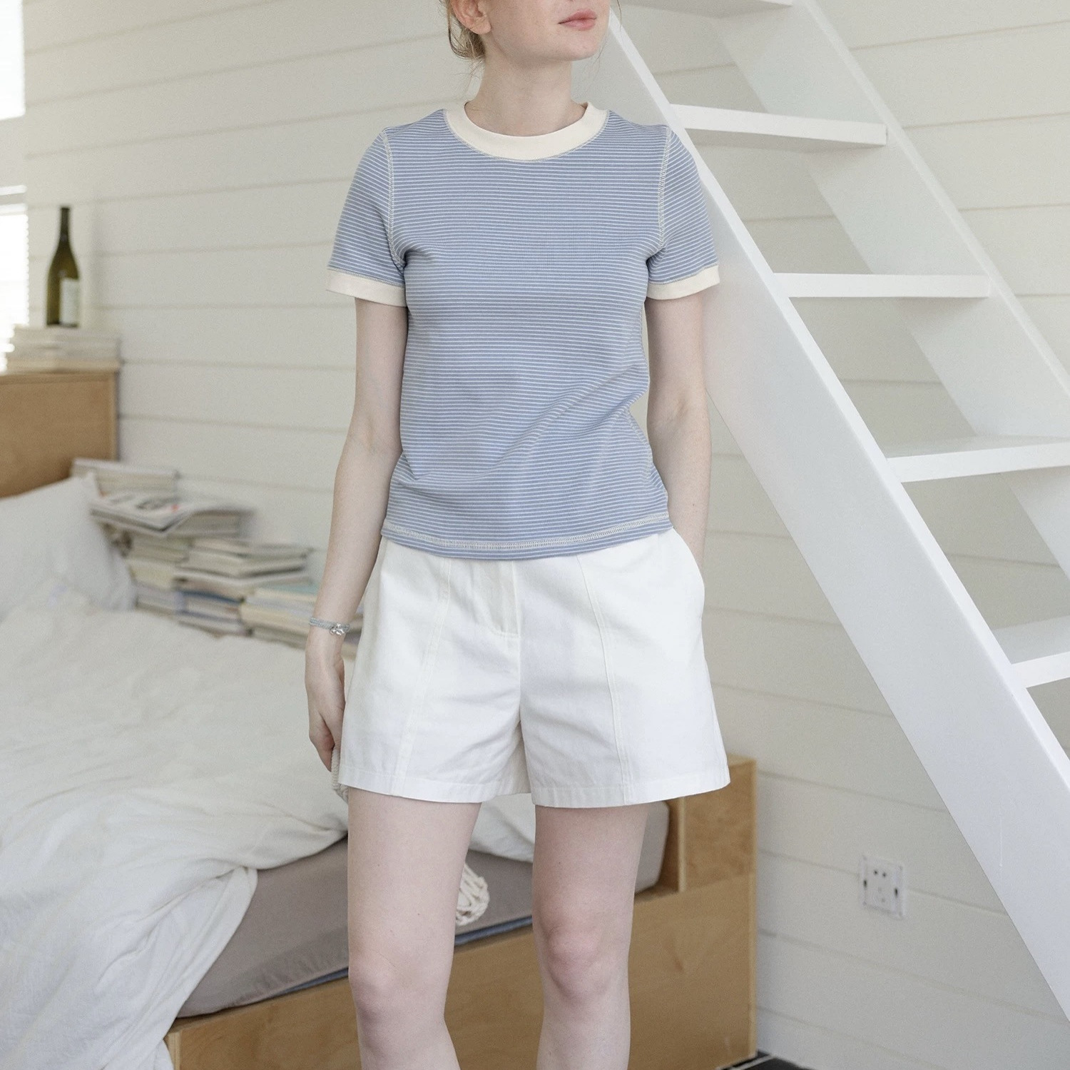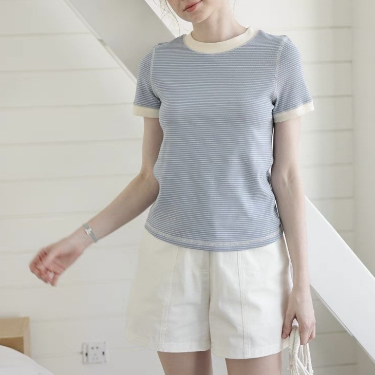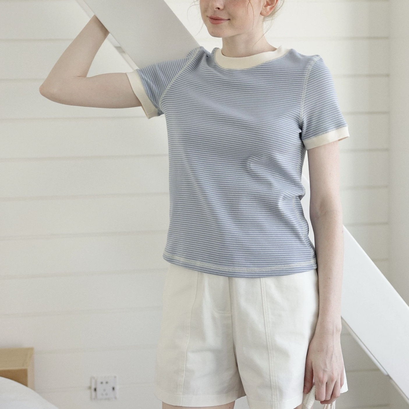 桑葚千层' 植物染色 色织条纹撞色圆领北欧简约正肩T恤