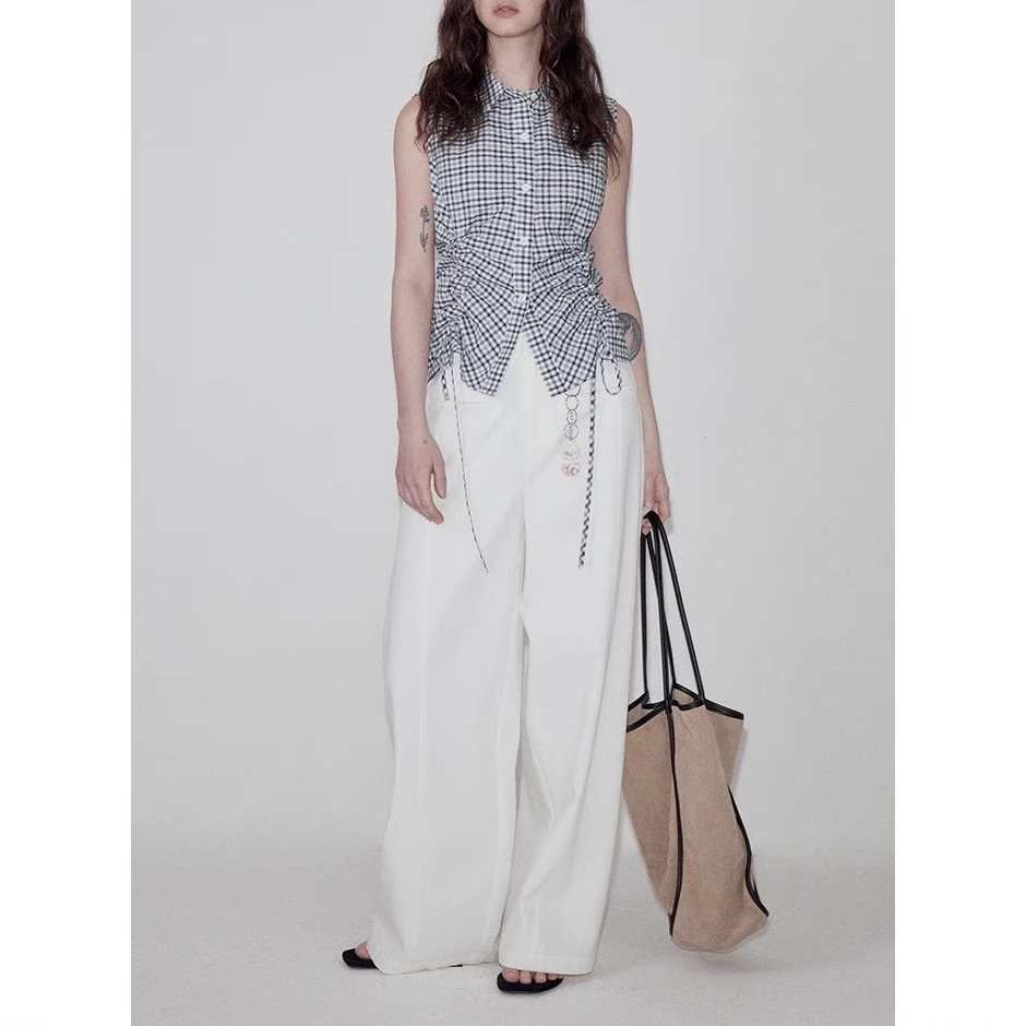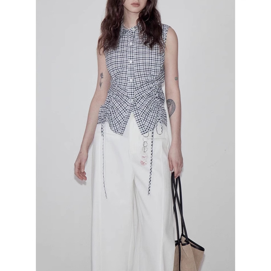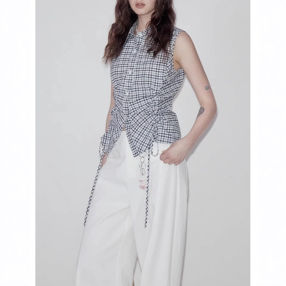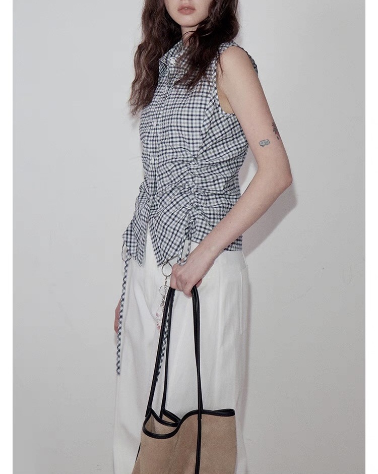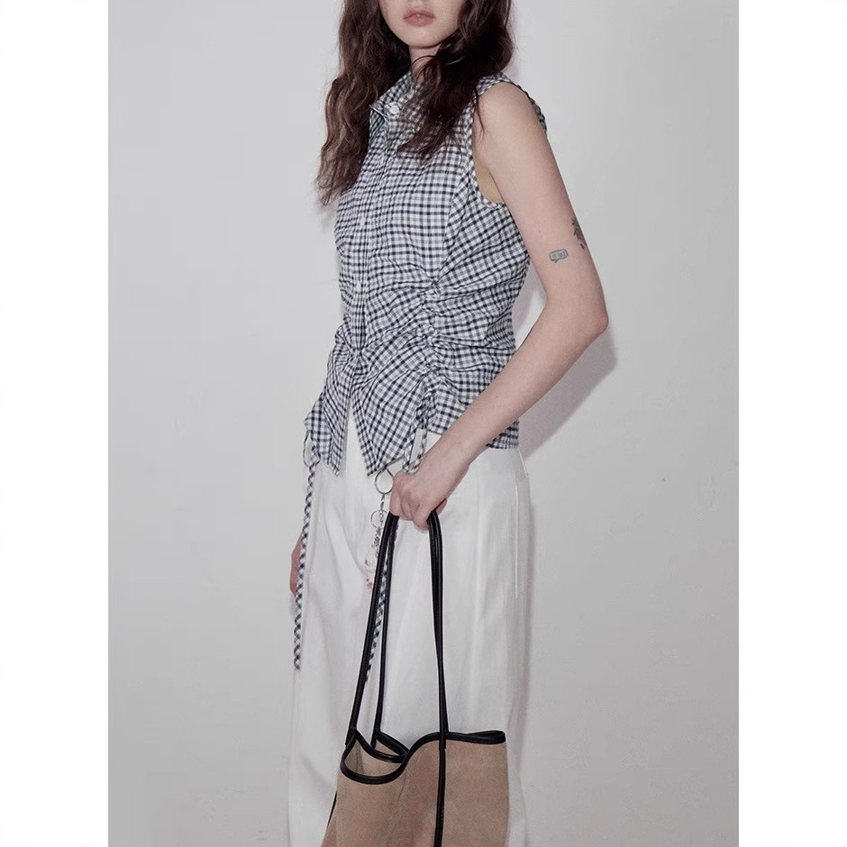设计感两侧抽褶无袖格纹上衣女2025夏季新款翻领短款T恤