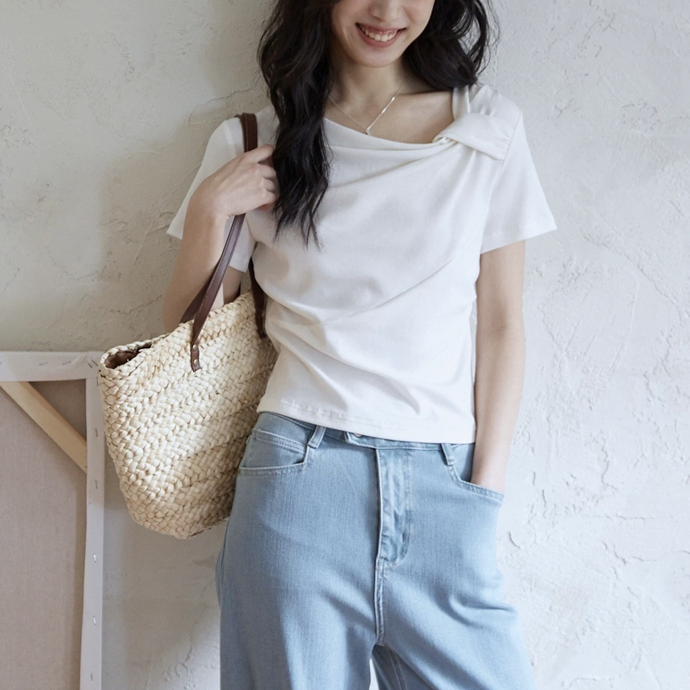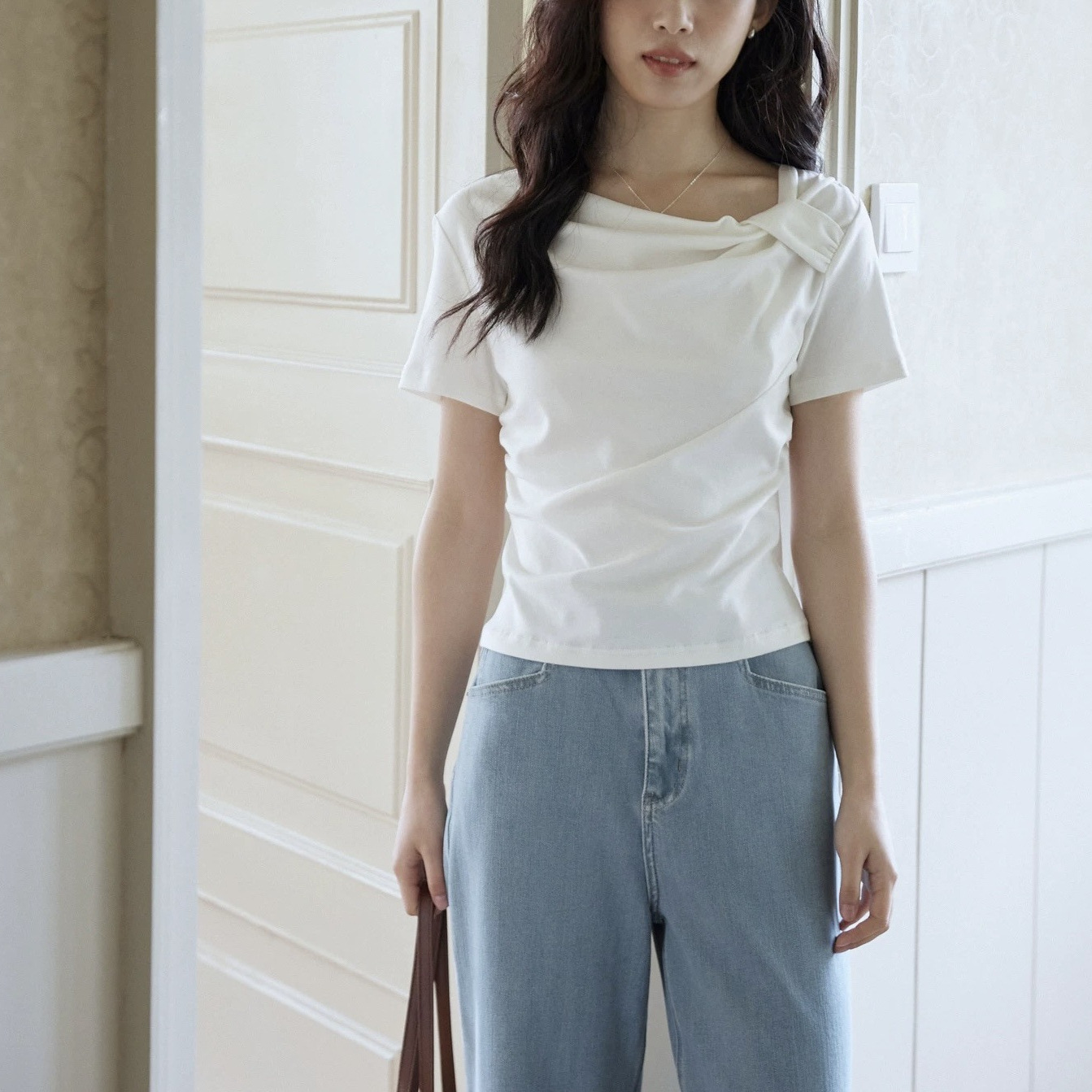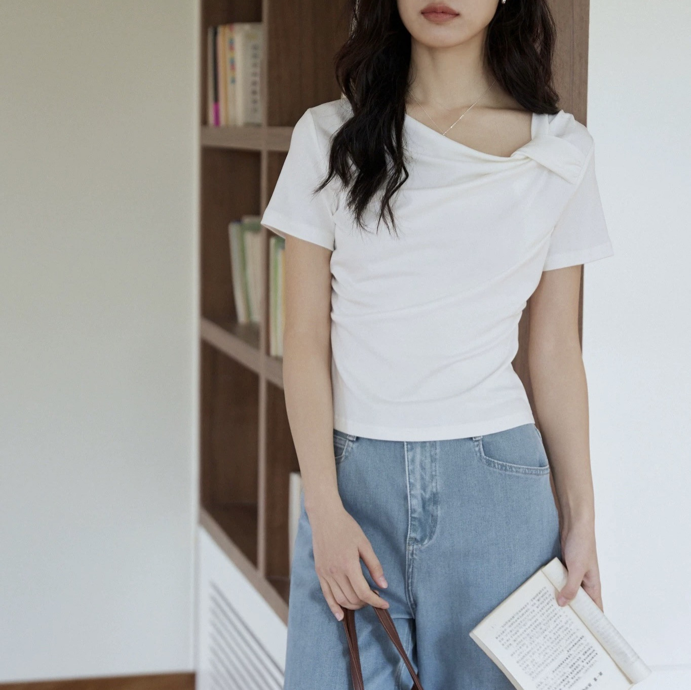 白色斜领纽结短袖T恤女夏款褶皱不规则设计感收腰正肩上衣
