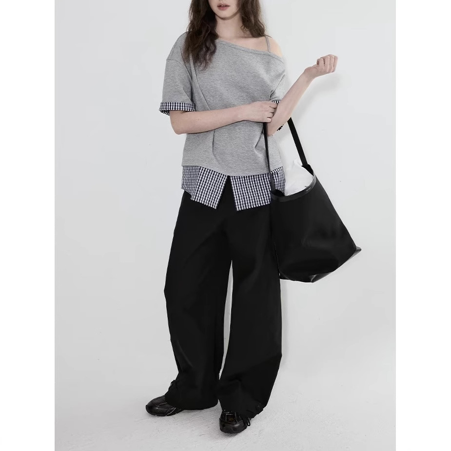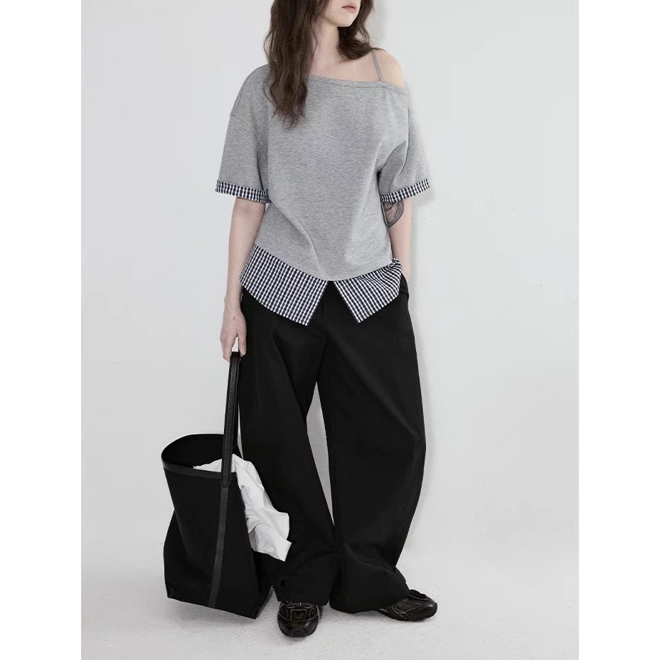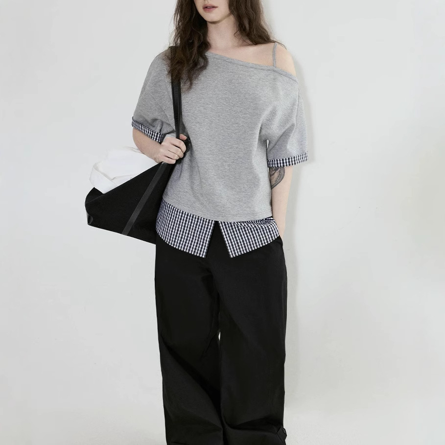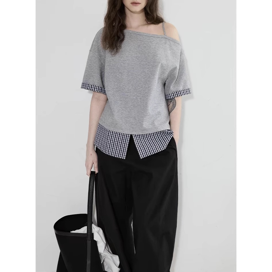 时髦感斜肩上衣女2025春夏miu系格纹拼接宽松假两件t恤