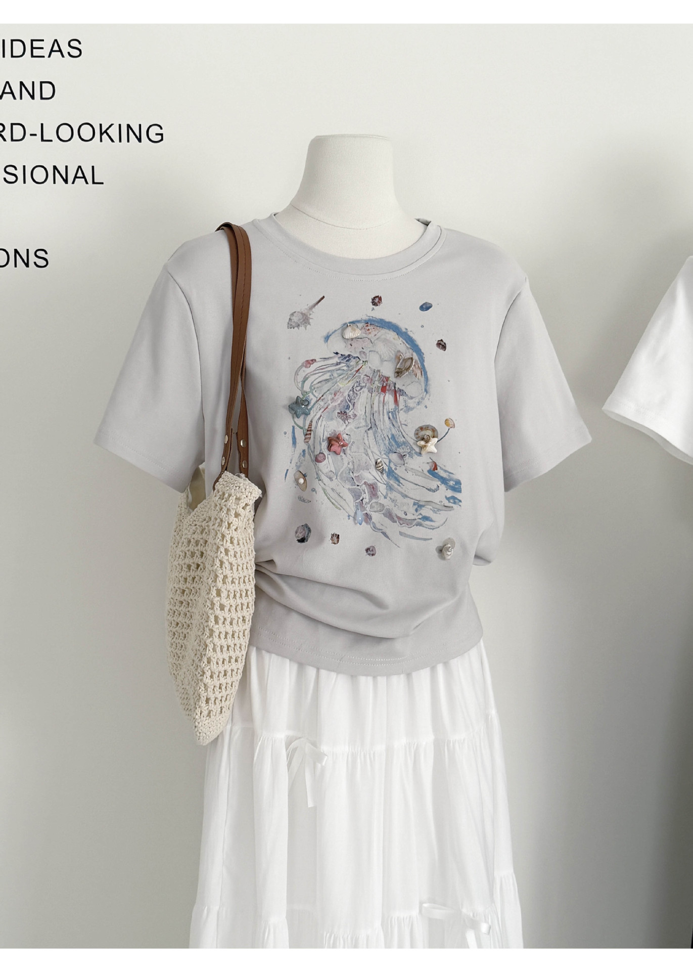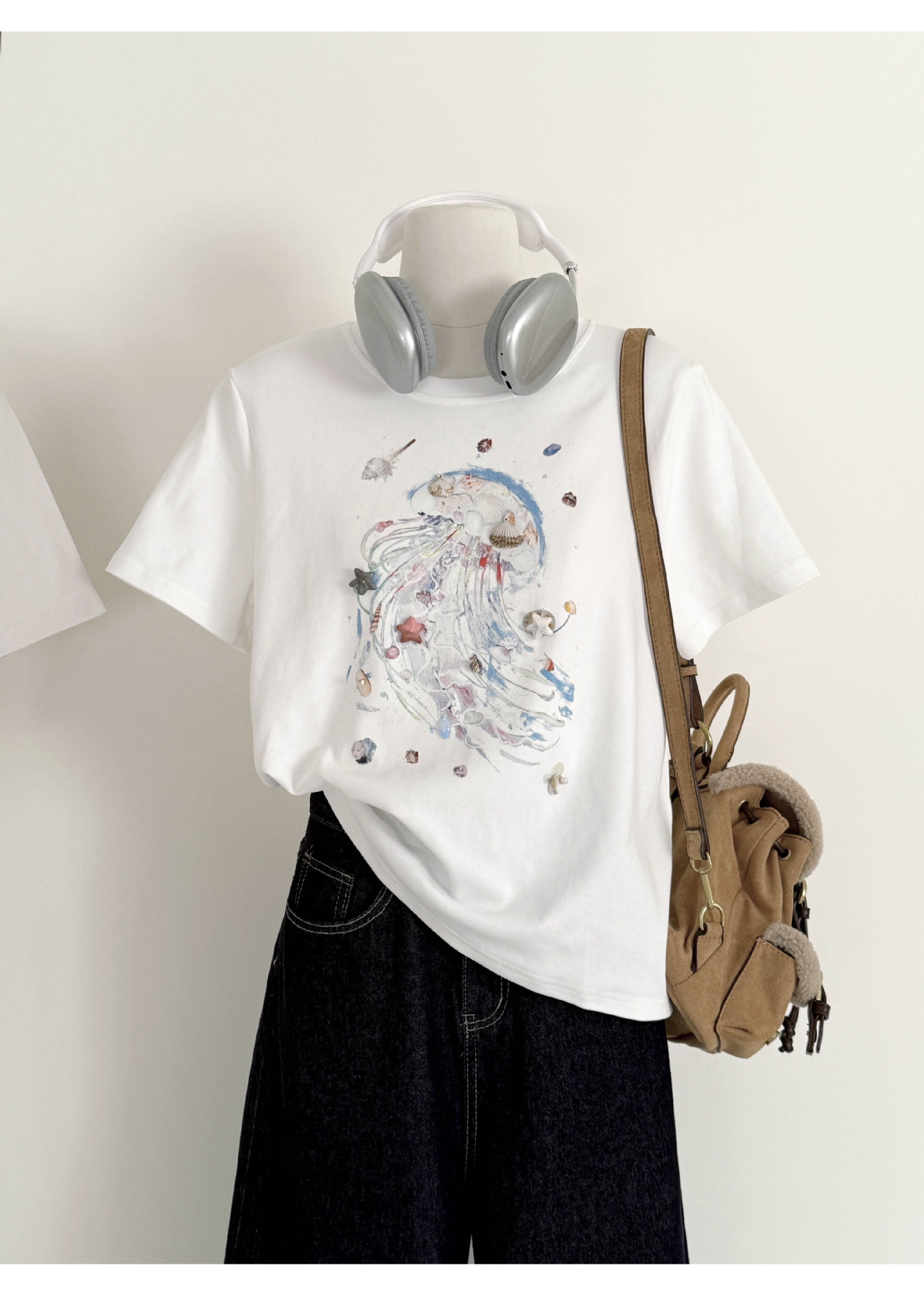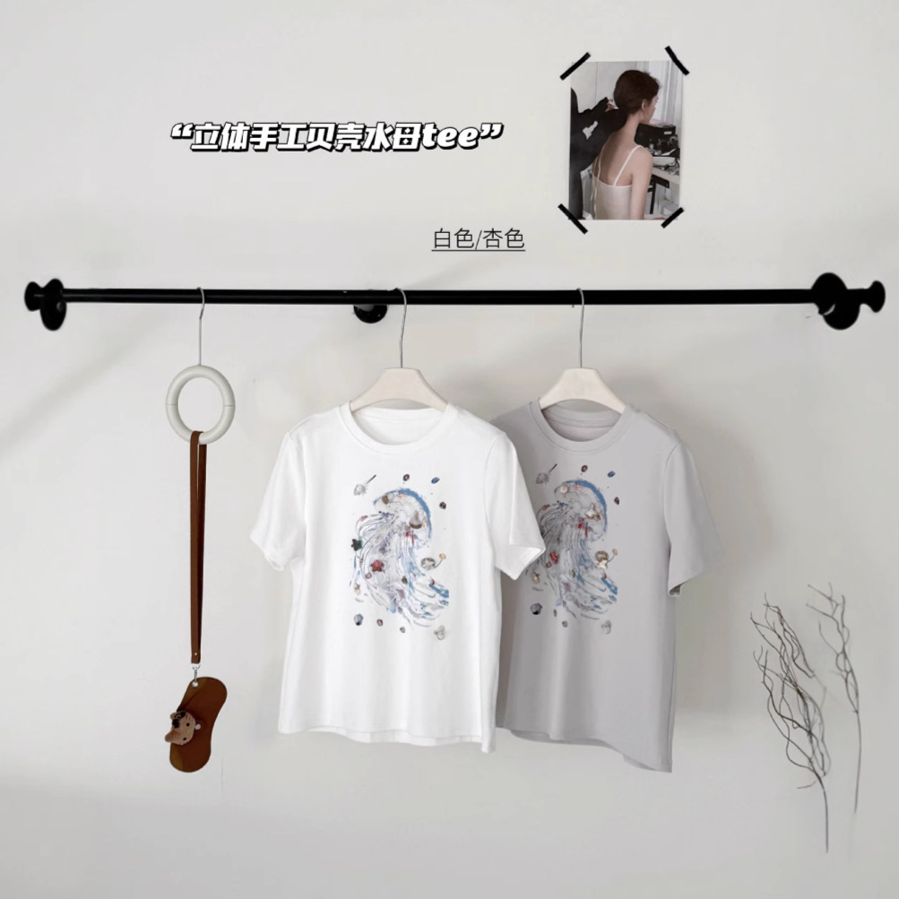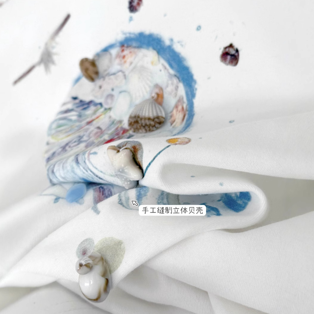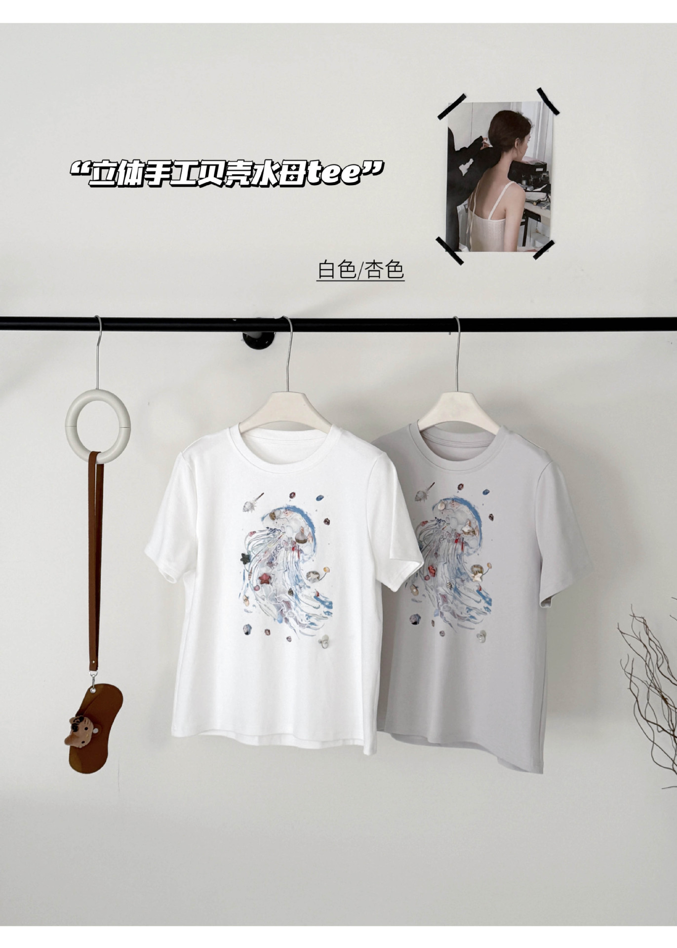 Hers夏季新款韩版甜美贝壳立体印花休闲宽松短袖T恤圆领百搭上衣