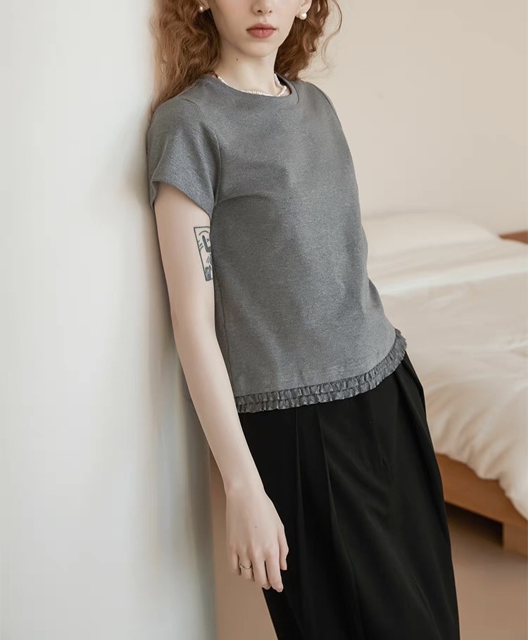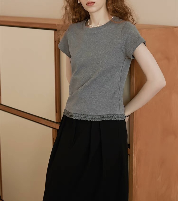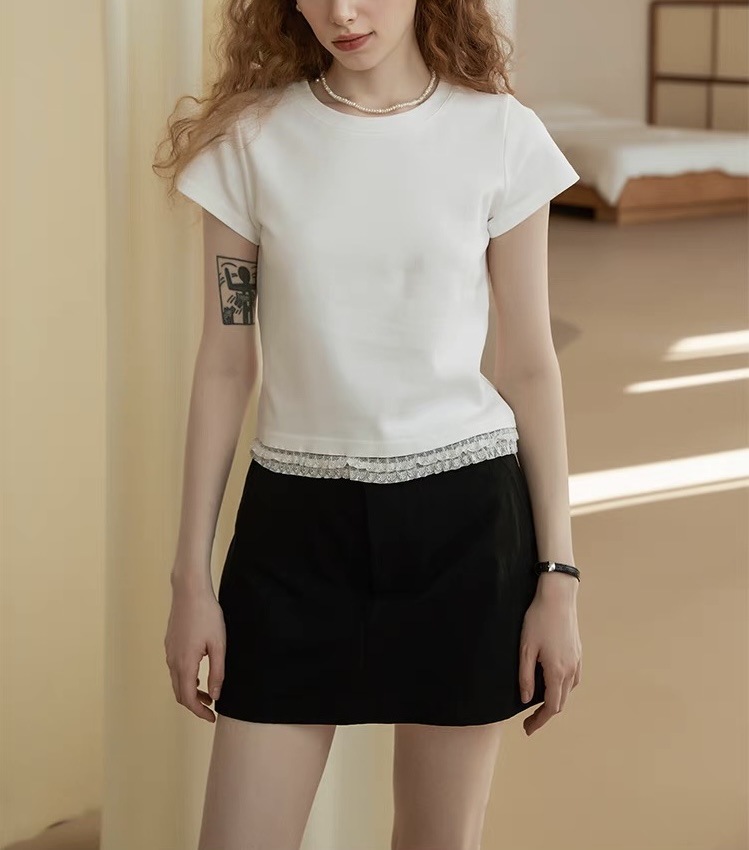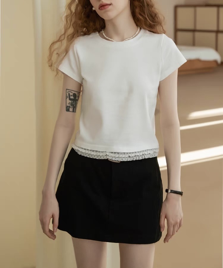 气质蕾丝花边圆领显瘦白色短袖T恤女夏新款甜美正肩百搭别致上衣