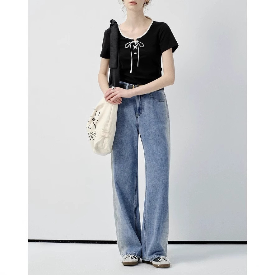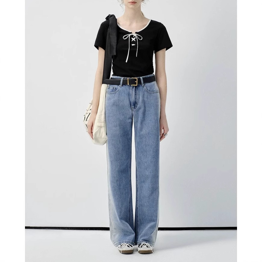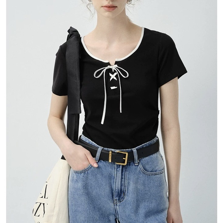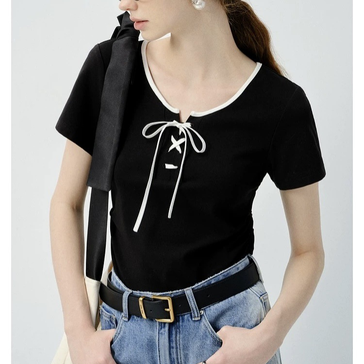 VEGA 短袖T恤女2025新款夏通勤百搭撞色设计蝴蝶结系带上衣