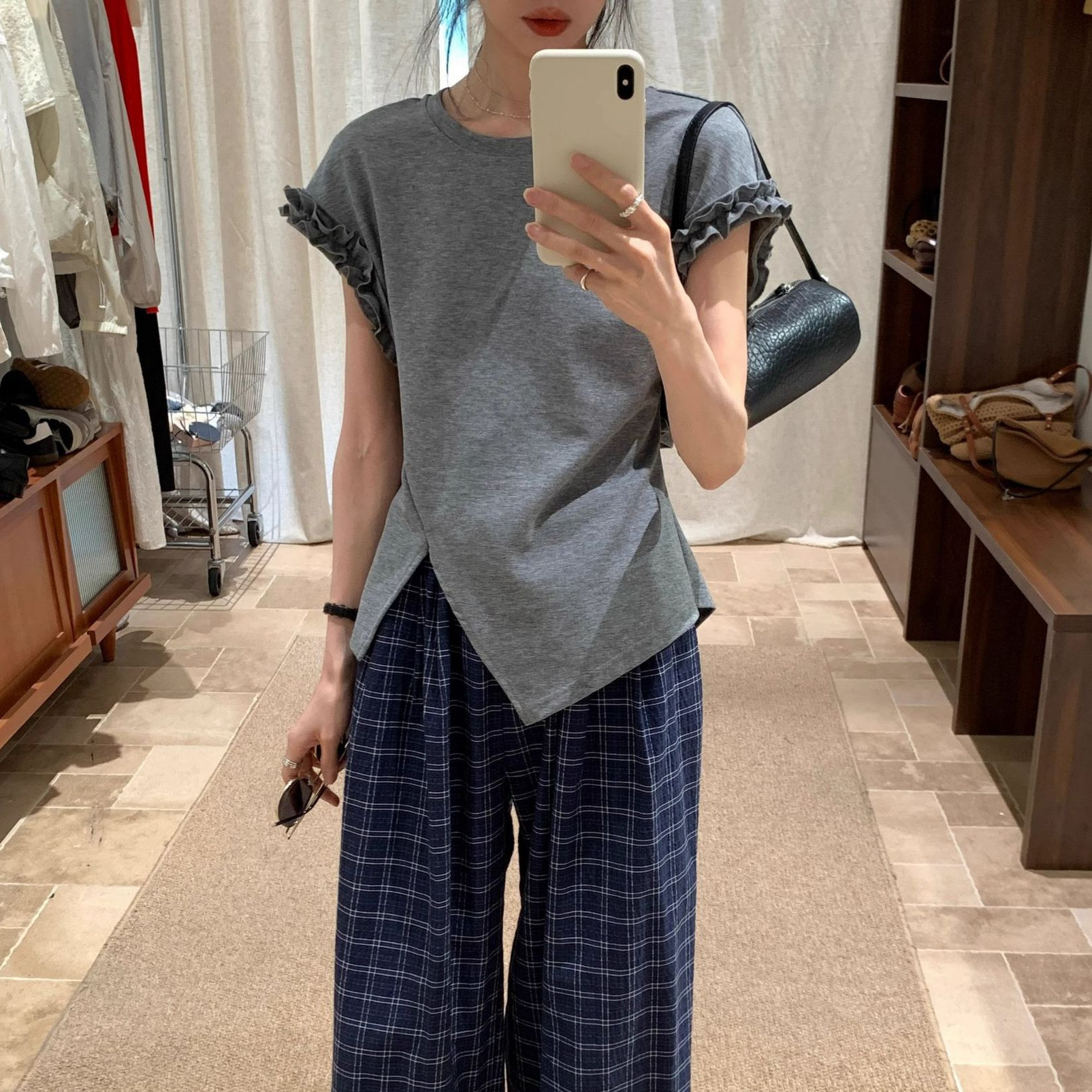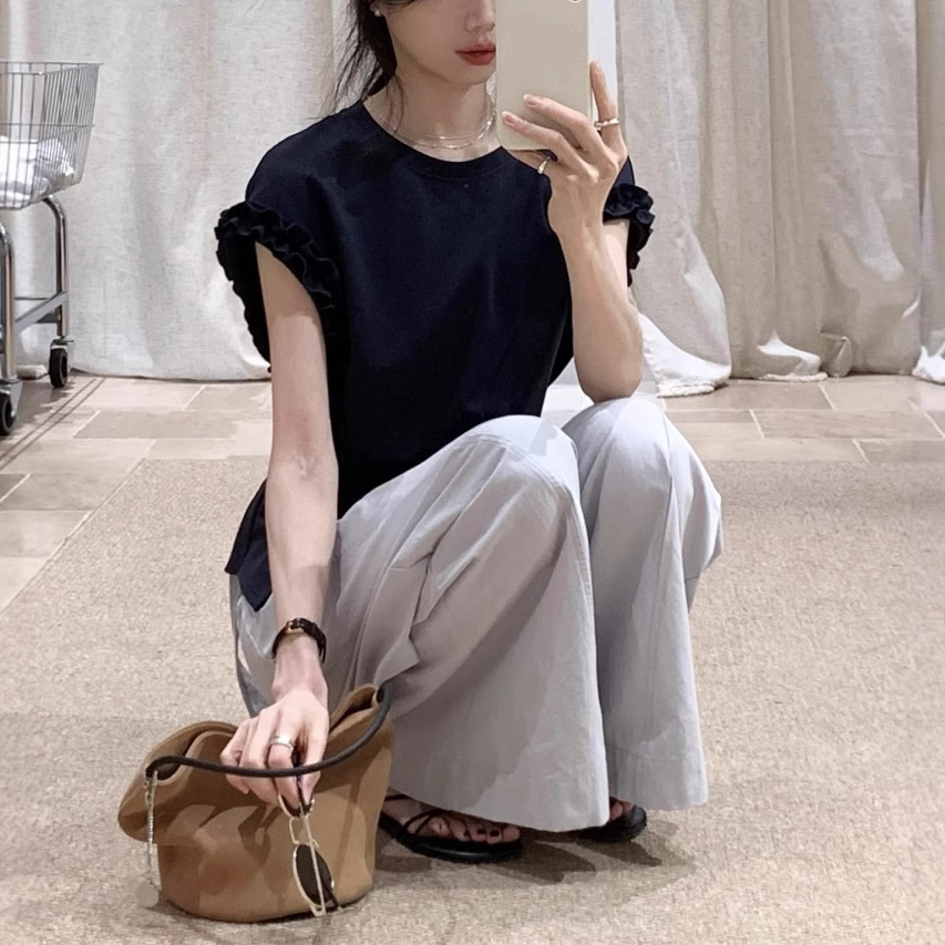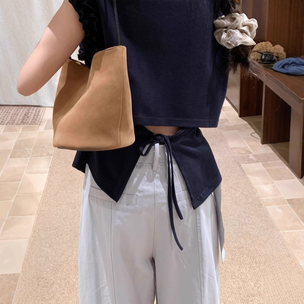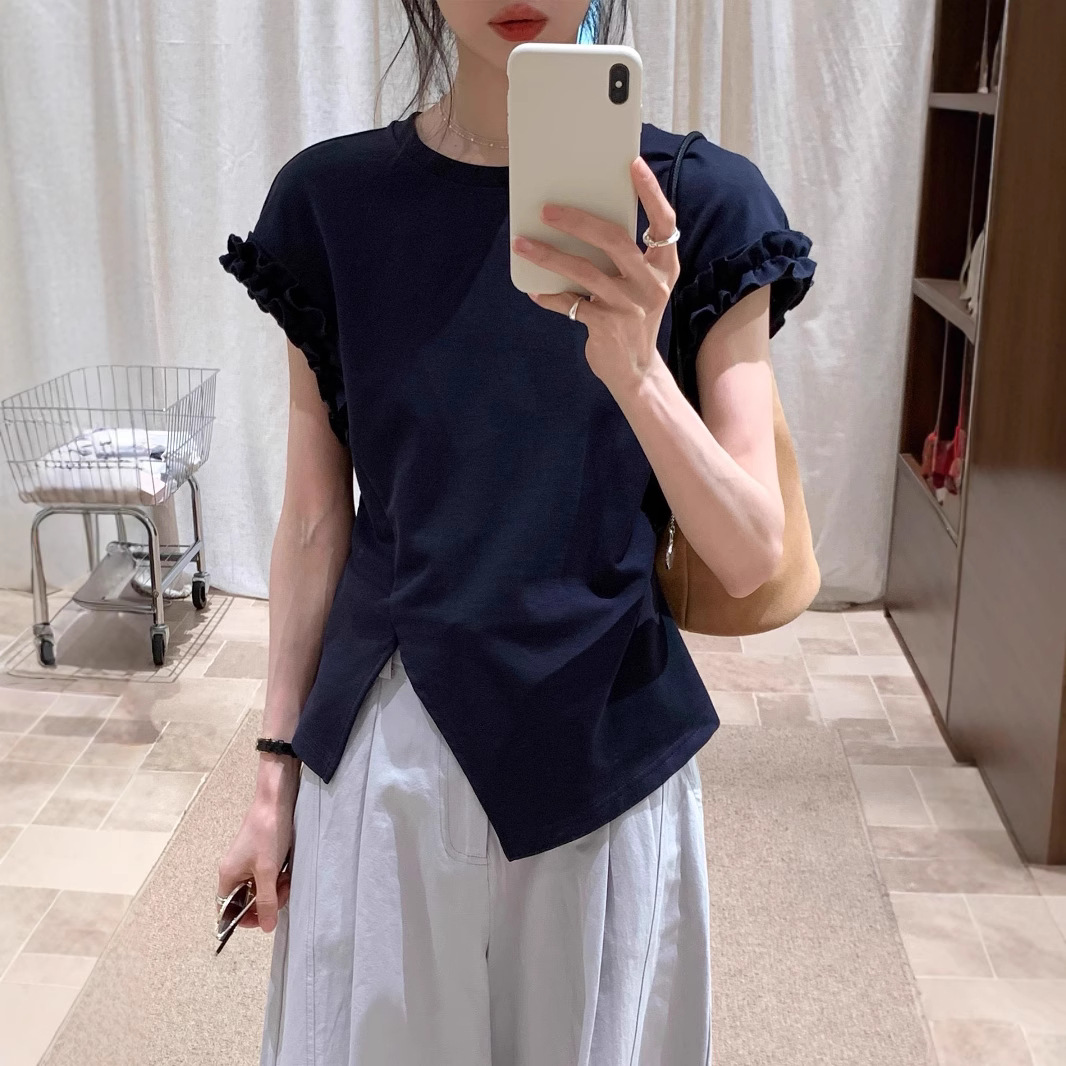 藏青色木耳边后背系绳正肩短袖T恤女2025夏不规则显瘦上衣