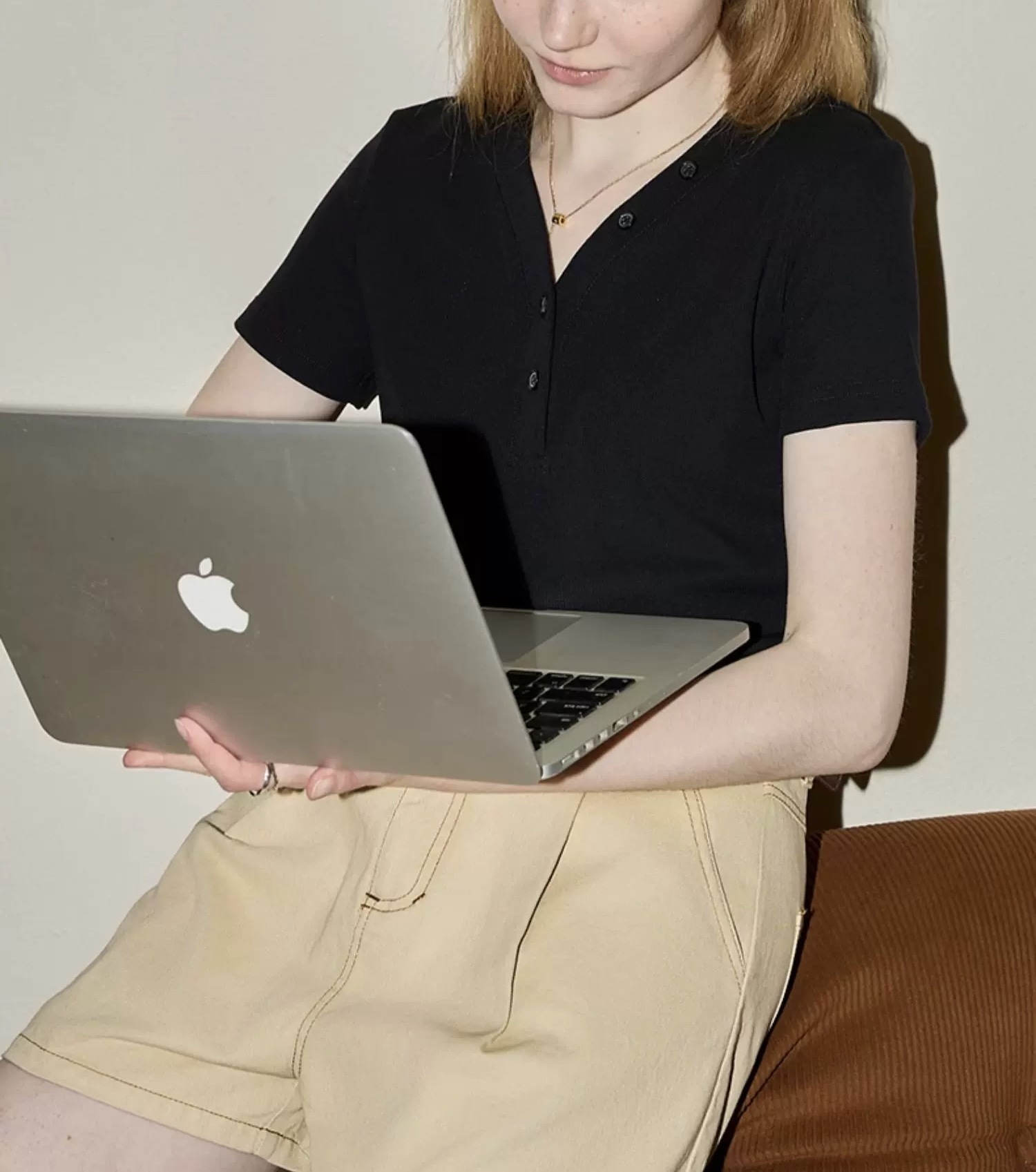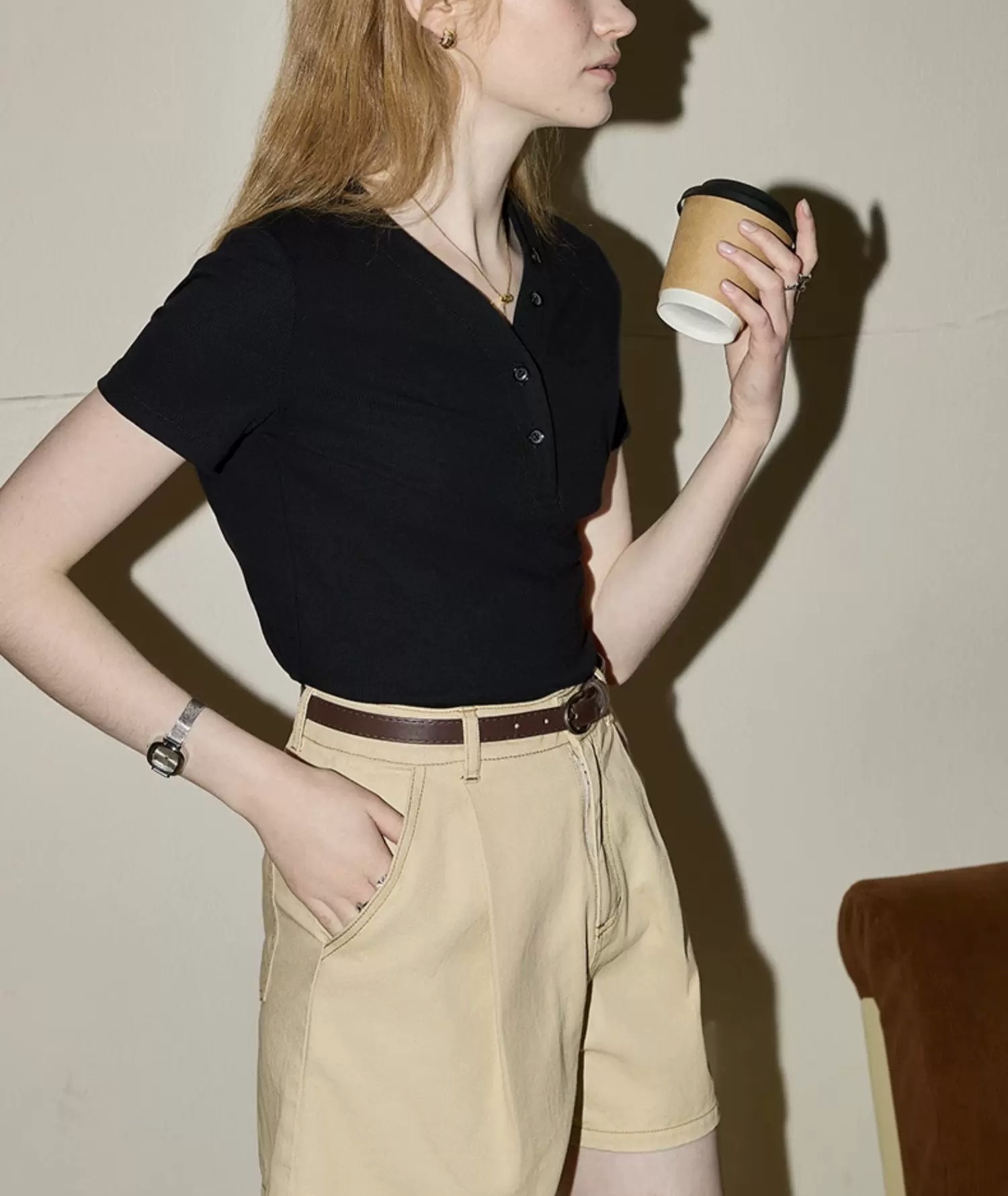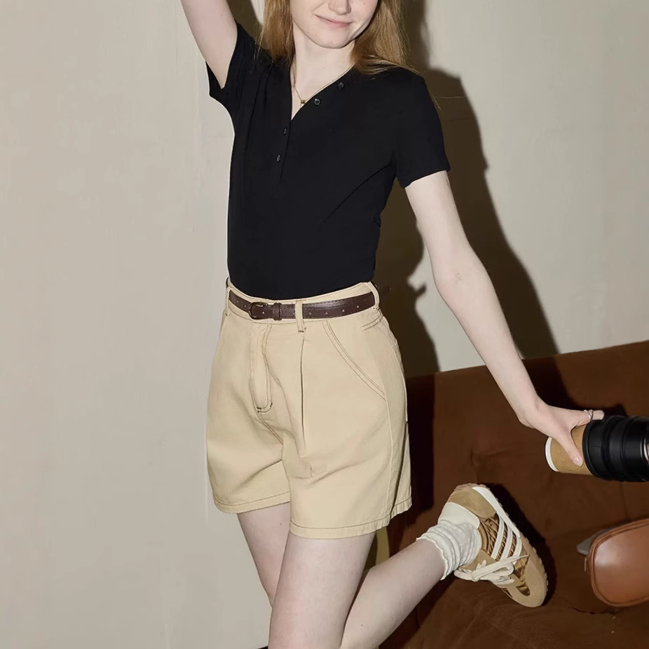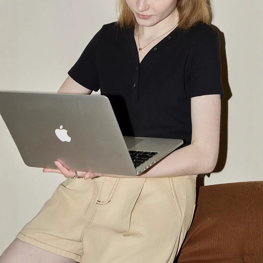 简约V领短袖T恤女2025夏新款修身显瘦显锁骨气质通勤上衣