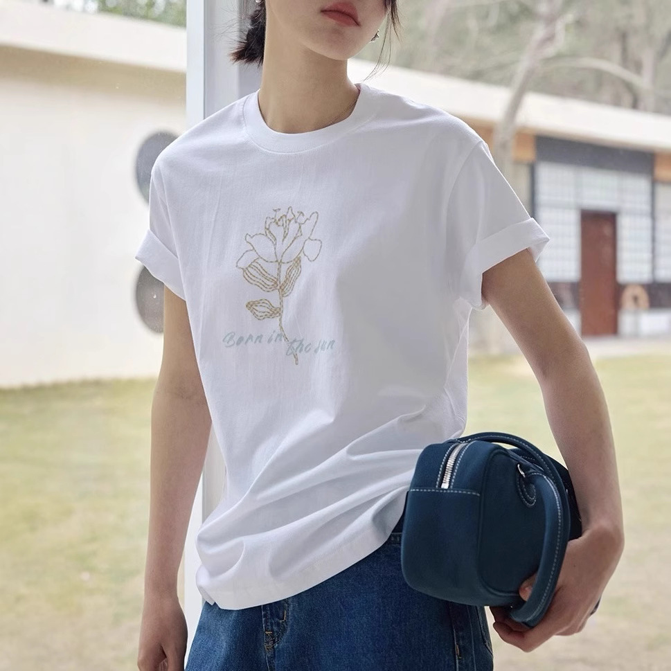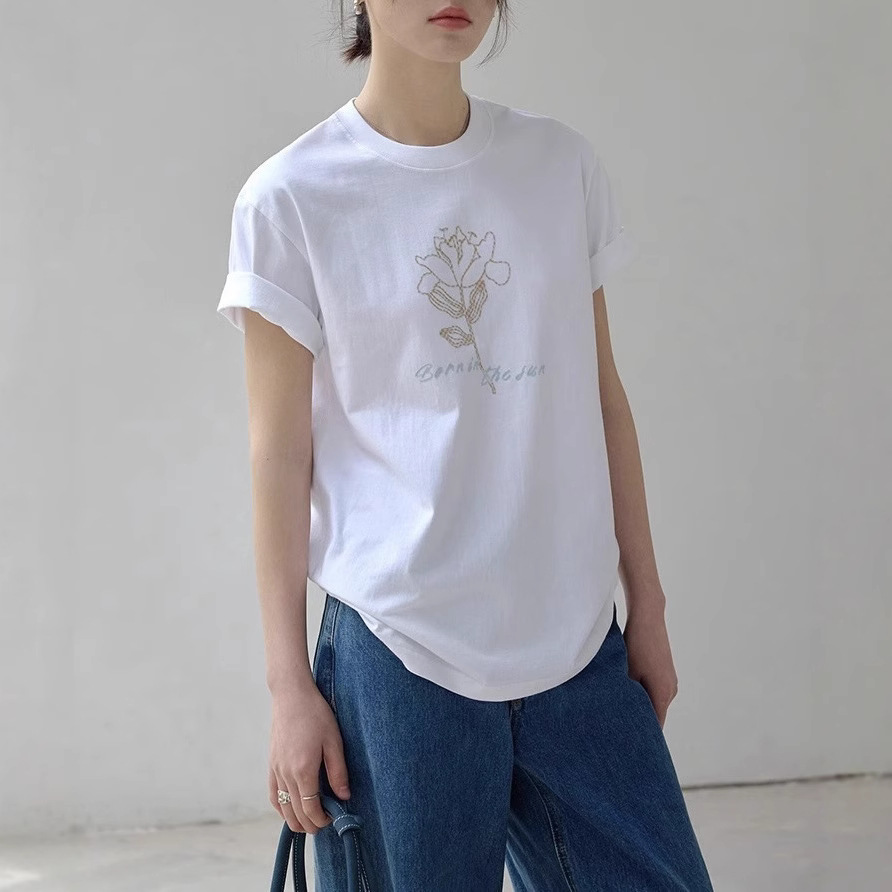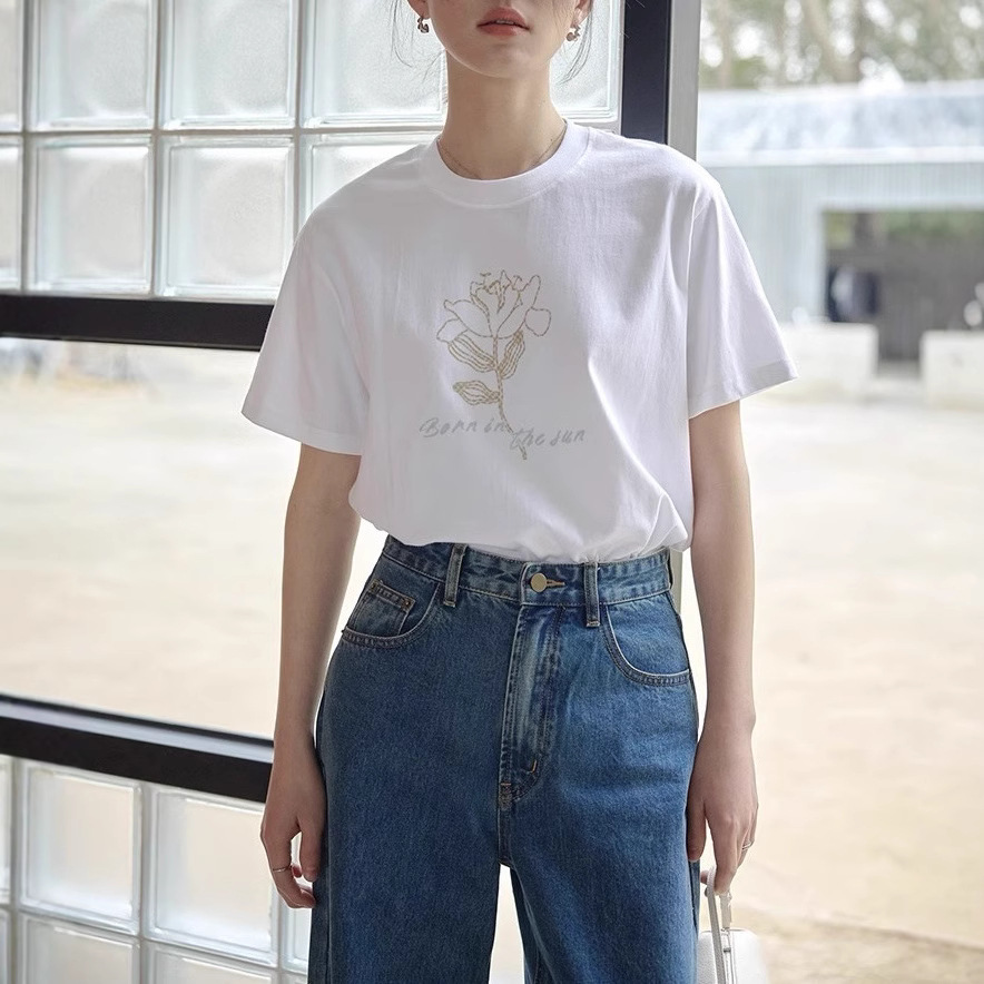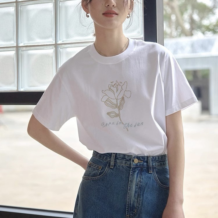 1313春日植绒印花~清新感休闲白色短袖女春夏宽松透气上衣T恤
