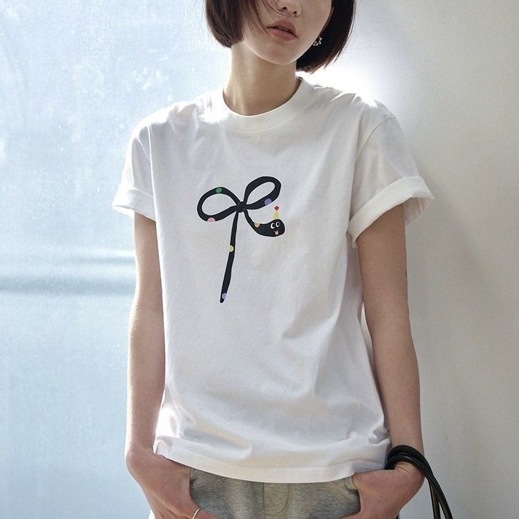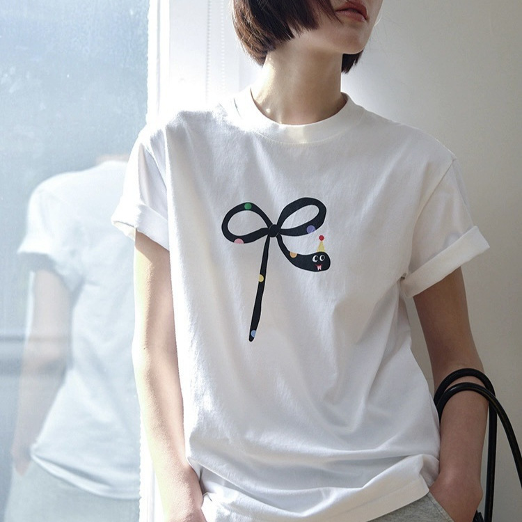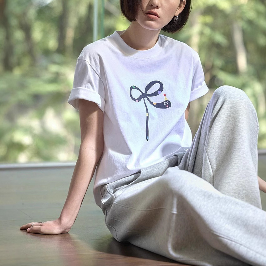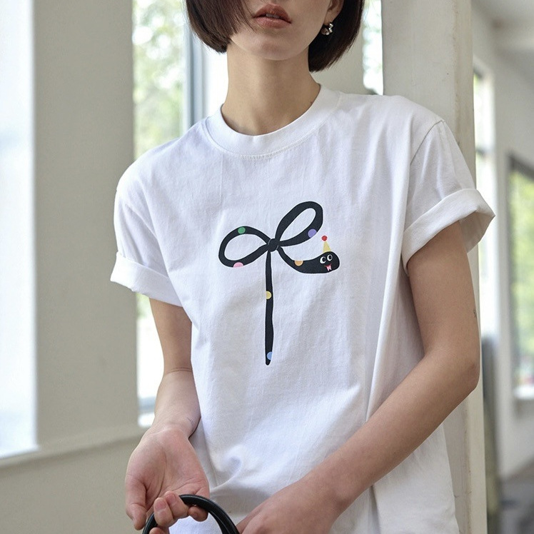 1313新春本命年蝴蝶结小蛇印花白色女内搭简约宽松休闲短袖棉T恤