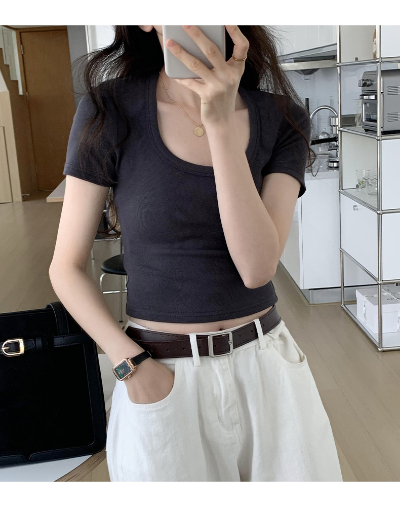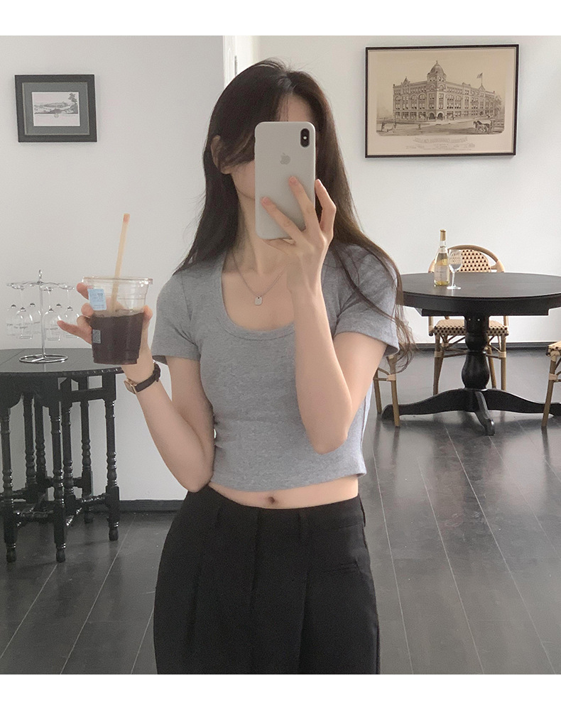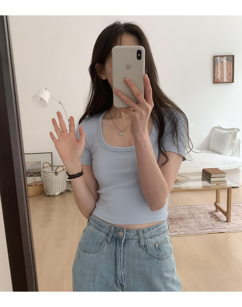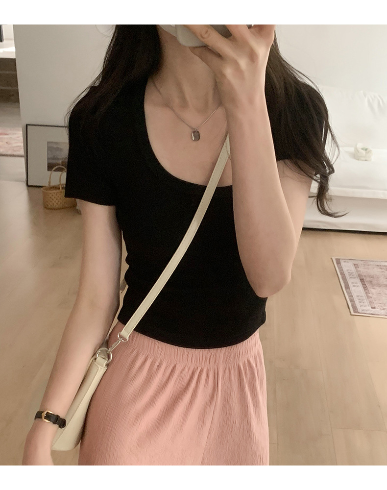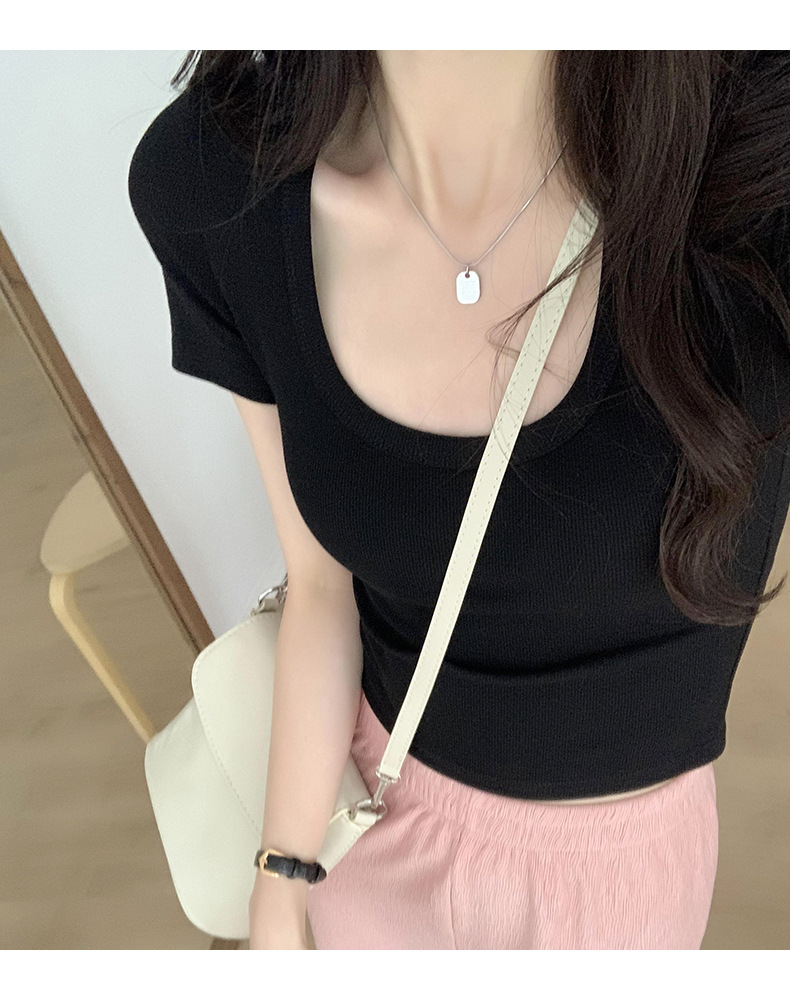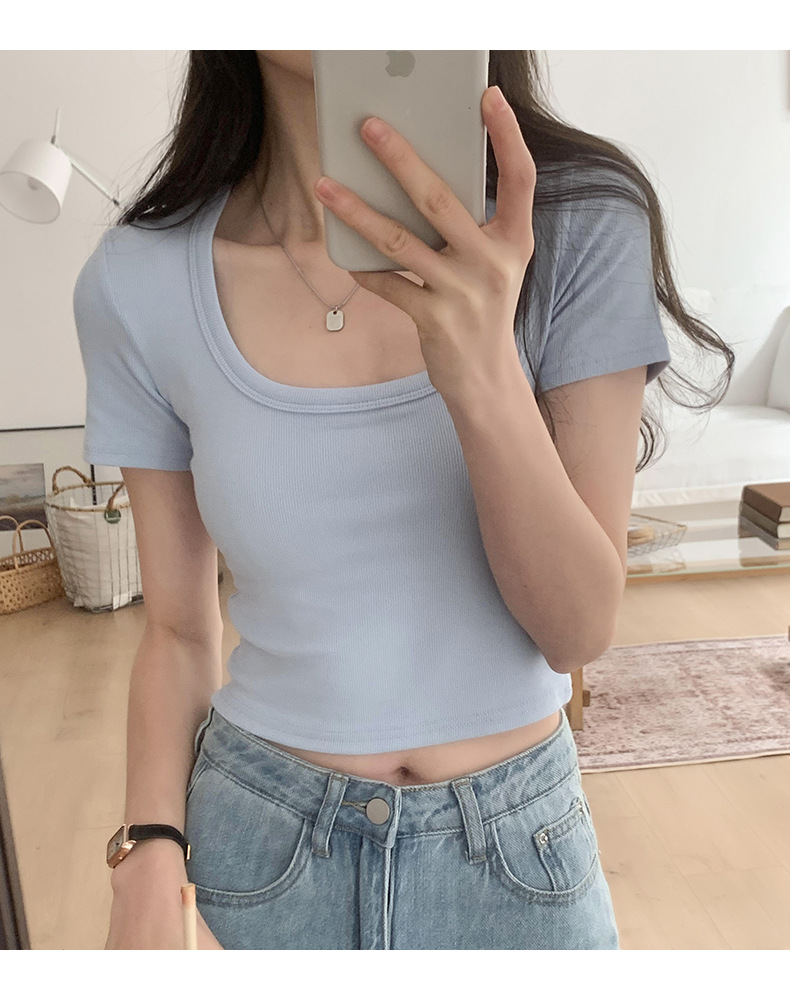 纯欲辣妹性感U领锁骨短款露脐别致上衣紧身弹力短袖t恤女夏
