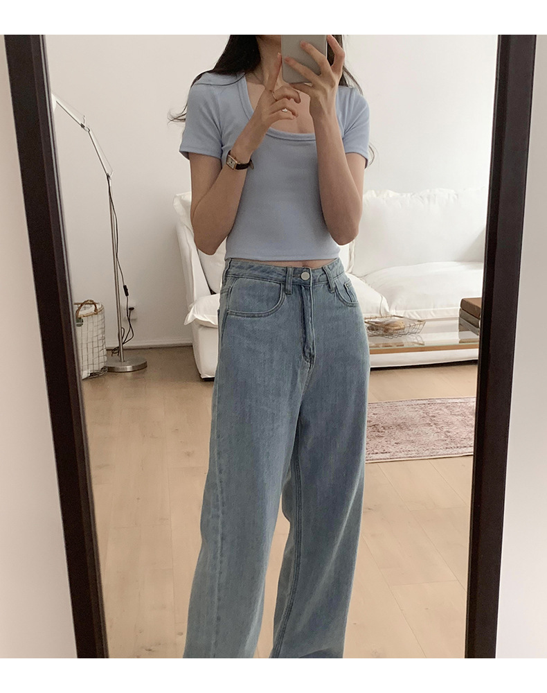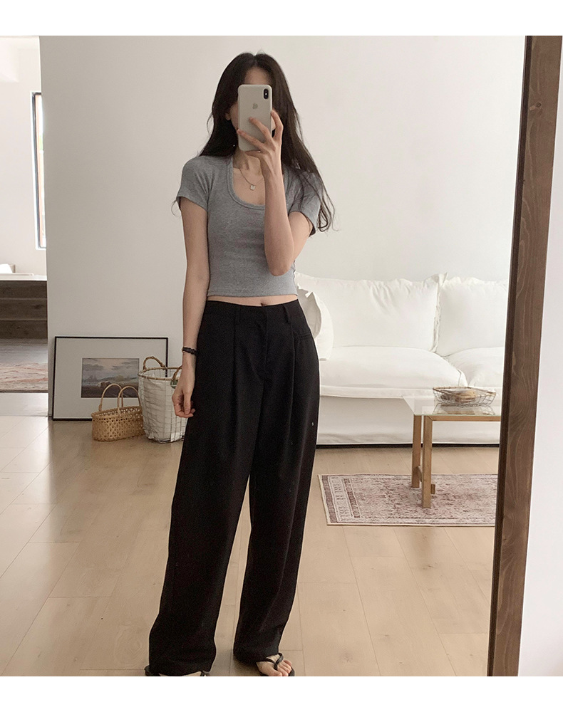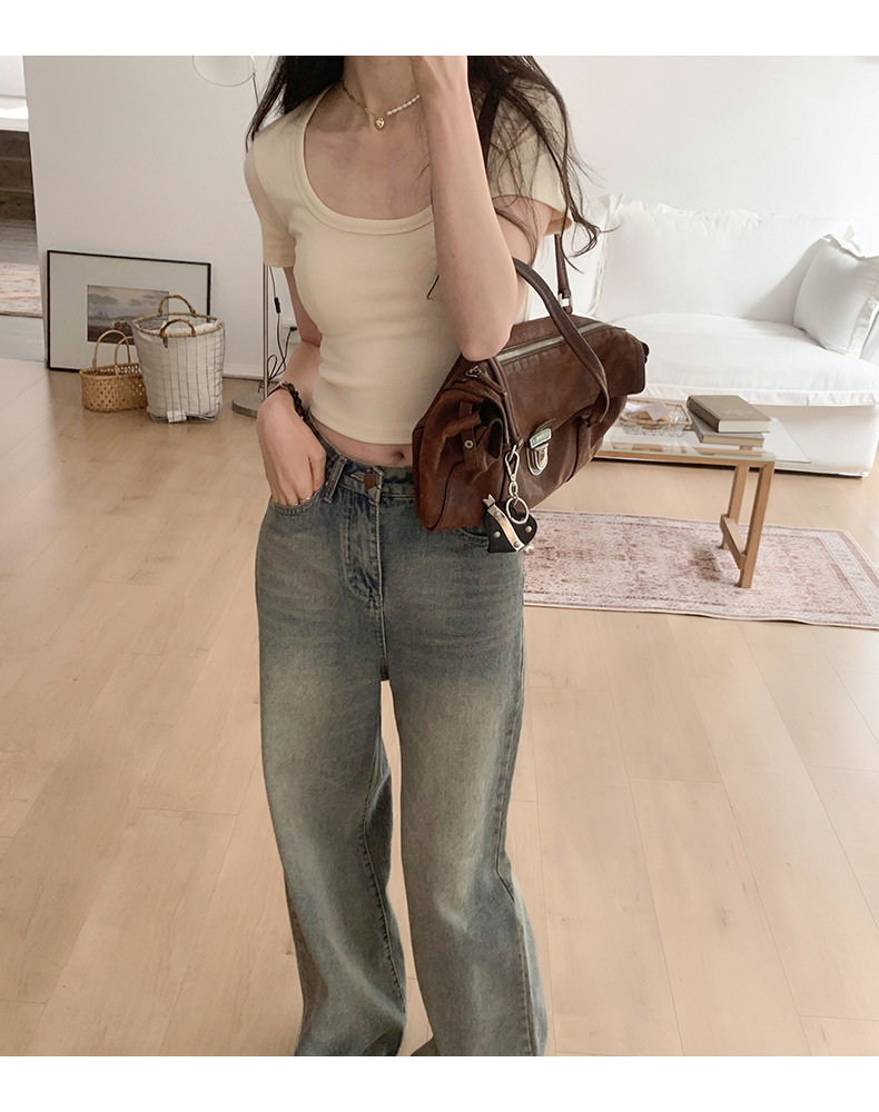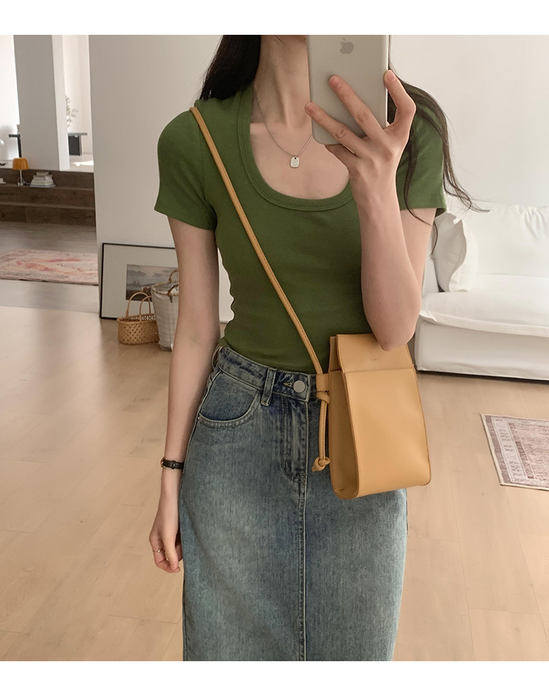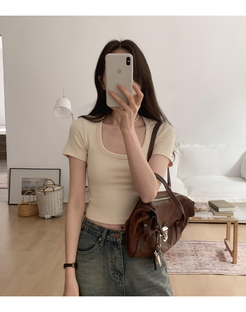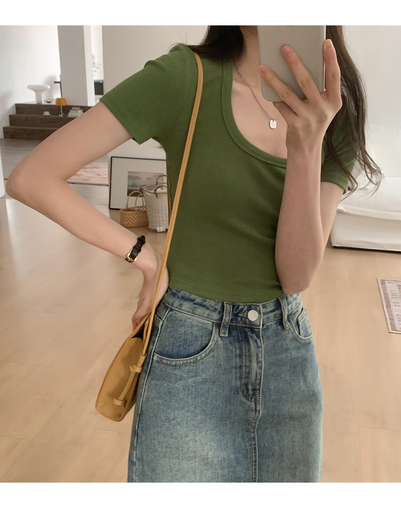 纯欲辣妹性感U领锁骨短款露脐别致上衣紧身弹力短袖t恤女夏