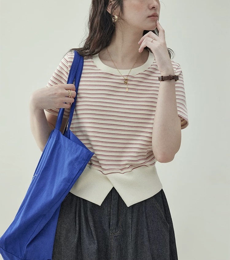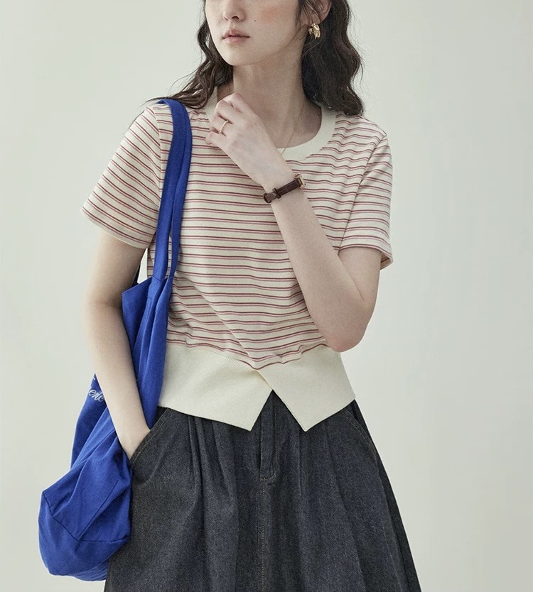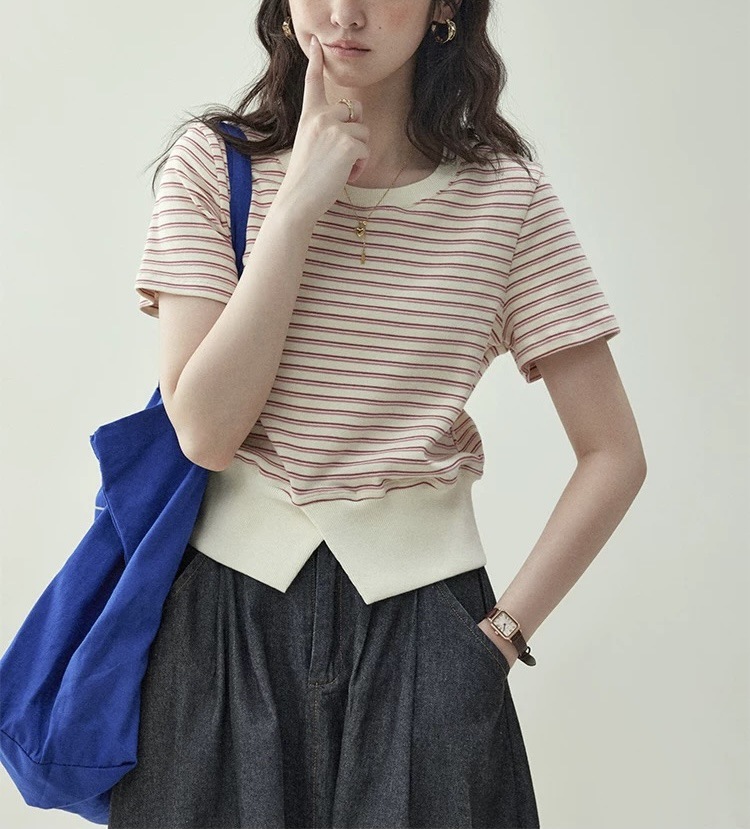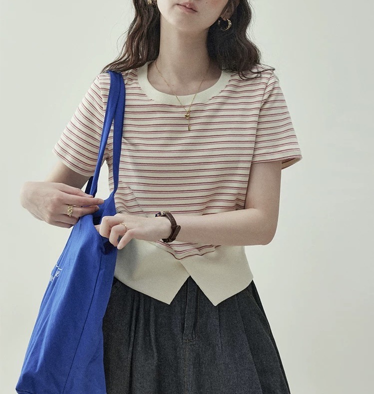 「北岛」甜美红条纹收腰短款t恤女夏季新款开叉短袖上衣