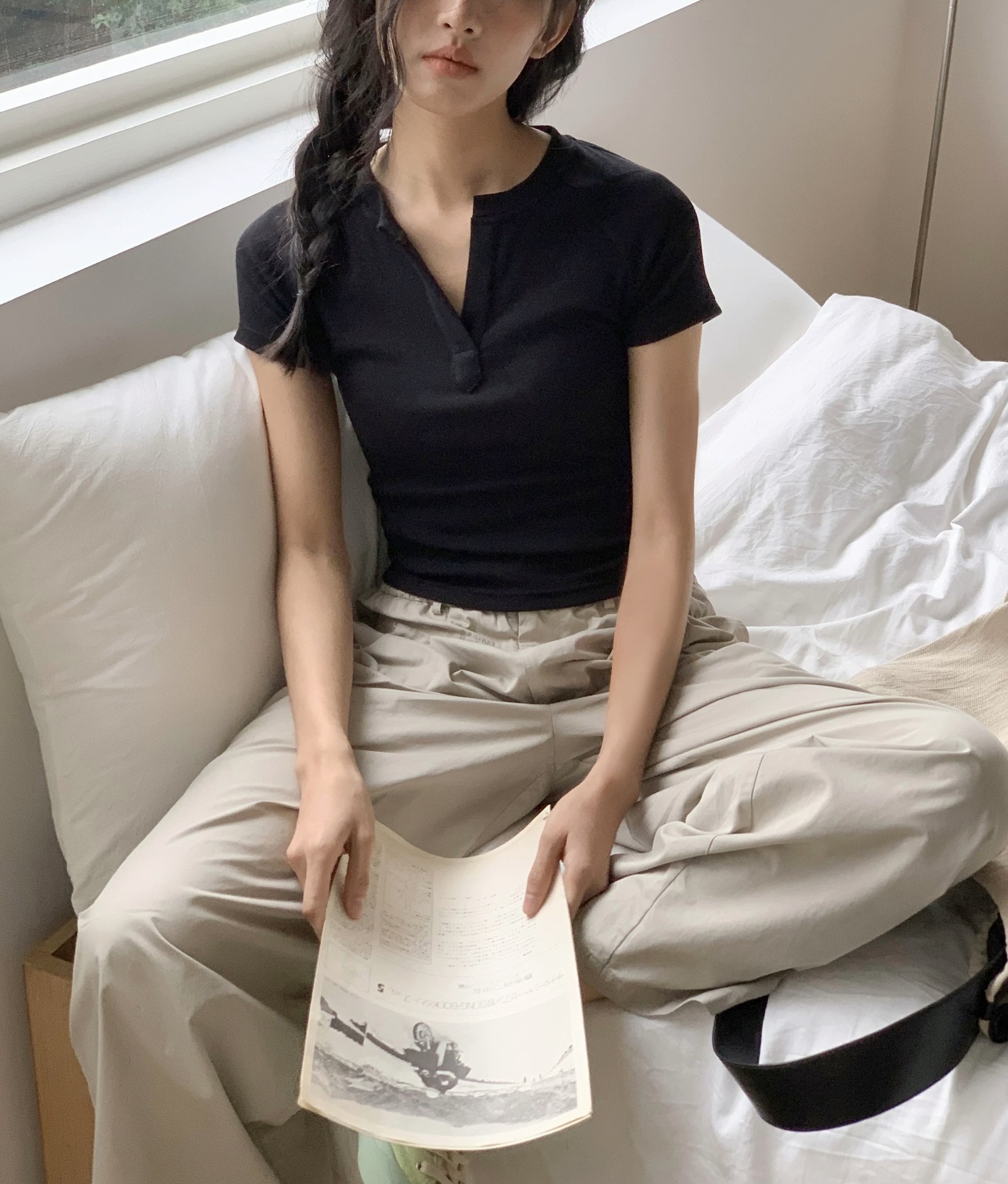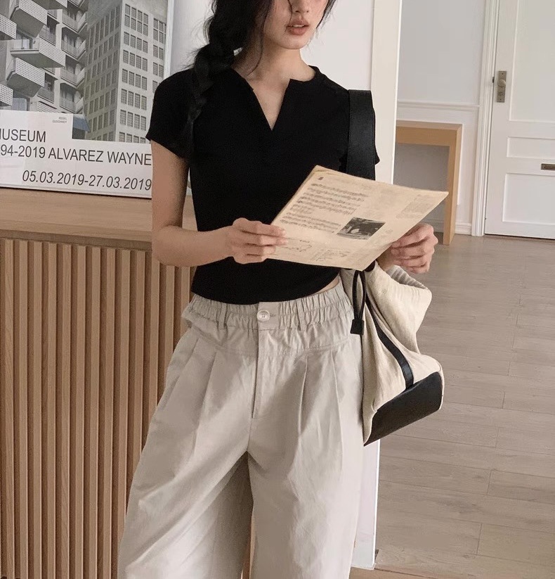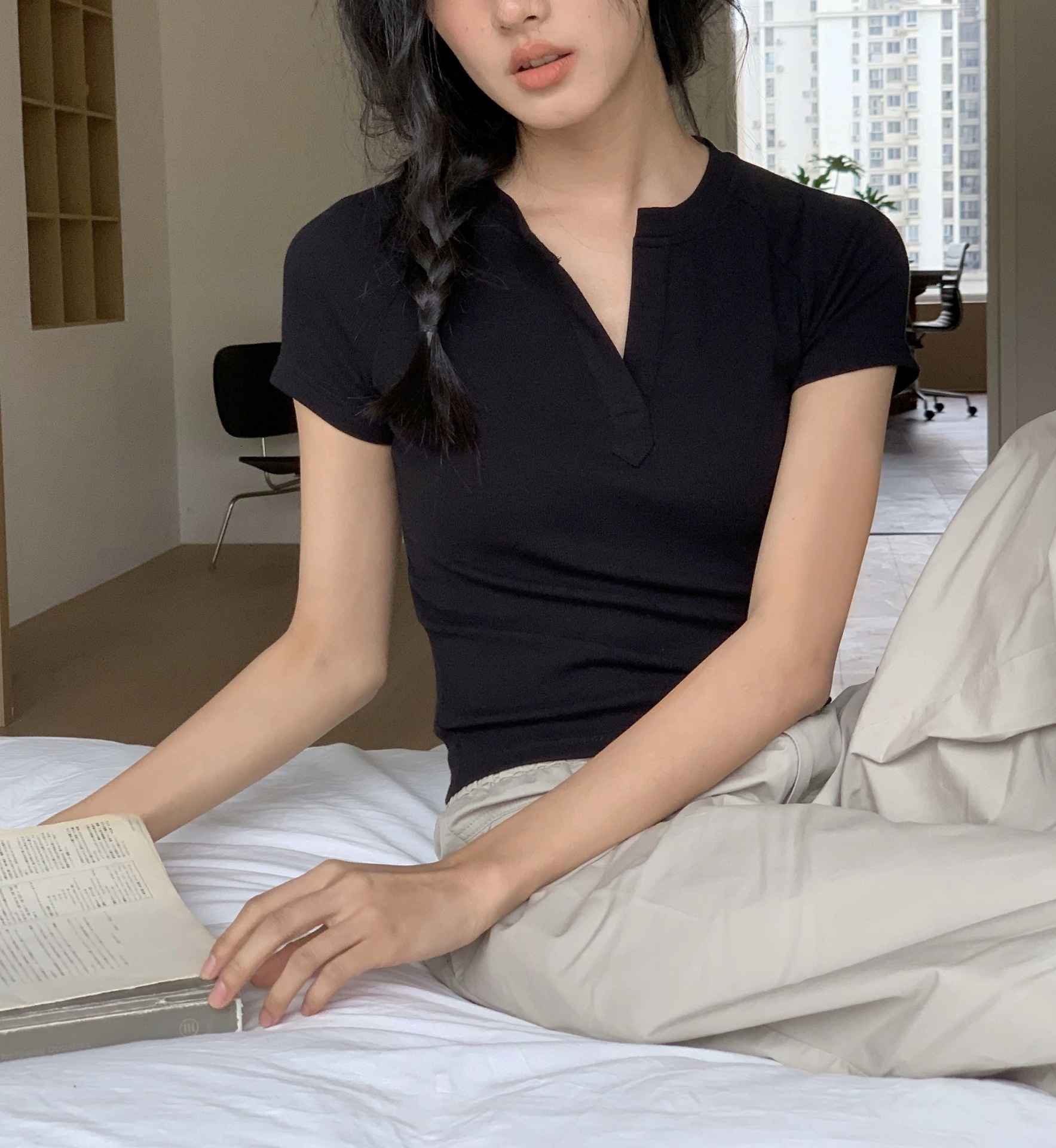 黑色v领辣妹紧身短袖t恤女夏季新款休闲正肩短款上衣