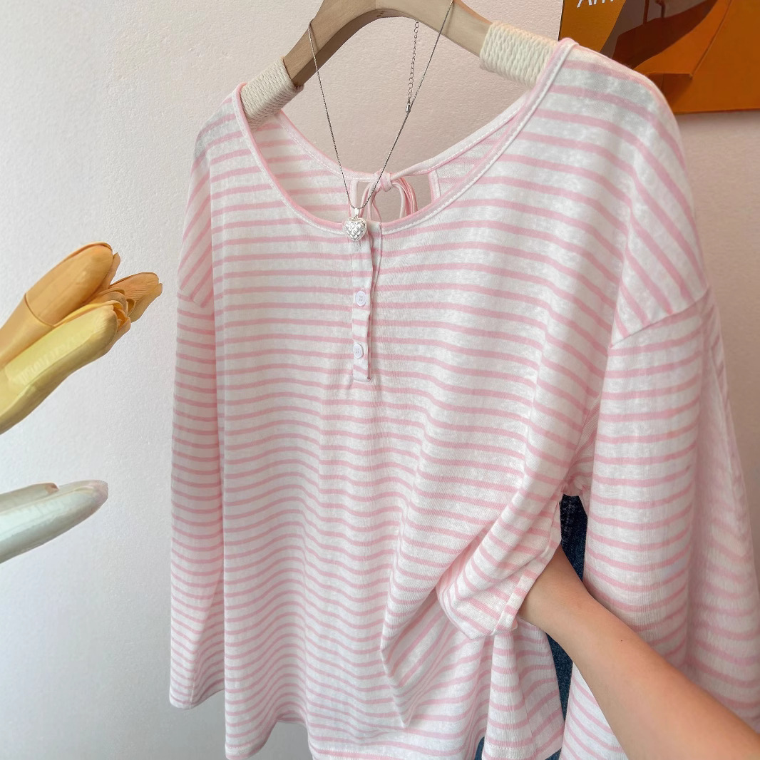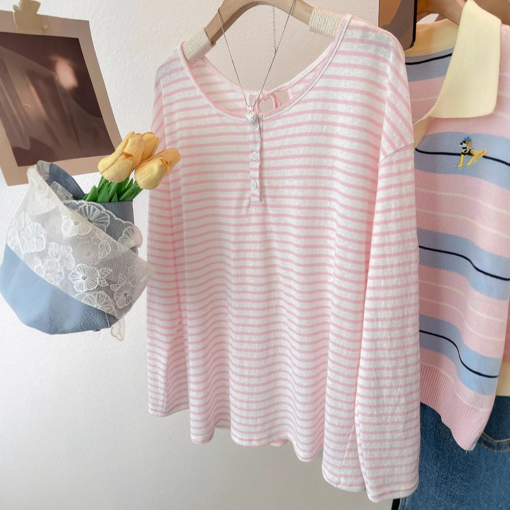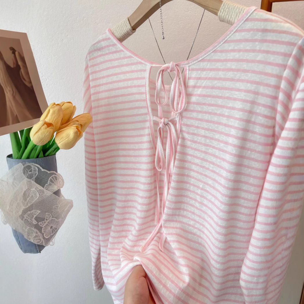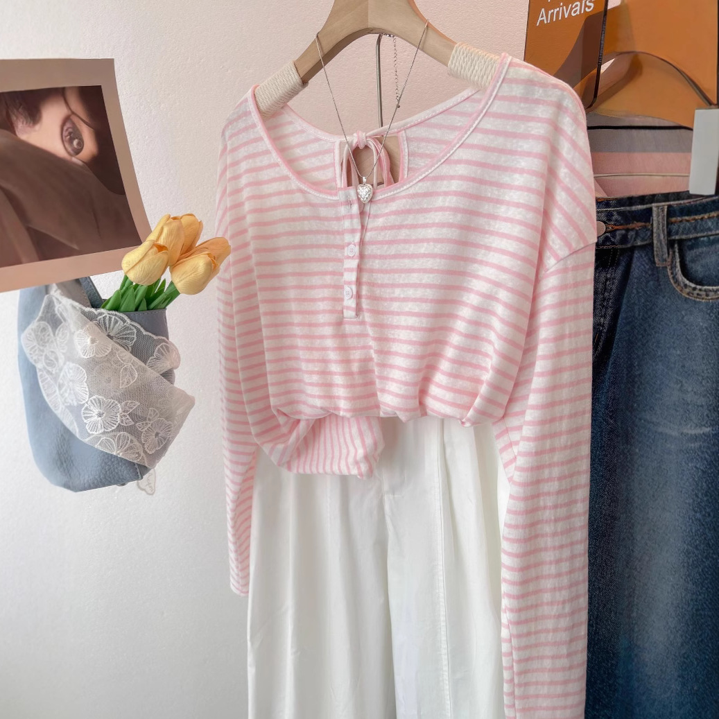 粉色条纹吊带外搭上衣女夏长袖t恤薄