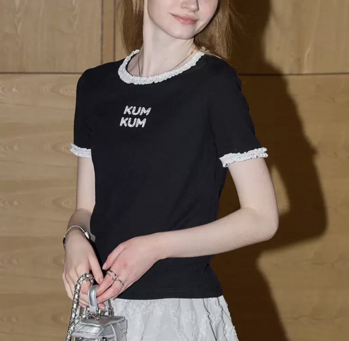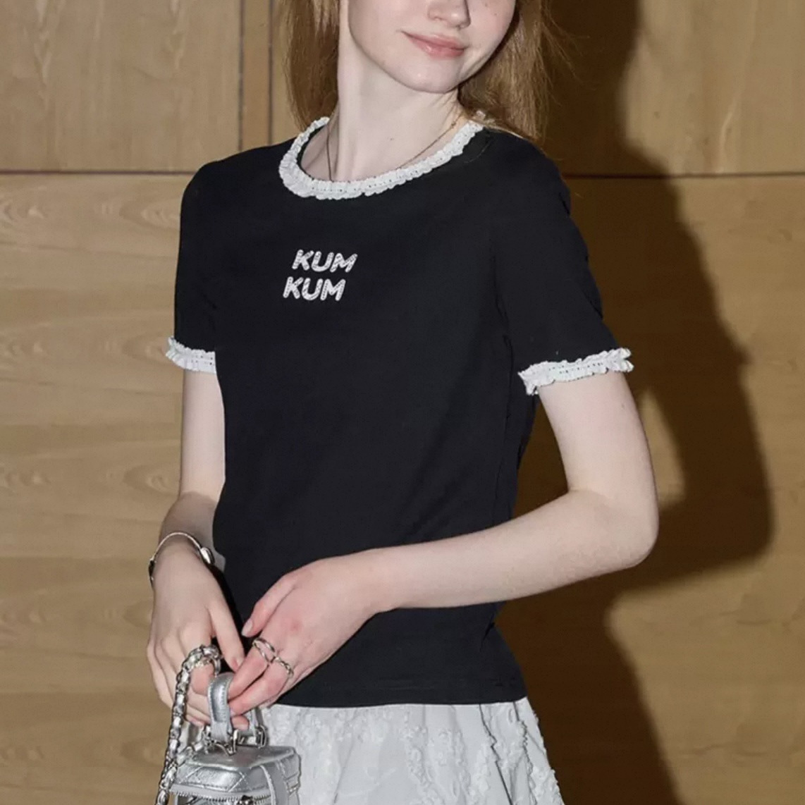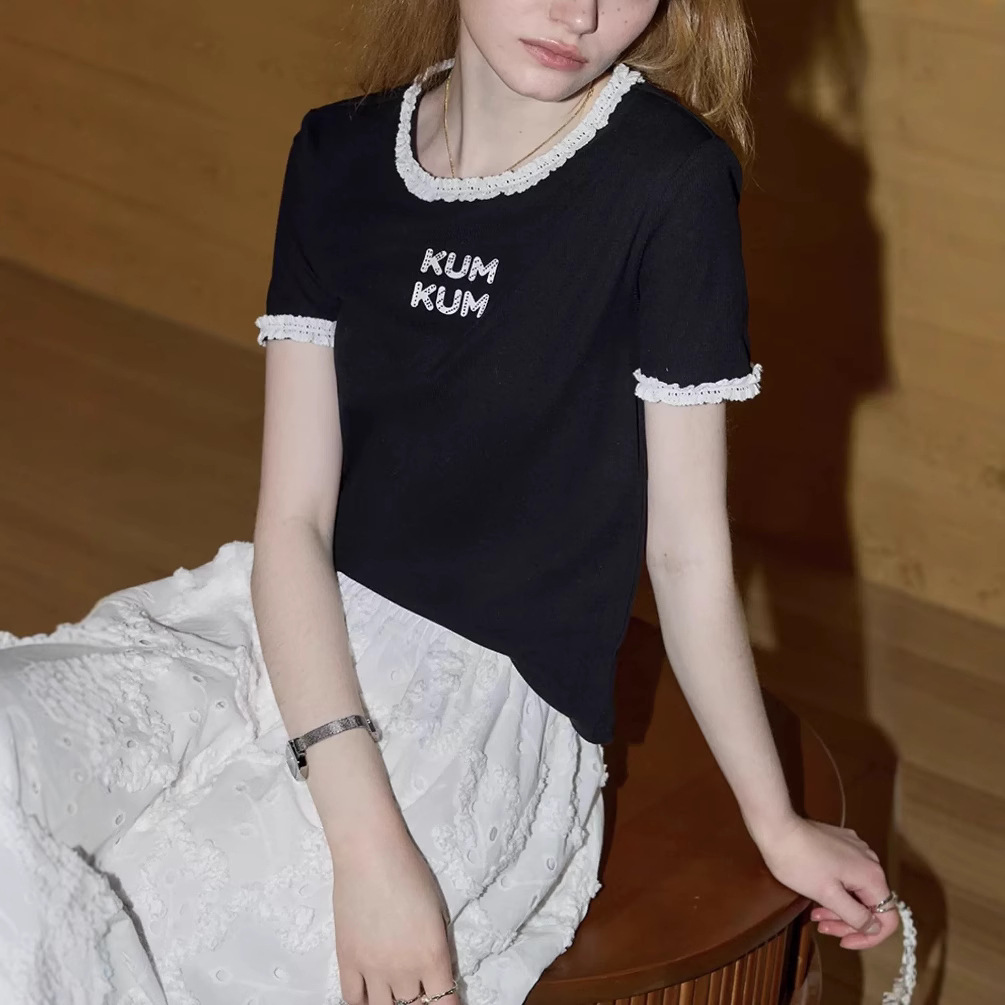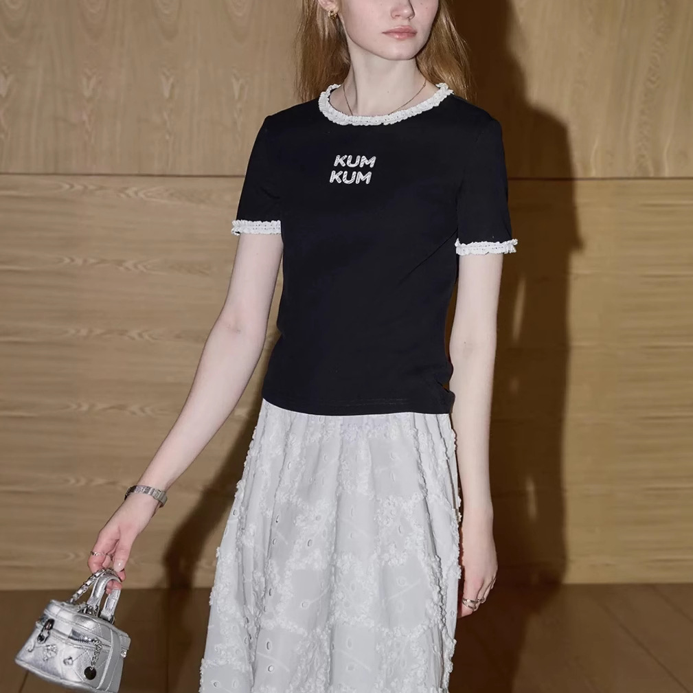 甜辣少女风花边拼接短袖T恤女2025年夏新款修身短款上衣
