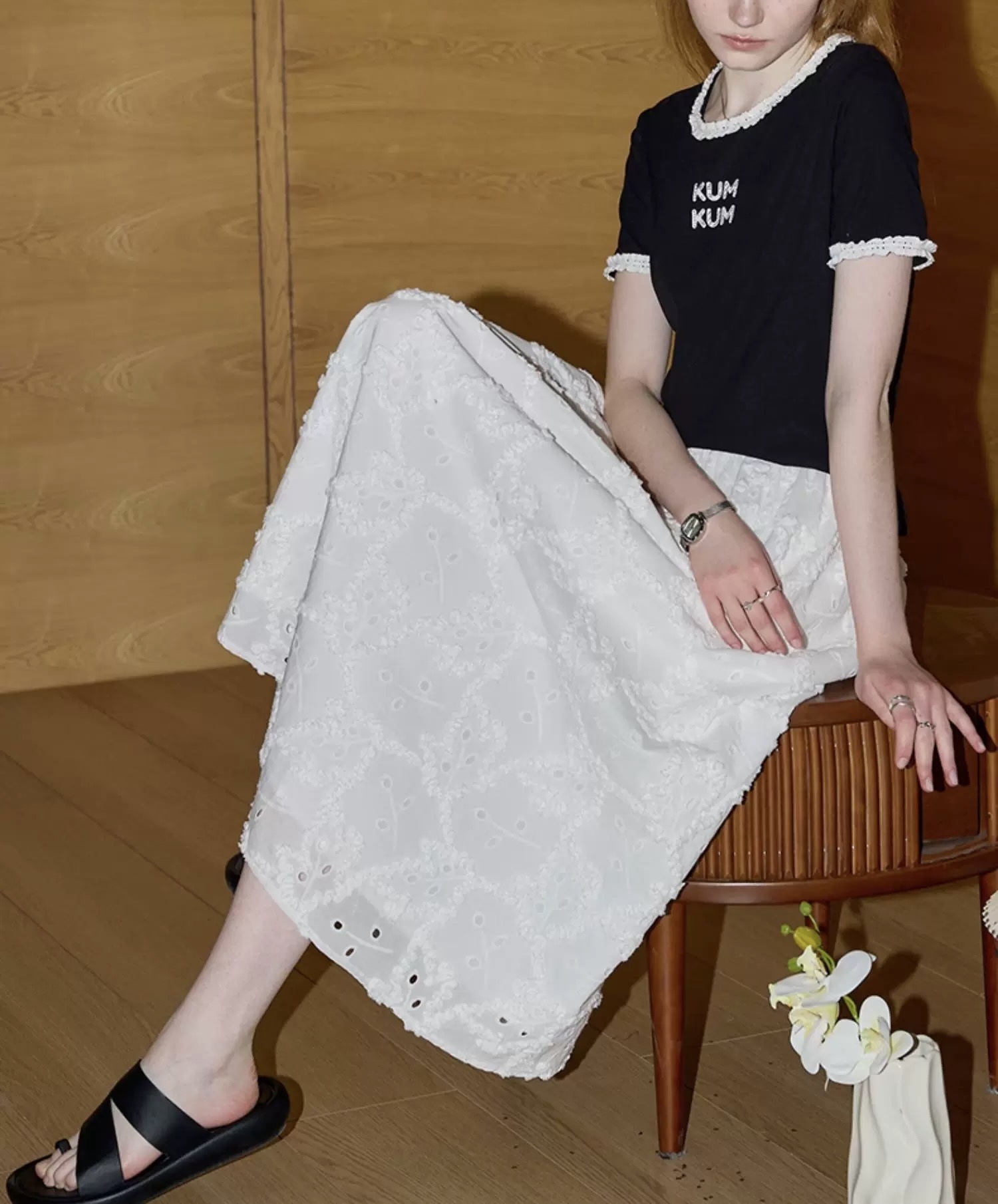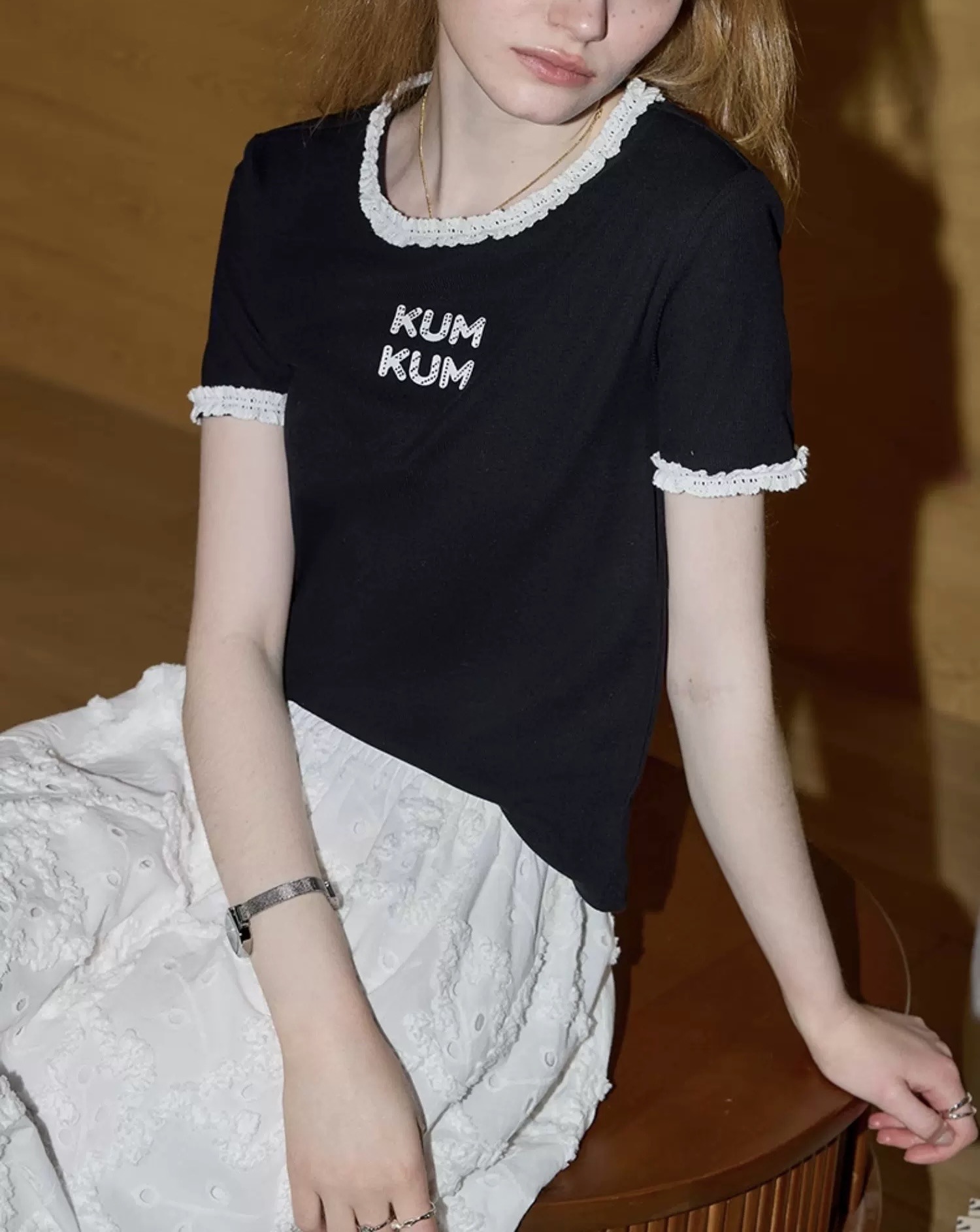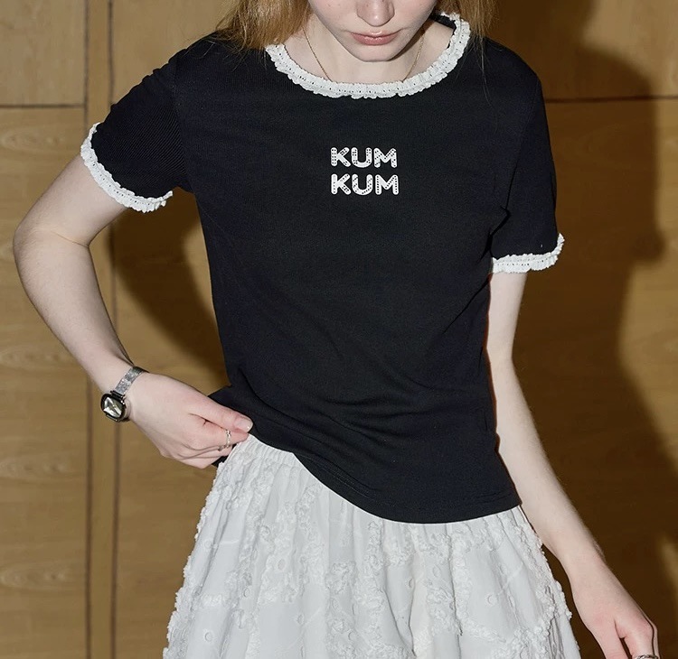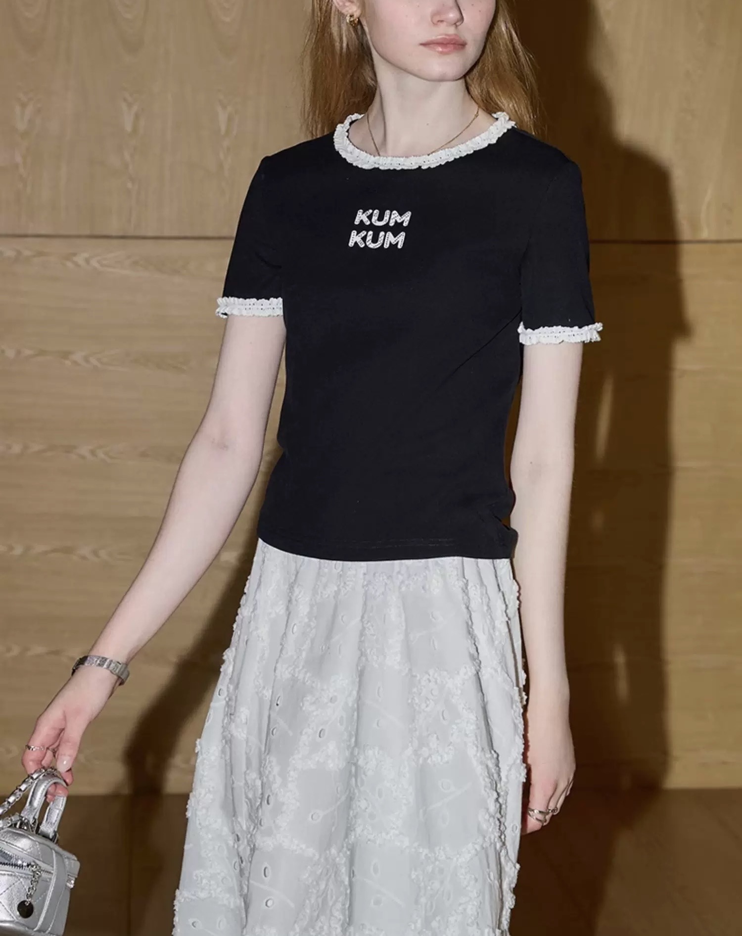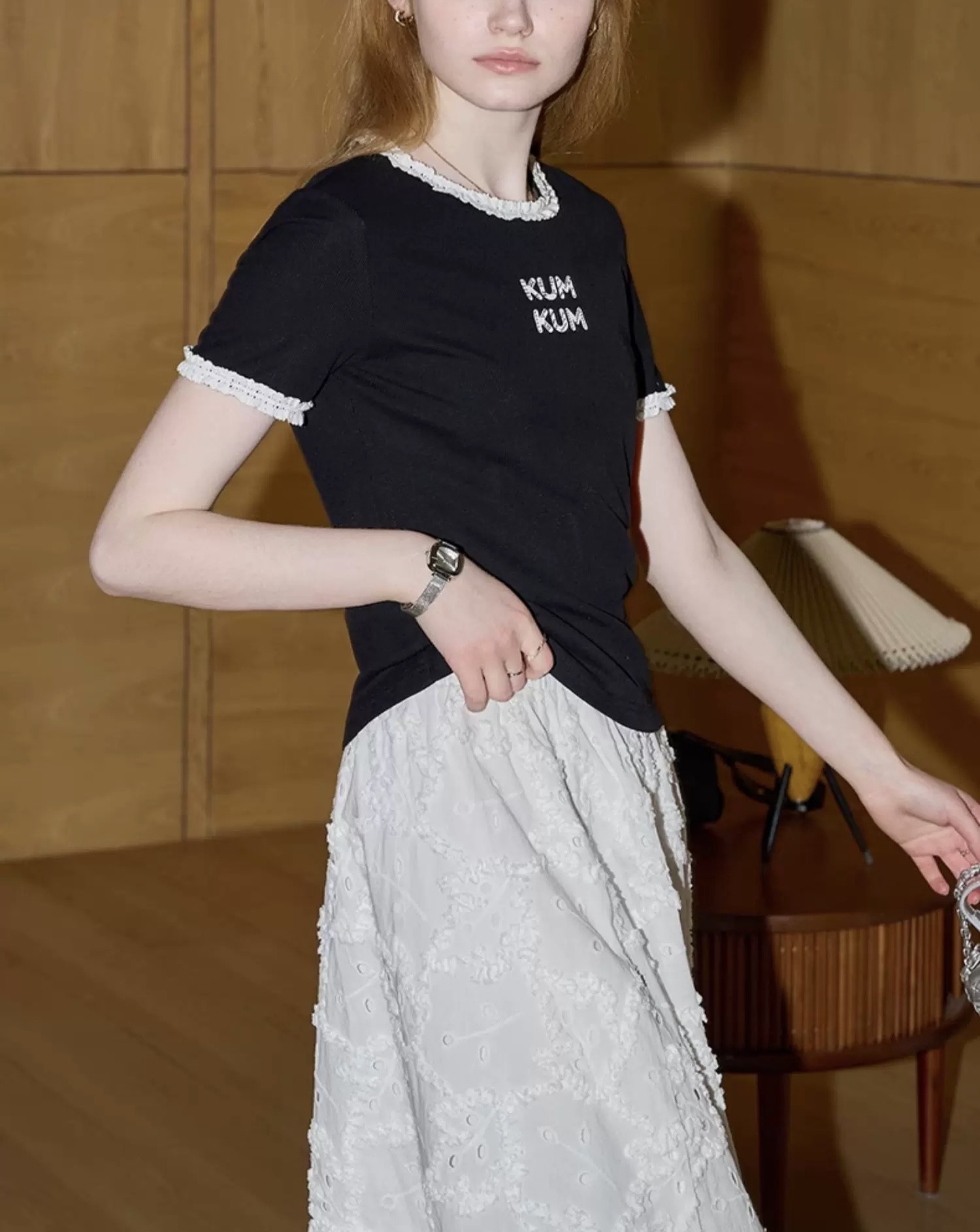 甜辣少女风花边拼接短袖T恤女2025年夏新款修身短款上衣