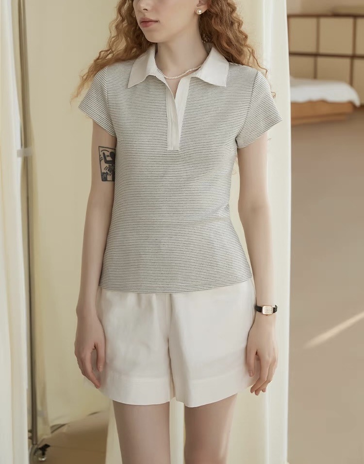 美式复古细条纹POLO领修身正肩短袖T恤女25夏新款翻领上衣