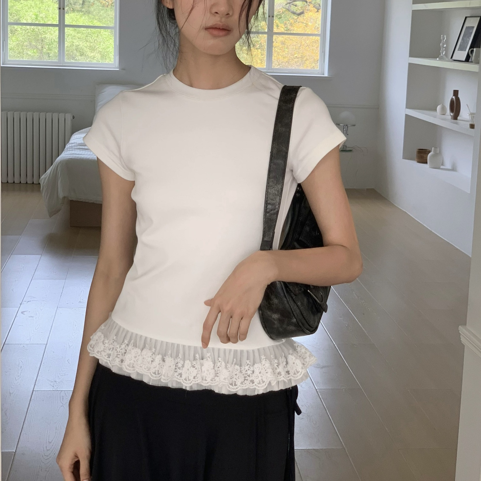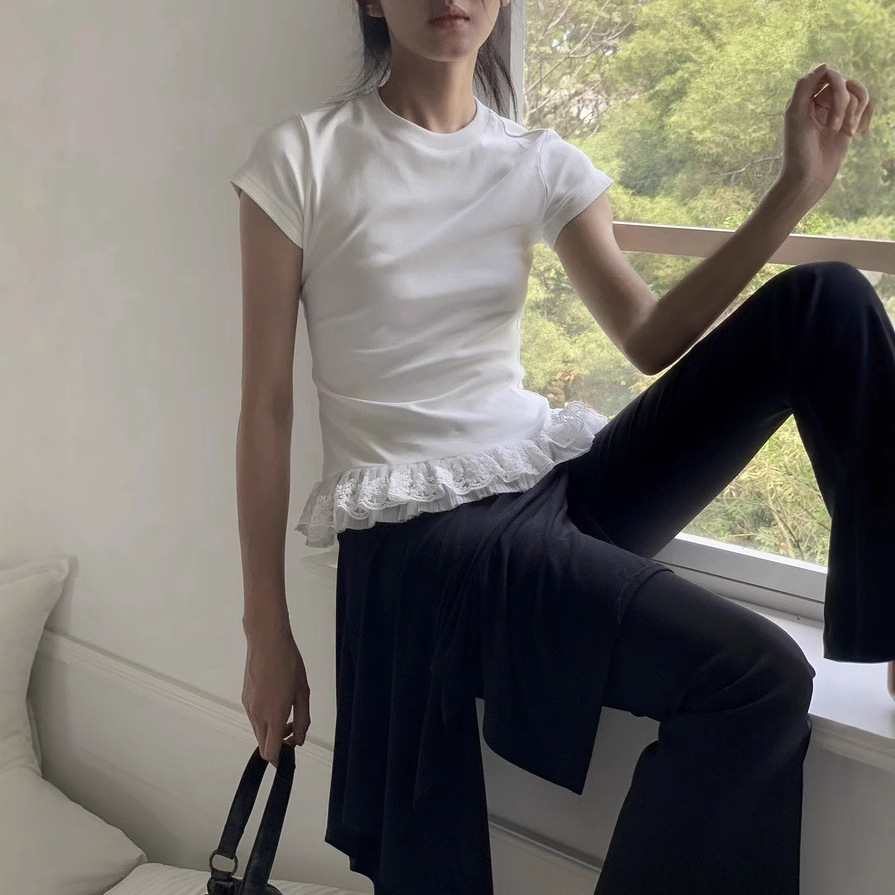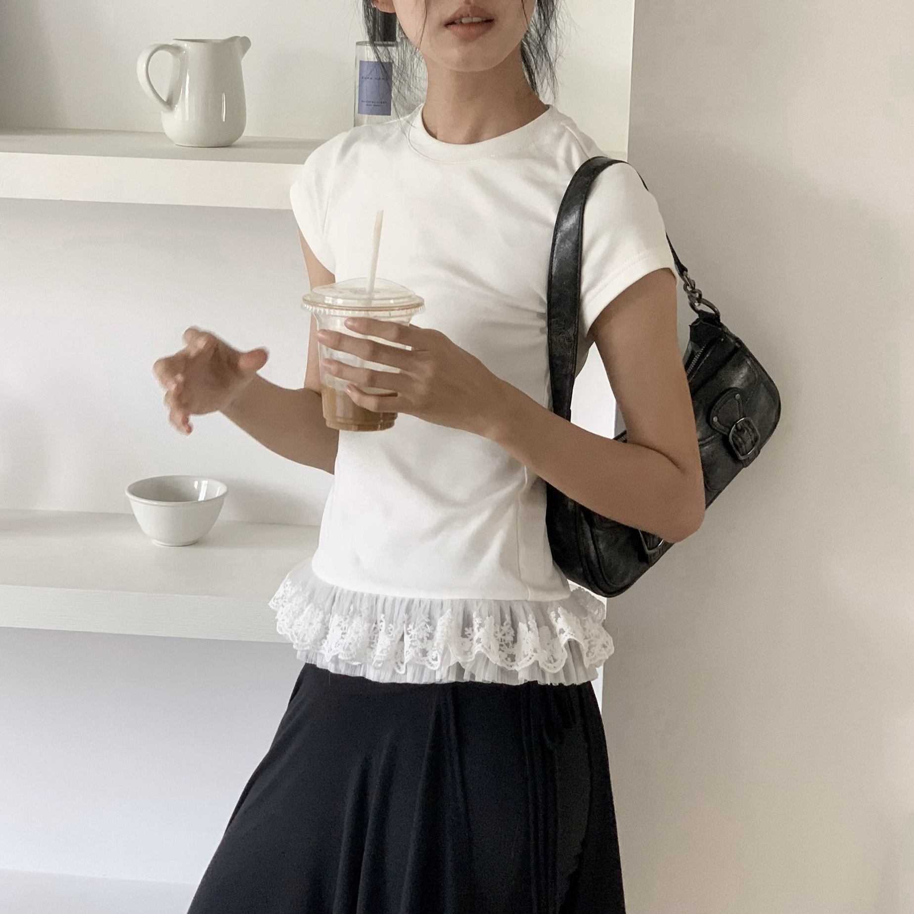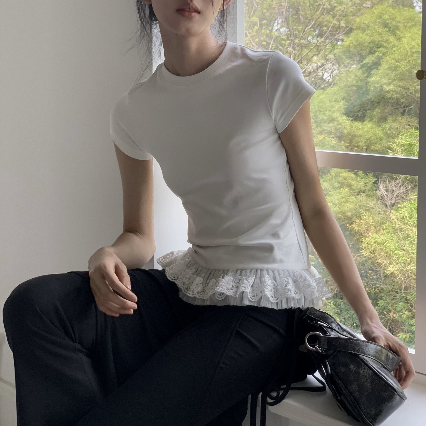 法式蕾丝边白色短袖t恤女夏季新款甜美短款正肩上衣