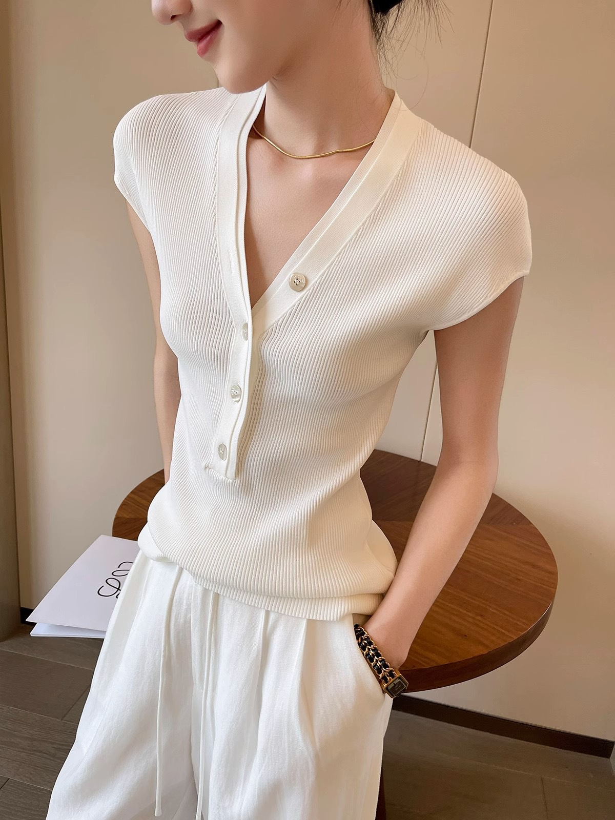 白色双层V领短袖T恤女夏季2025新款修身时尚简约气质上衣