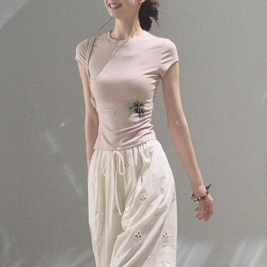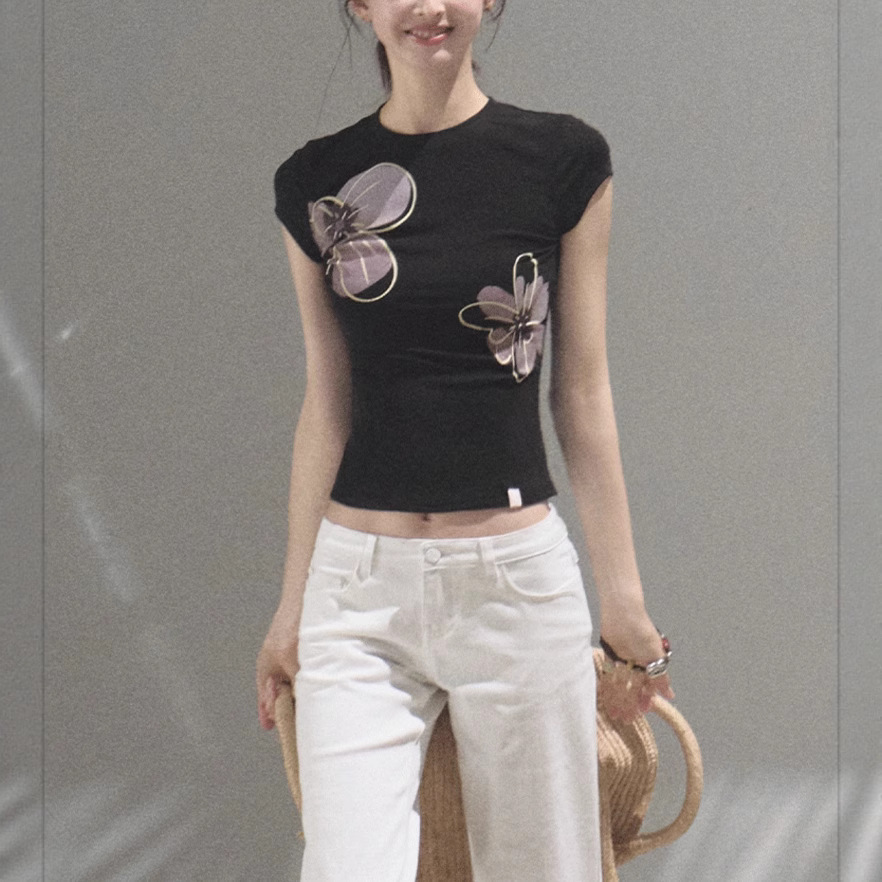 OAKMO/ '海棠花未眠' 正肩基础修身显瘦印花花朵T恤上衣