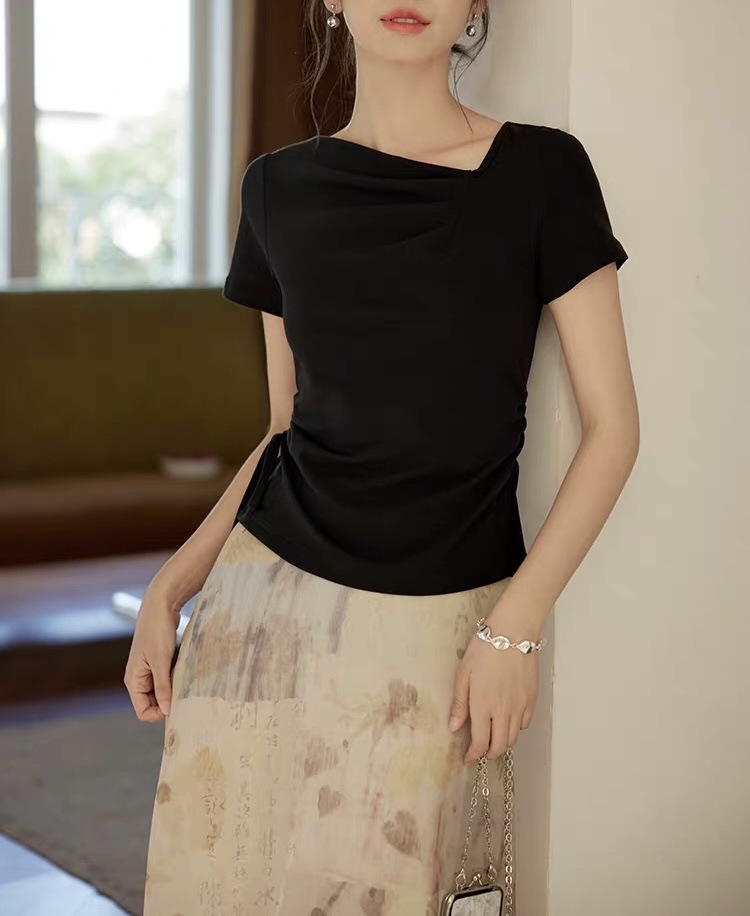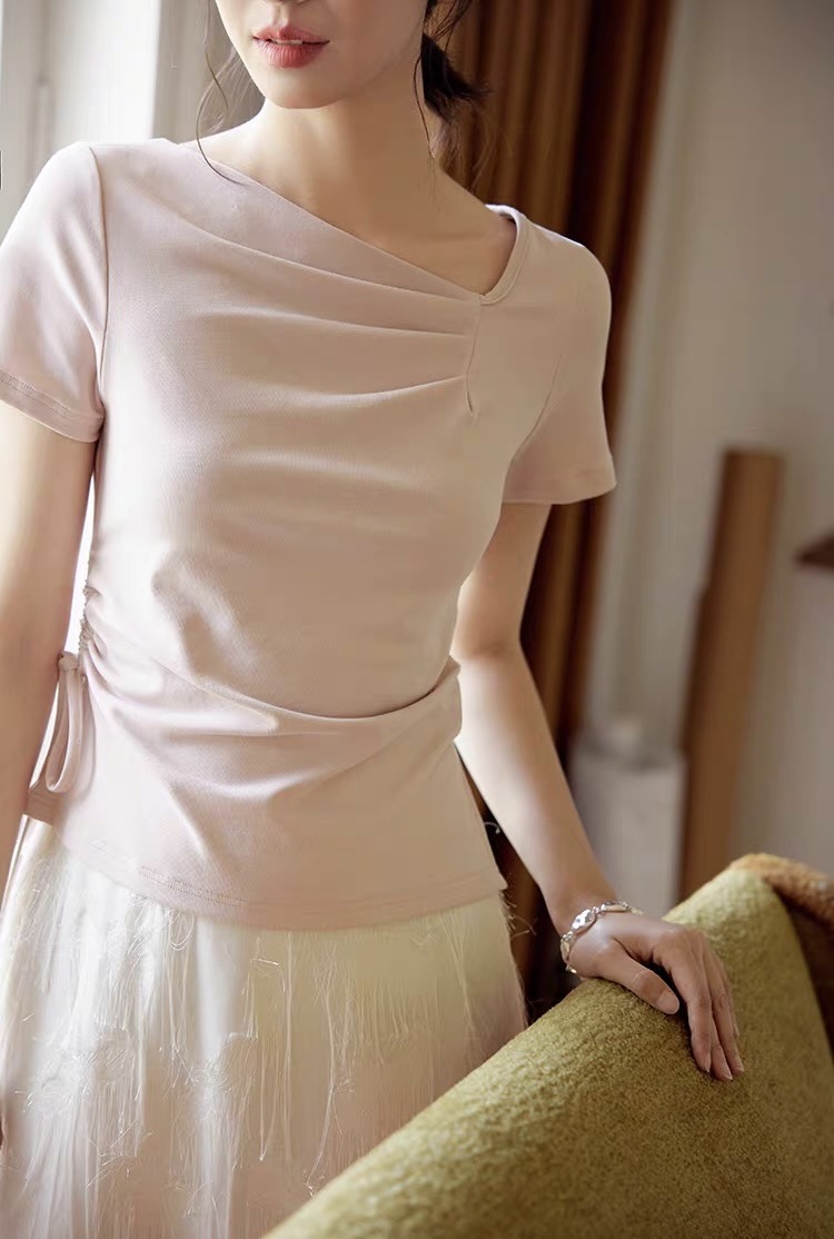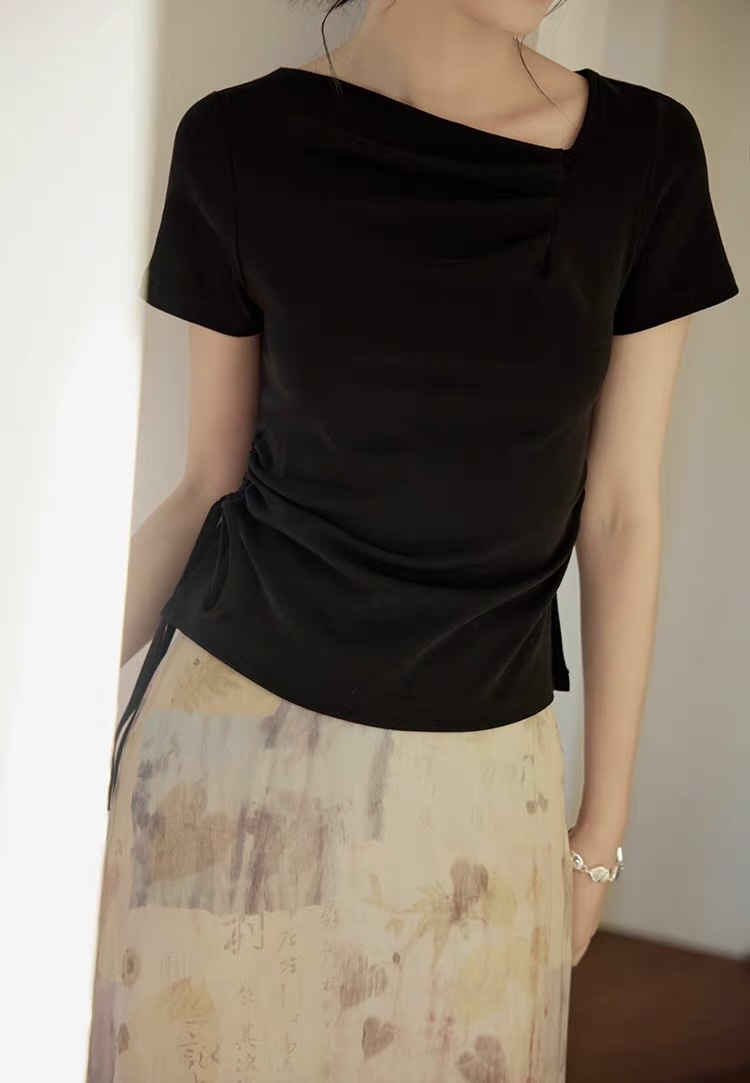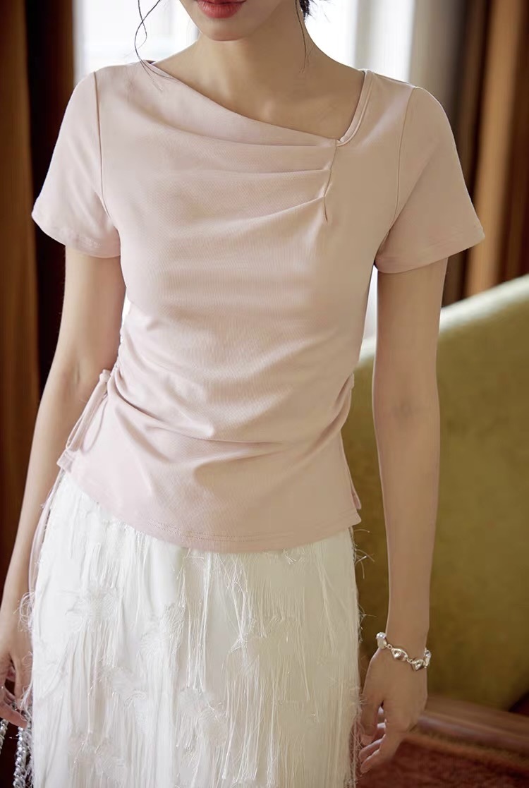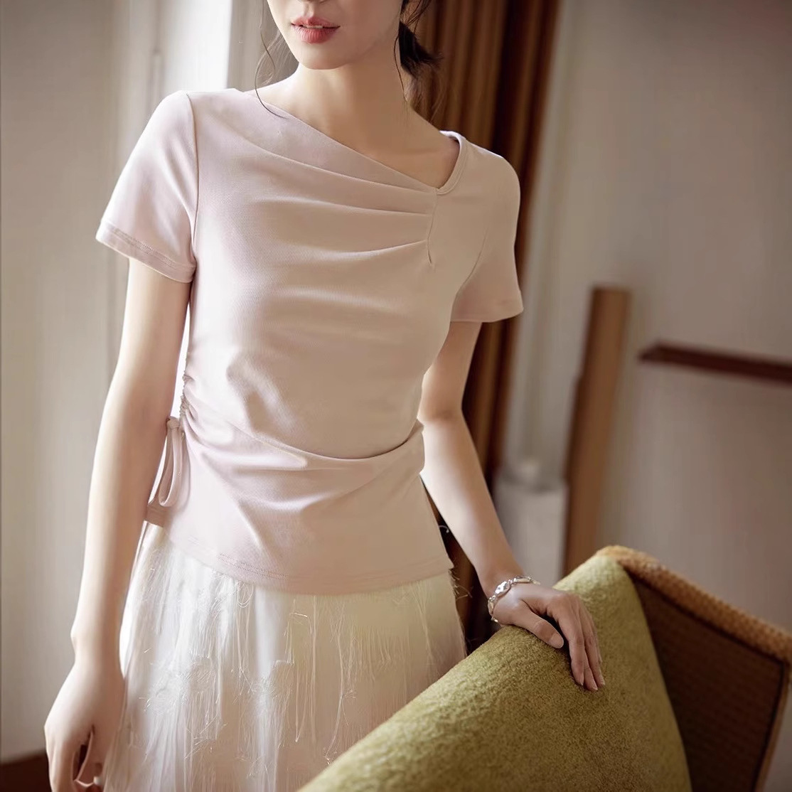 粉色/黑色斜领抽绳开叉短袖t恤女夏季法式复古气质上衣
