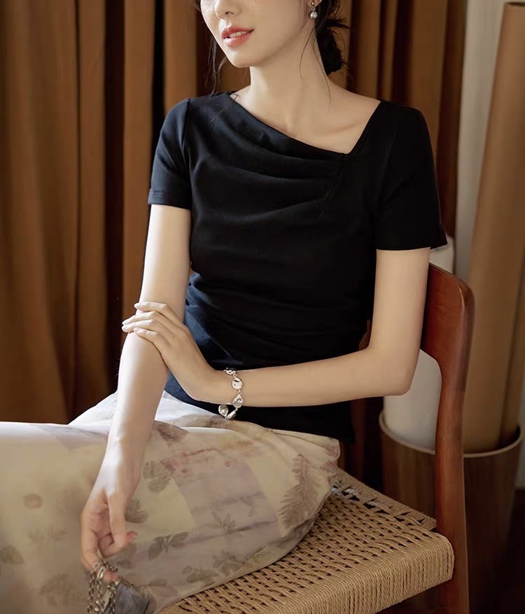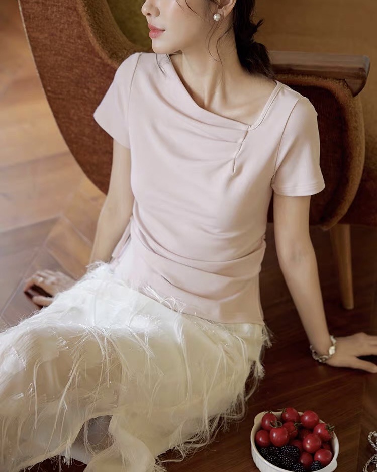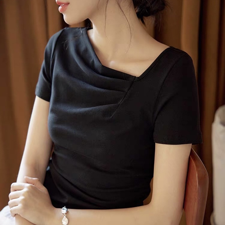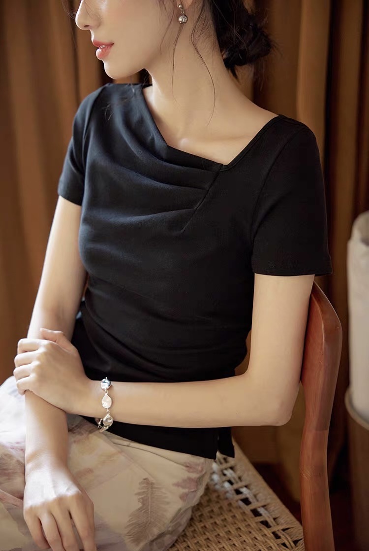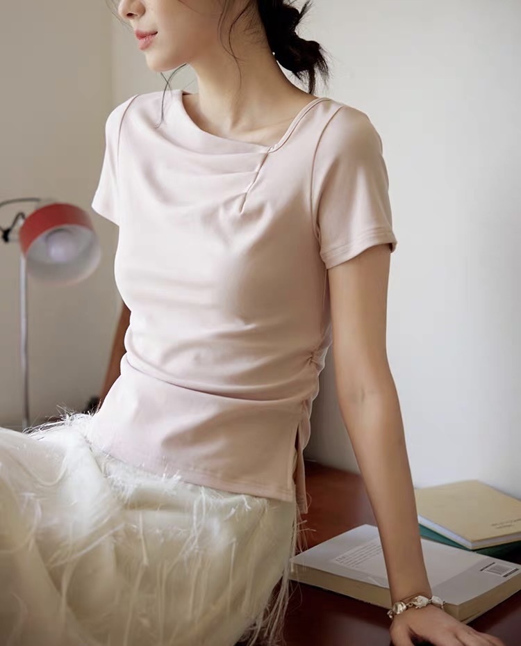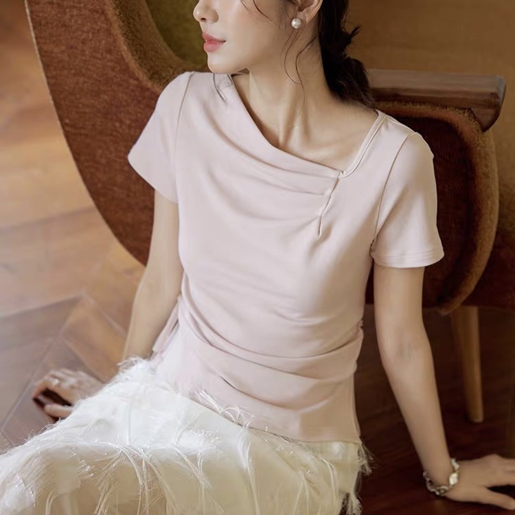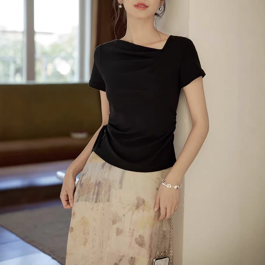 粉色/黑色斜领抽绳开叉短袖t恤女夏季法式复古气质上衣
