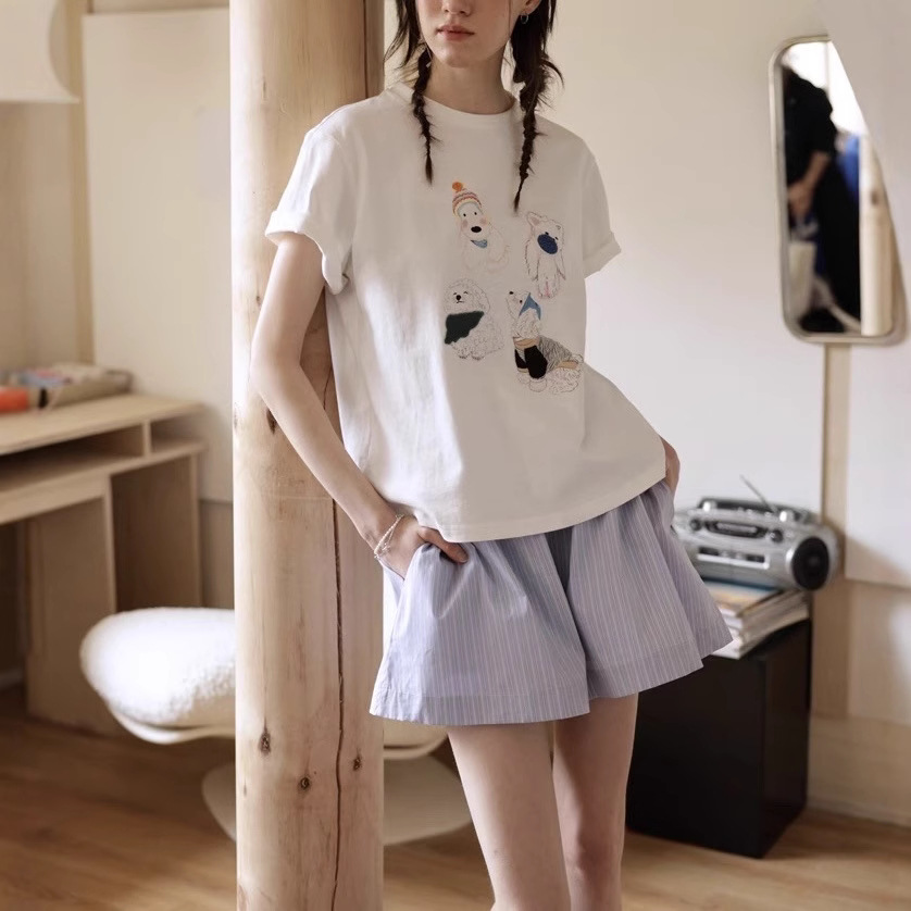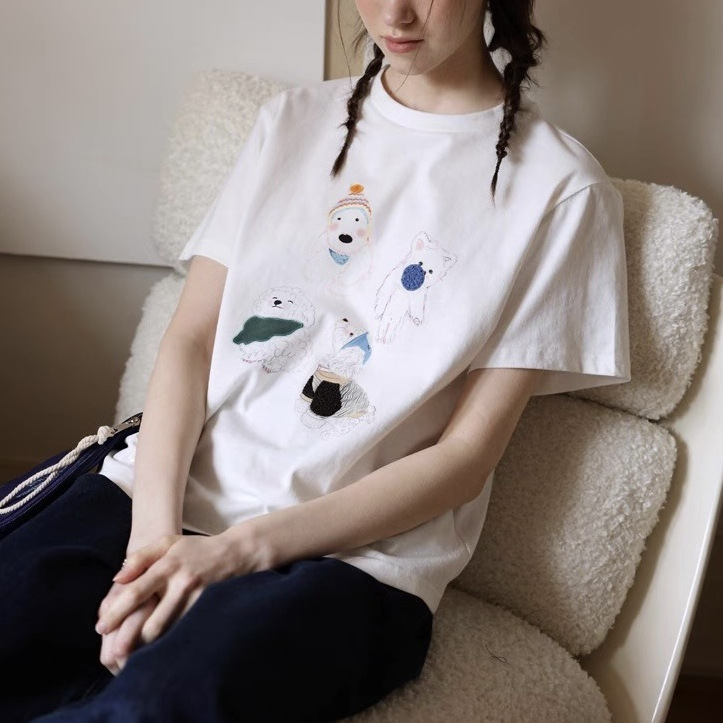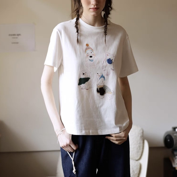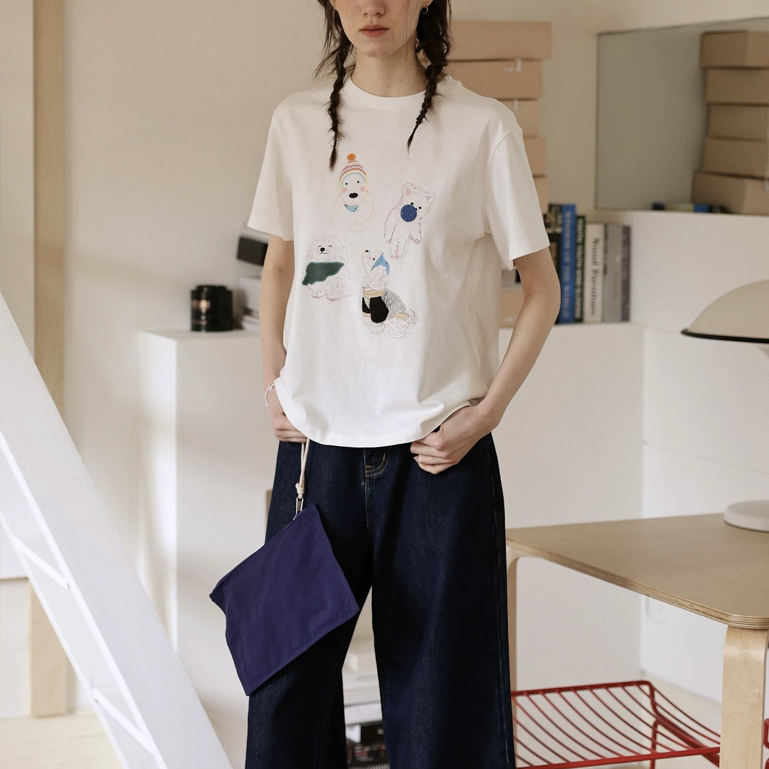 四只小狗' 立体植绒卡通手绘印花松弛亲肤短袖T恤