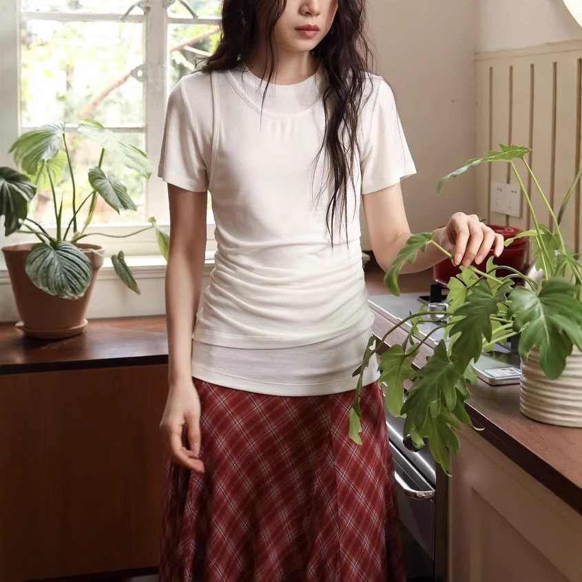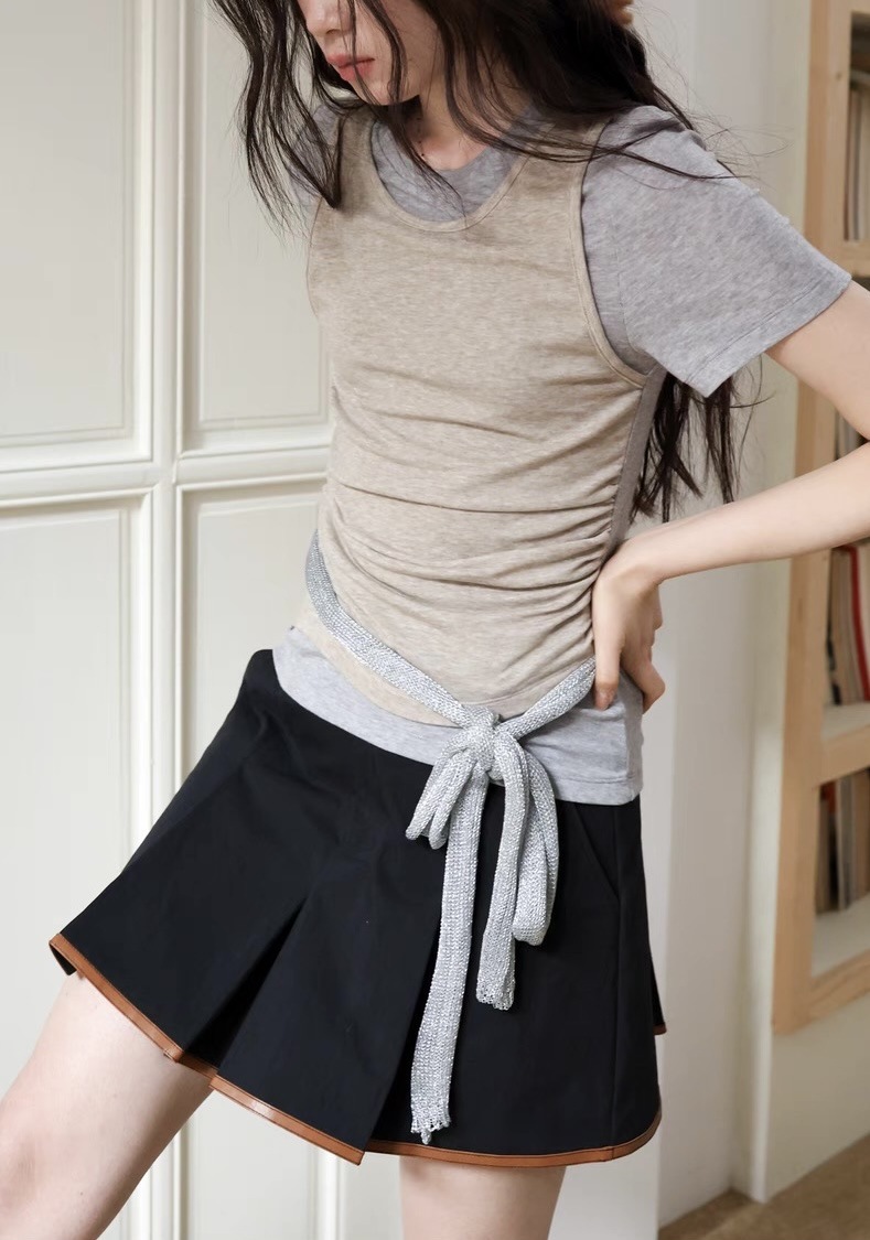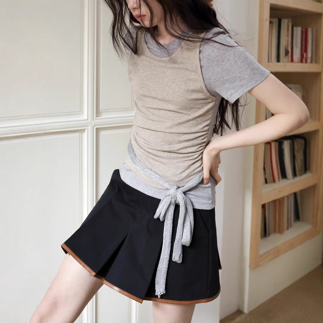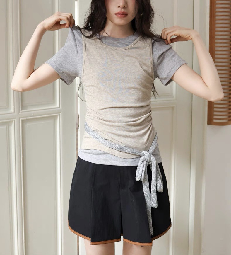 多色莱赛尔圆领收腰显瘦堆叠假两件背心短袖