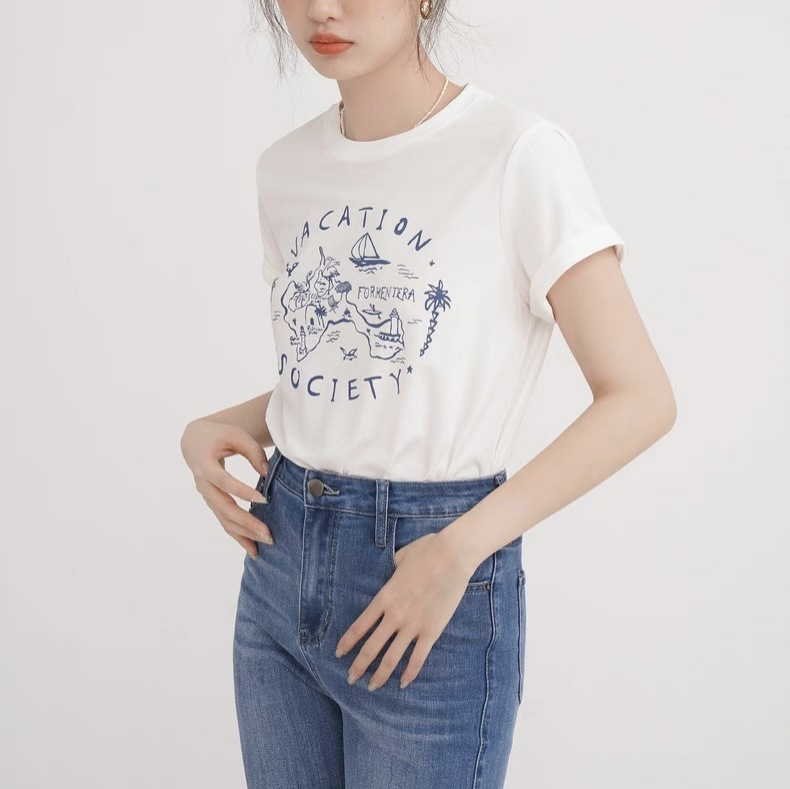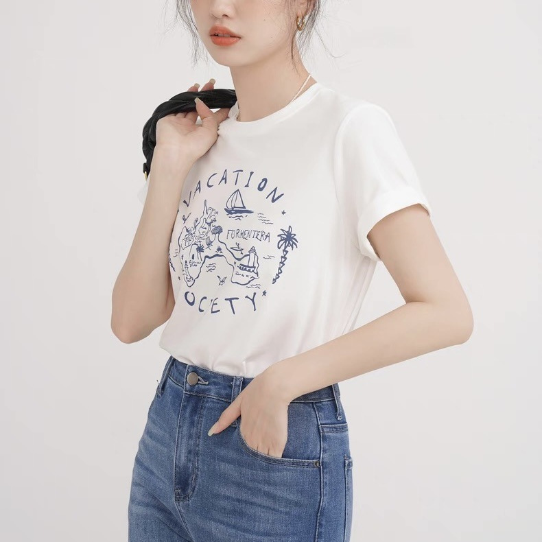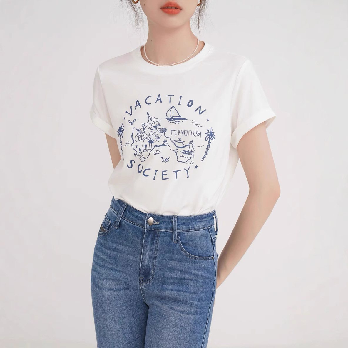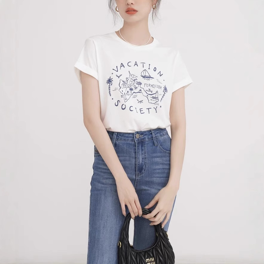 白色圆领短袖T恤女夏季新款美式休闲百搭印花上衣