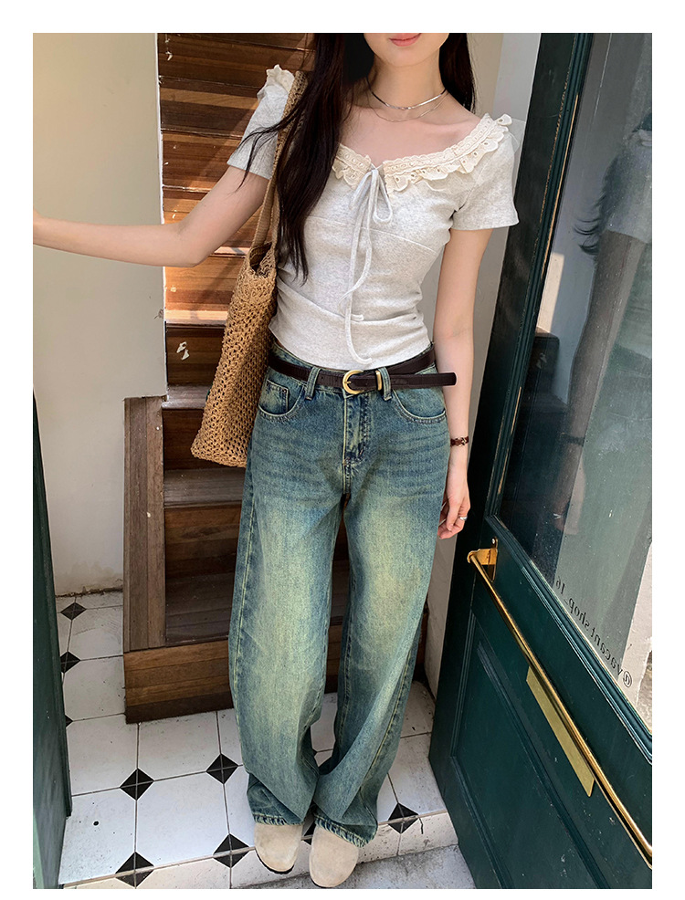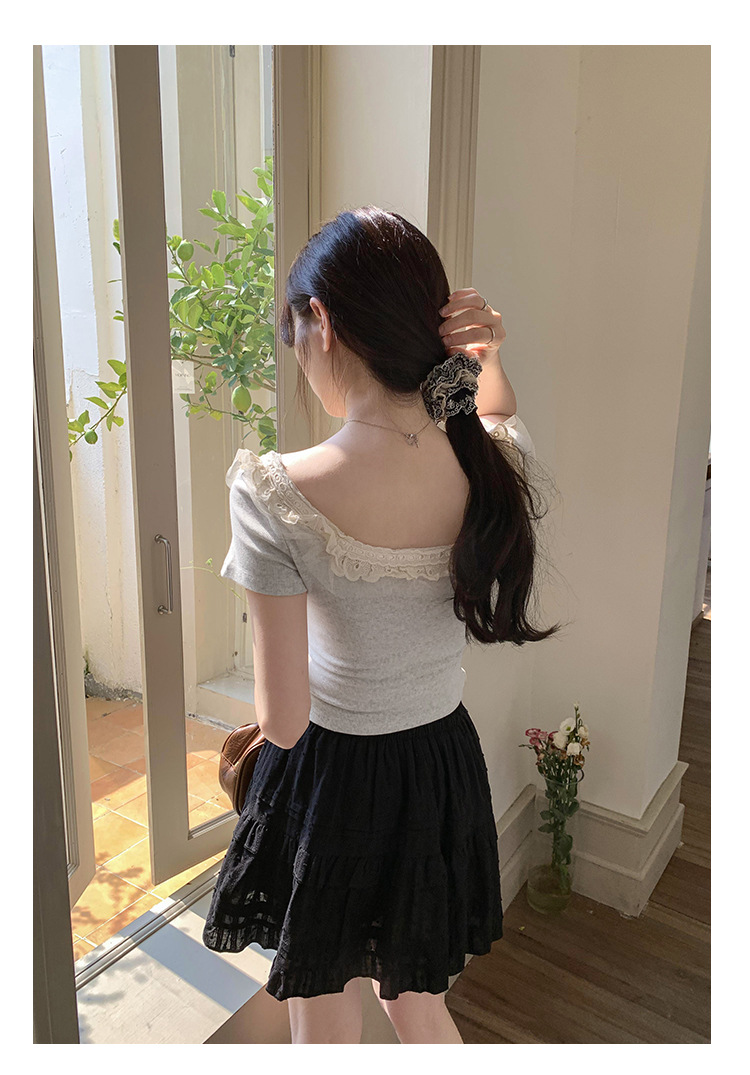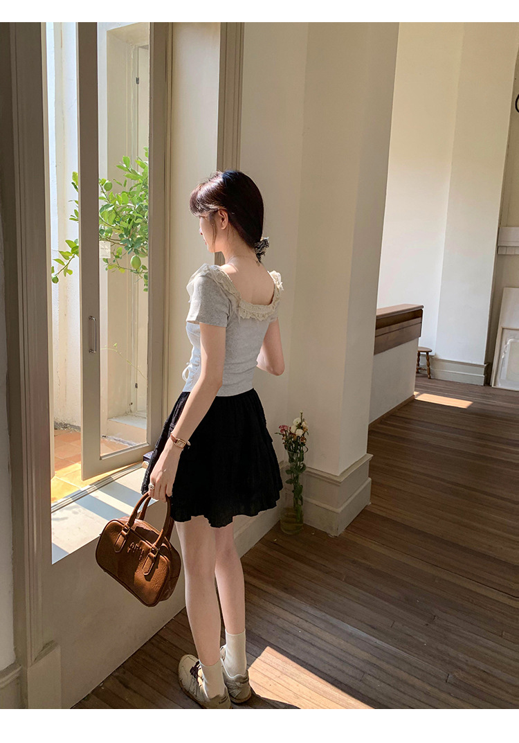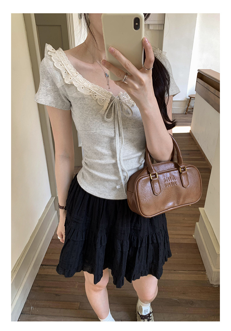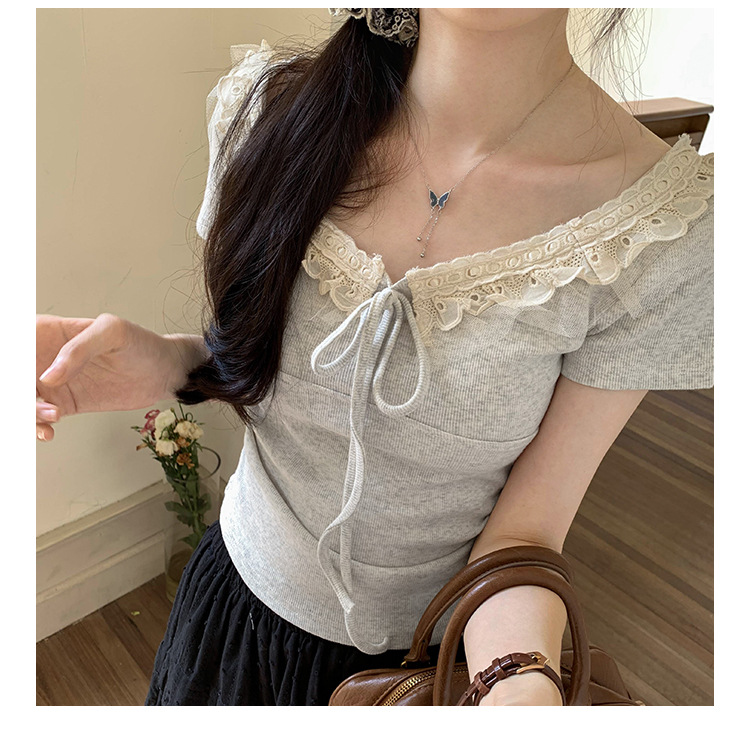 纯欲方领蕾丝边系带短袖T恤女夏新款收腰抽褶显瘦短上衣