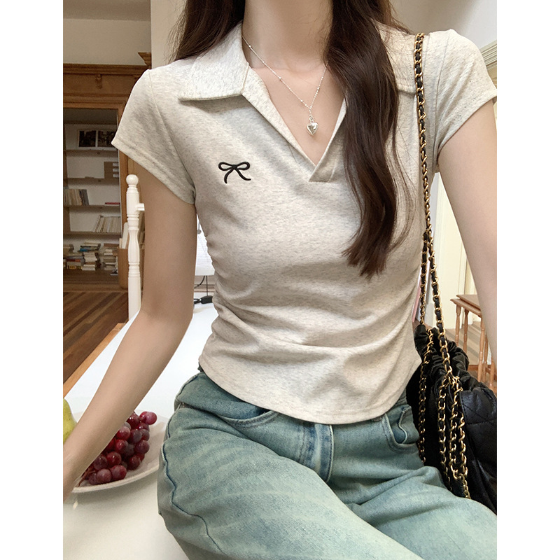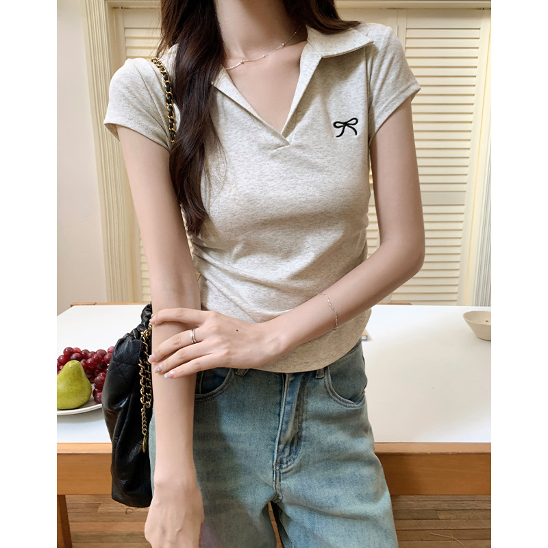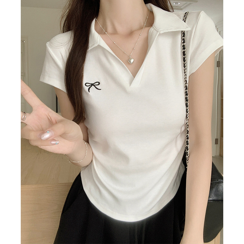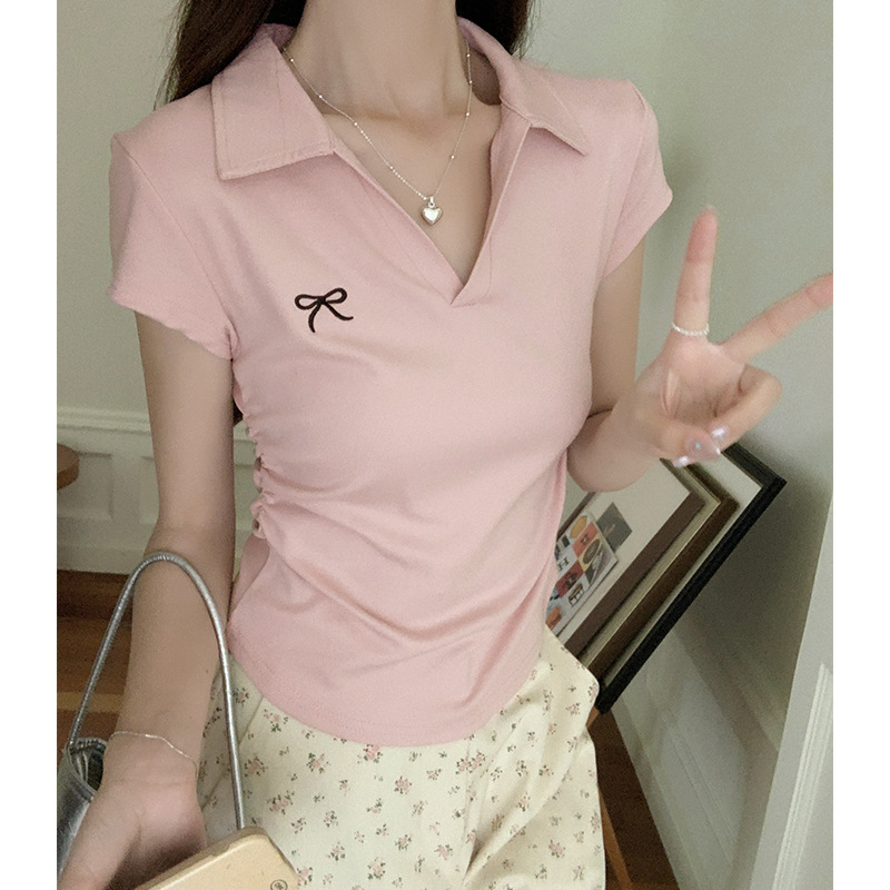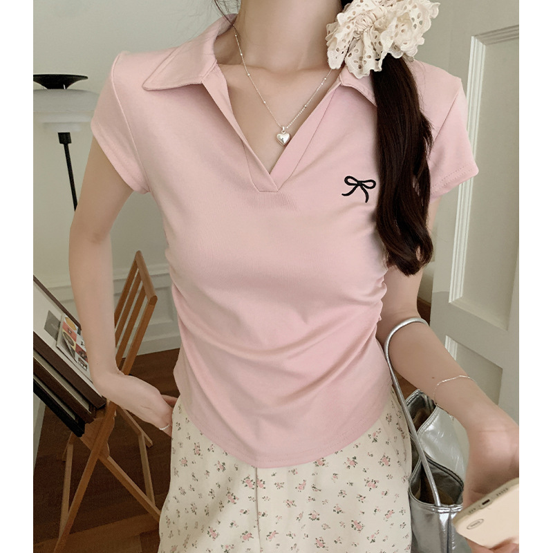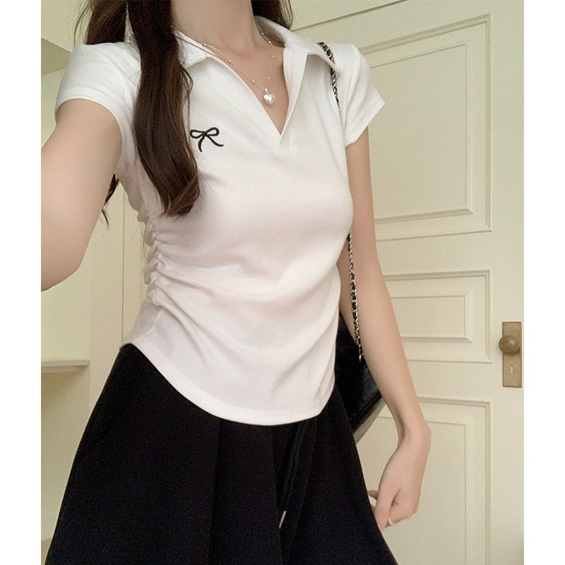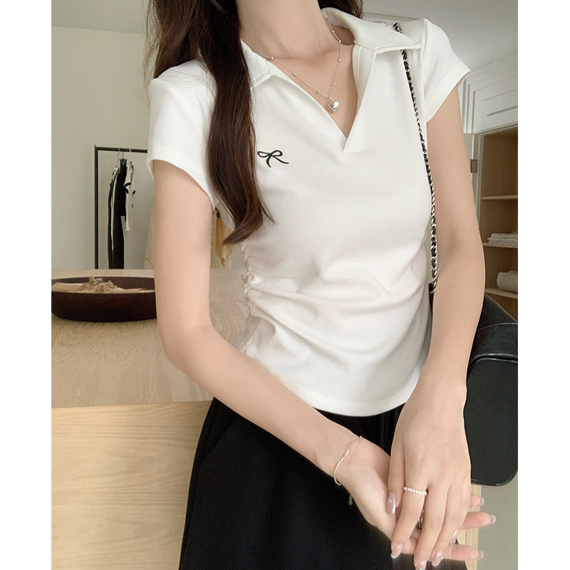 蝴蝶结刺绣T恤女夏季POLO领修身褶皱不规则洋气上衣