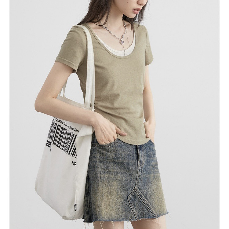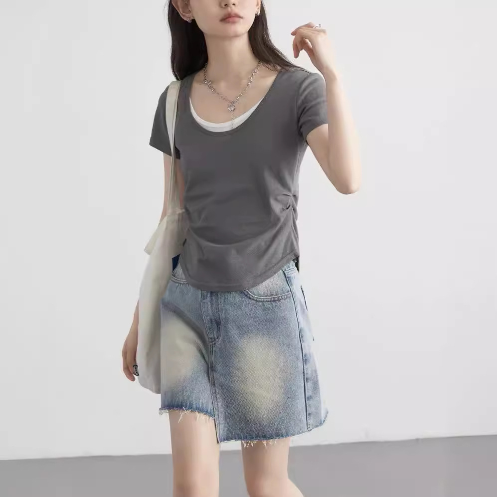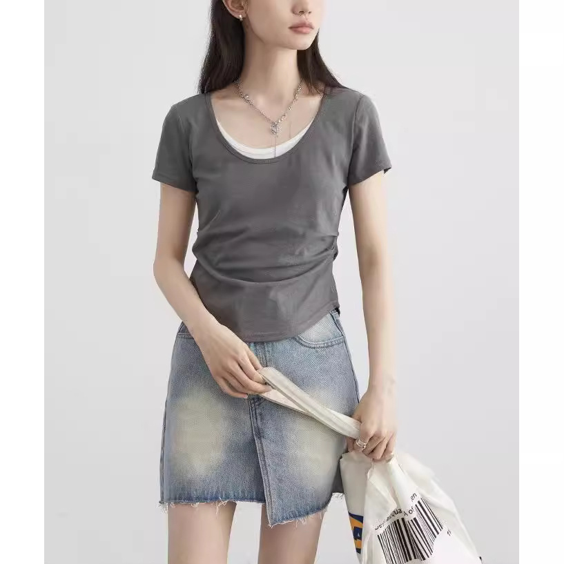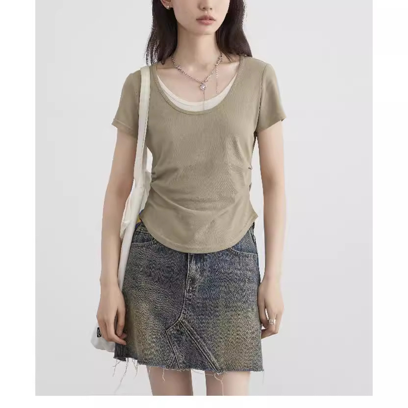 「遇见夏日」夏季新款U领撞色假两件褶皱T恤正肩短袖上衣