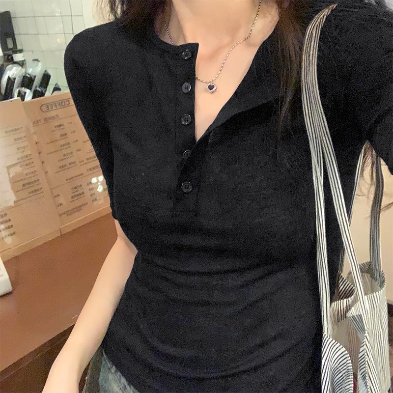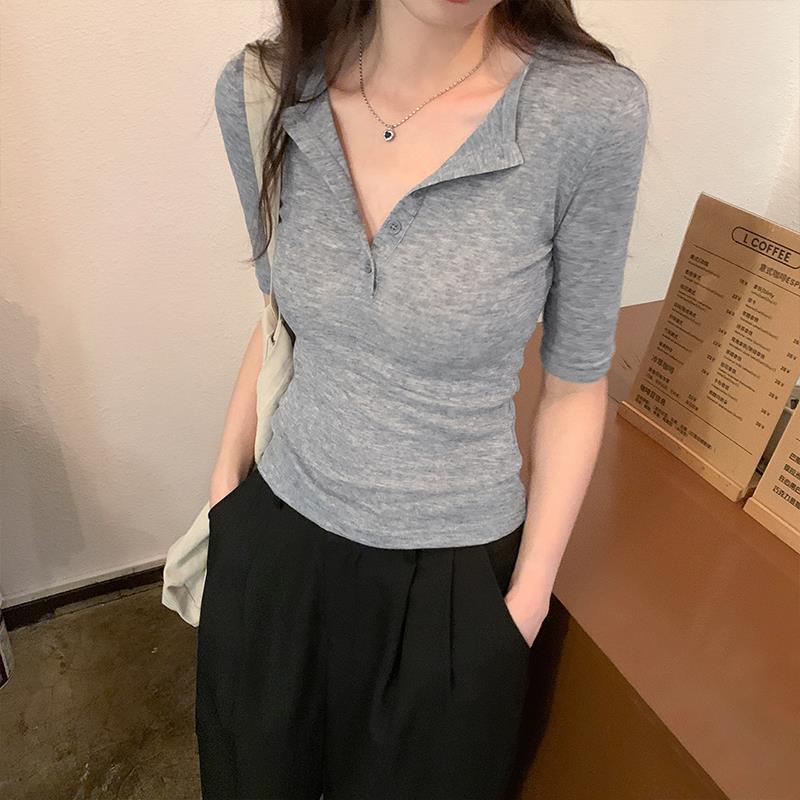 正肩V领短款T恤女夏新款修身显瘦辣妹五分袖薄款上衣