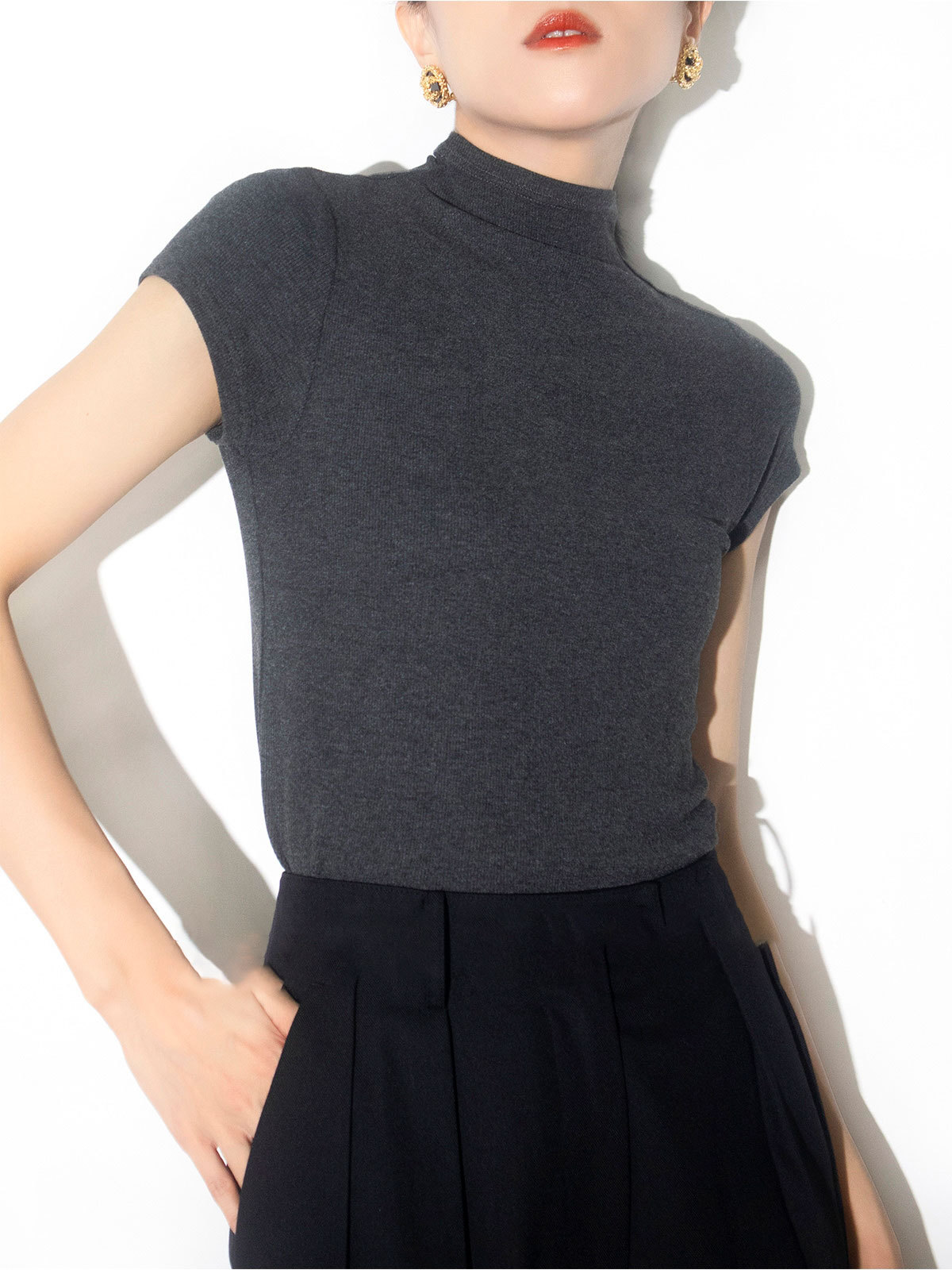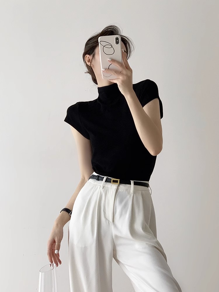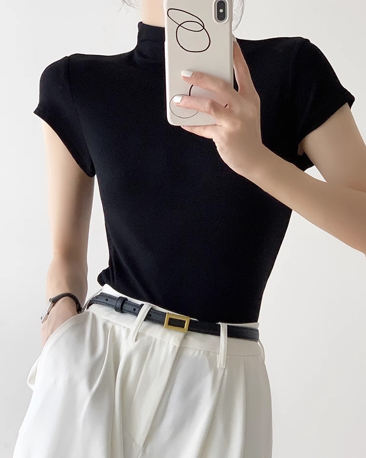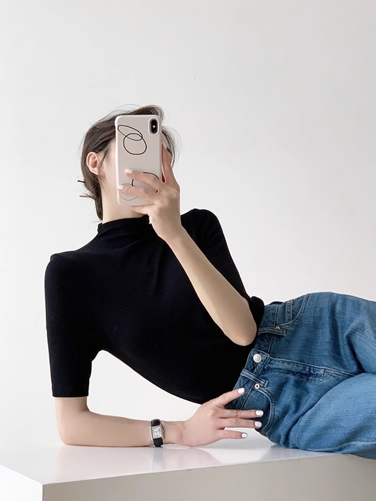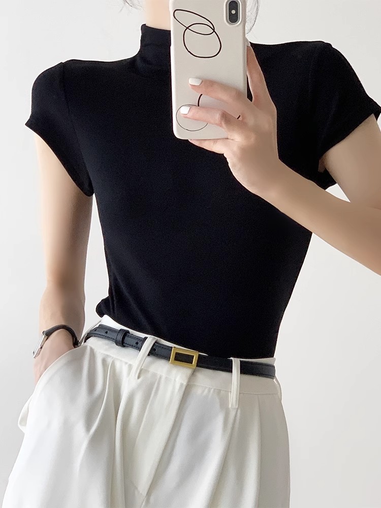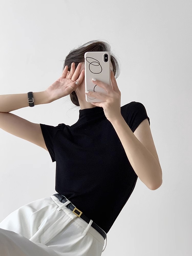 黑色短袖高领T恤女中袖 新高弹小众设计感显瘦上衣打底衫春秋内搭