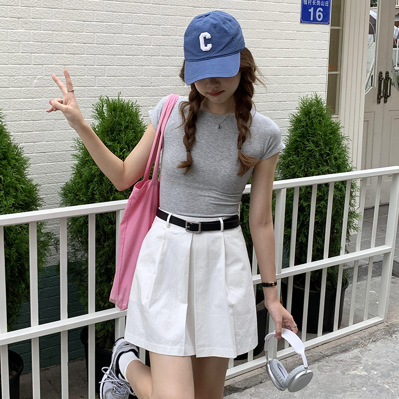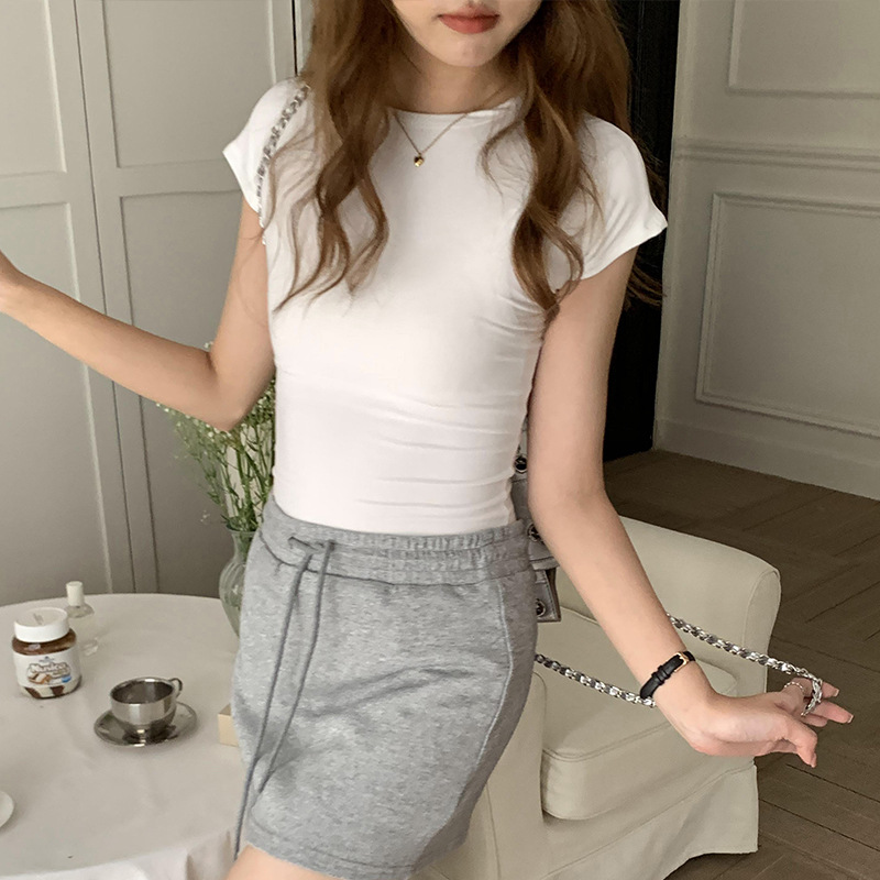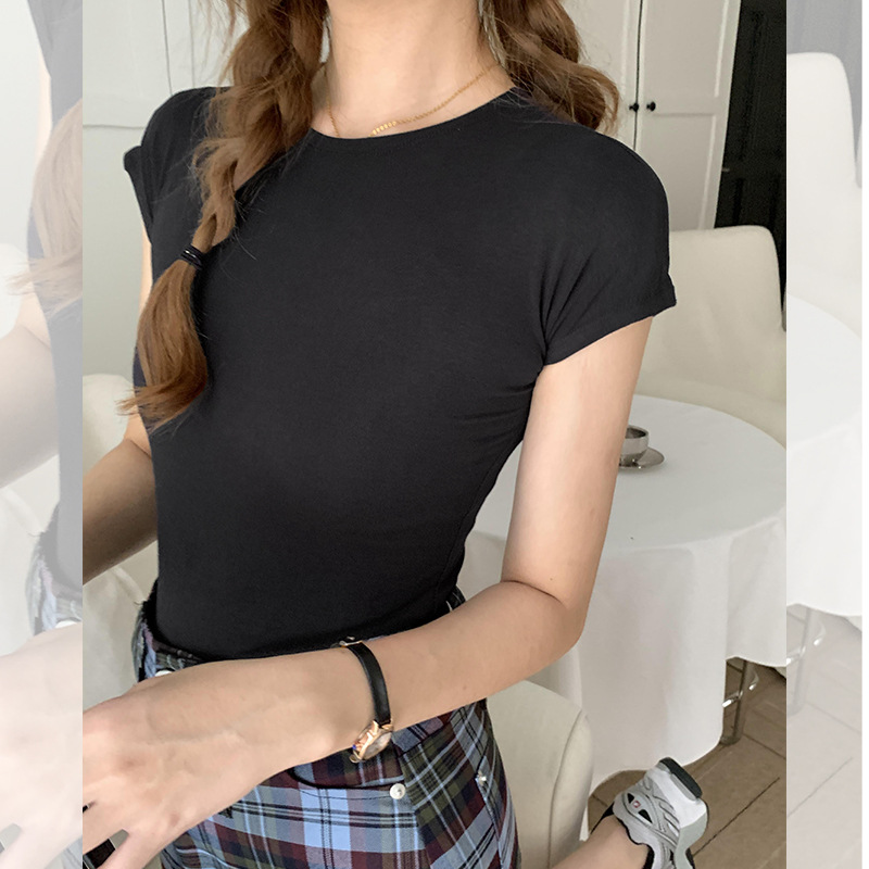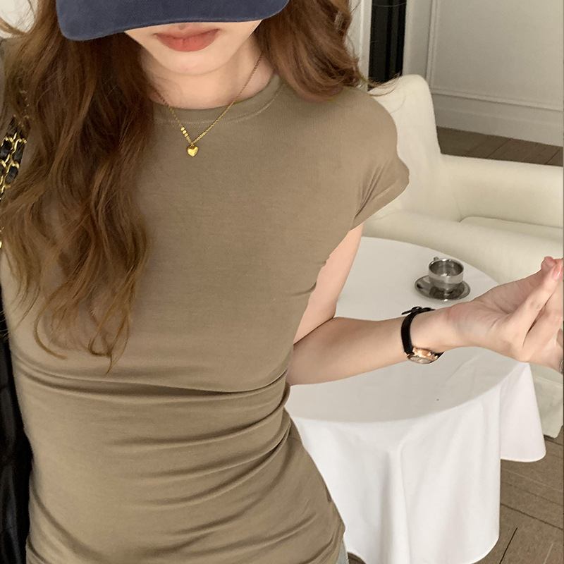 杏色短袖t恤女夏季纯色百搭圆领修身显瘦短款T恤上衣