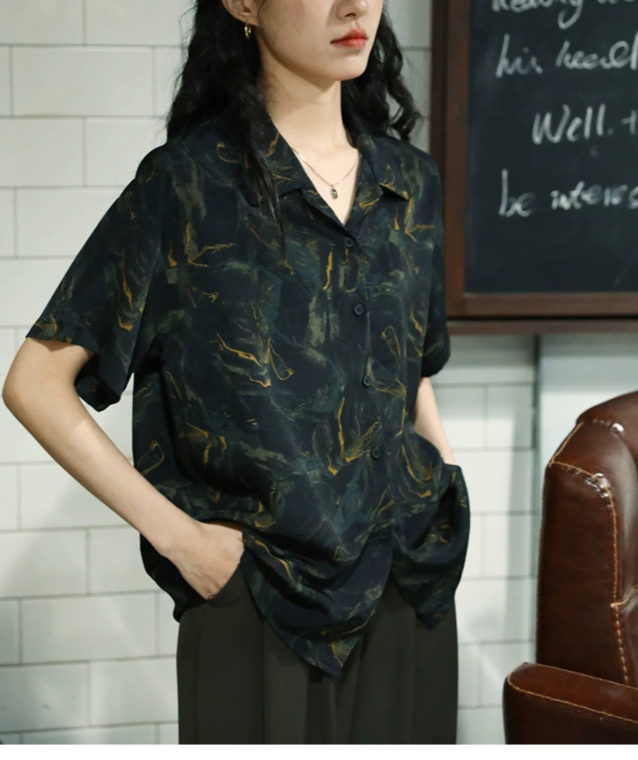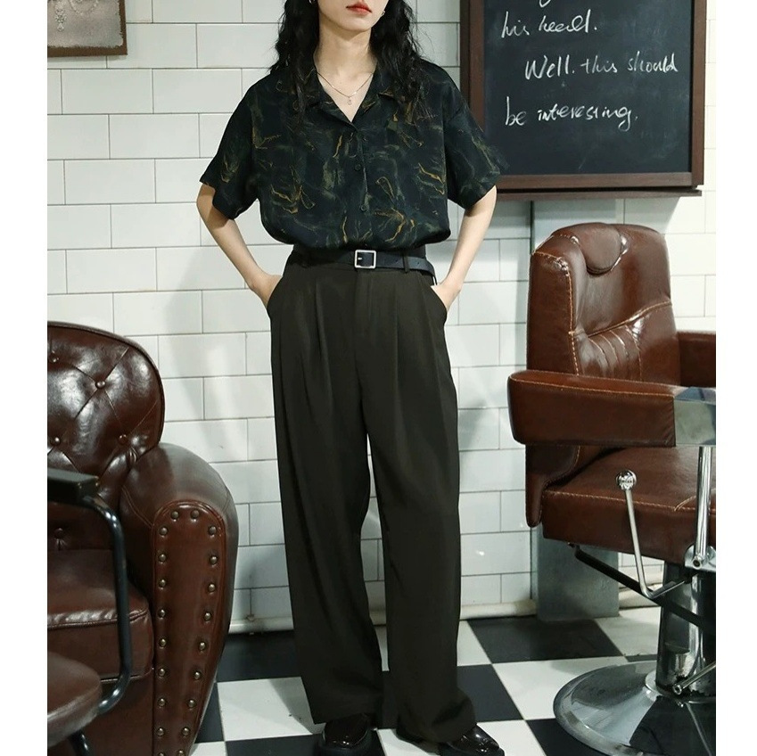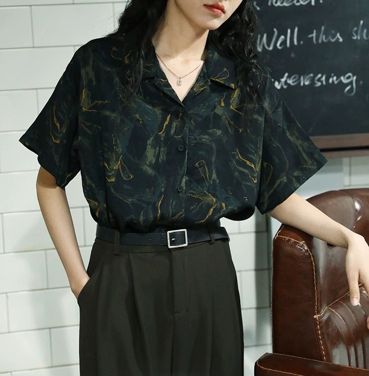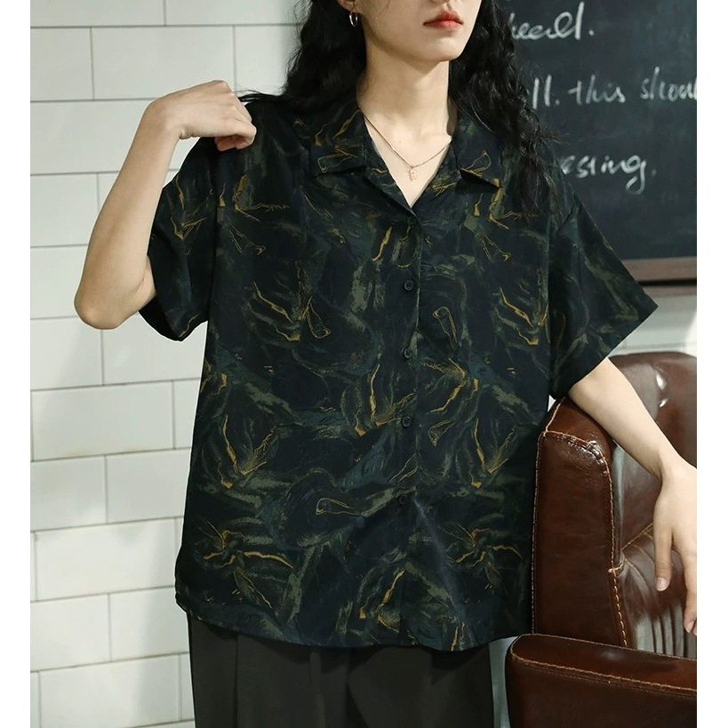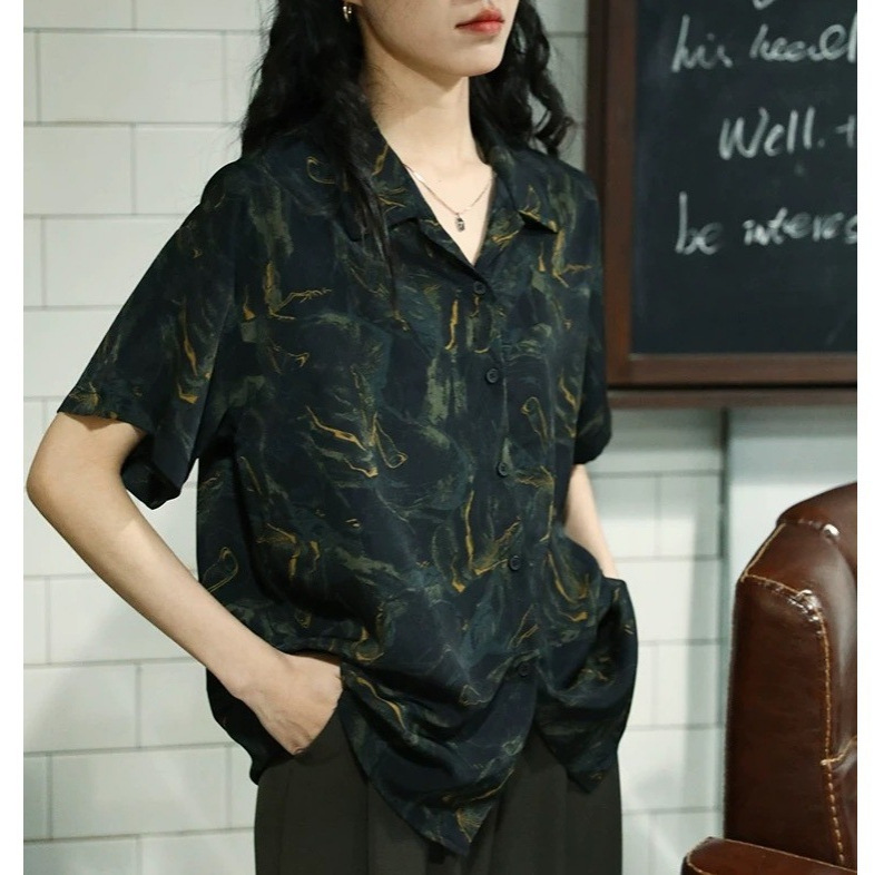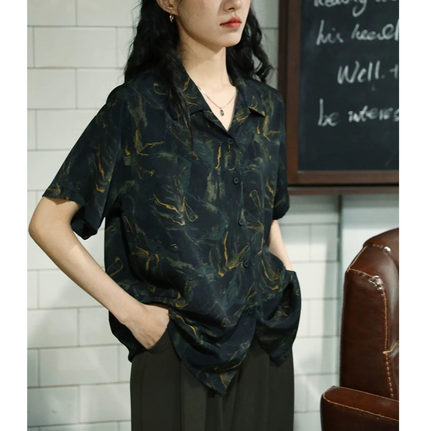 水波纹晕染印花短袖衬衫女夏季设计感小众复古港味休闲百搭上衣服