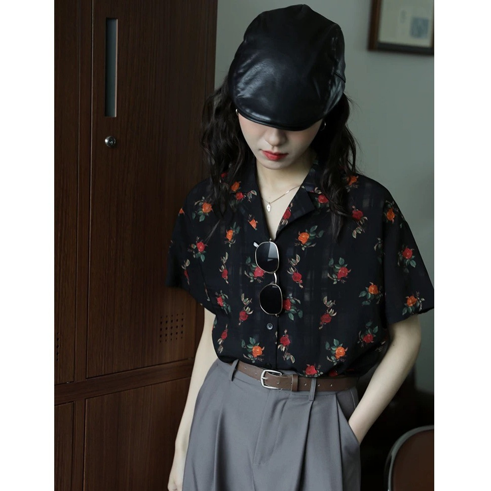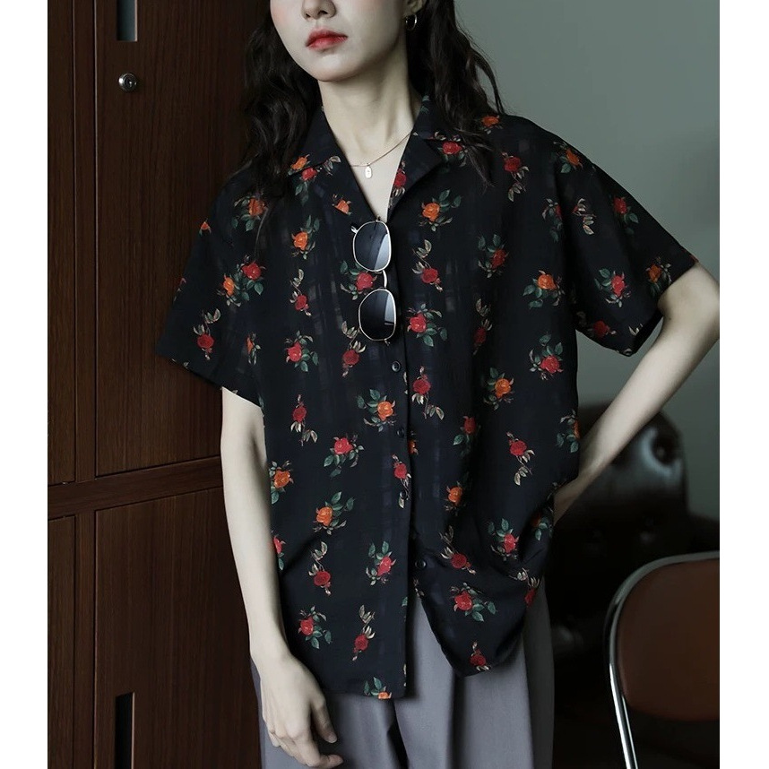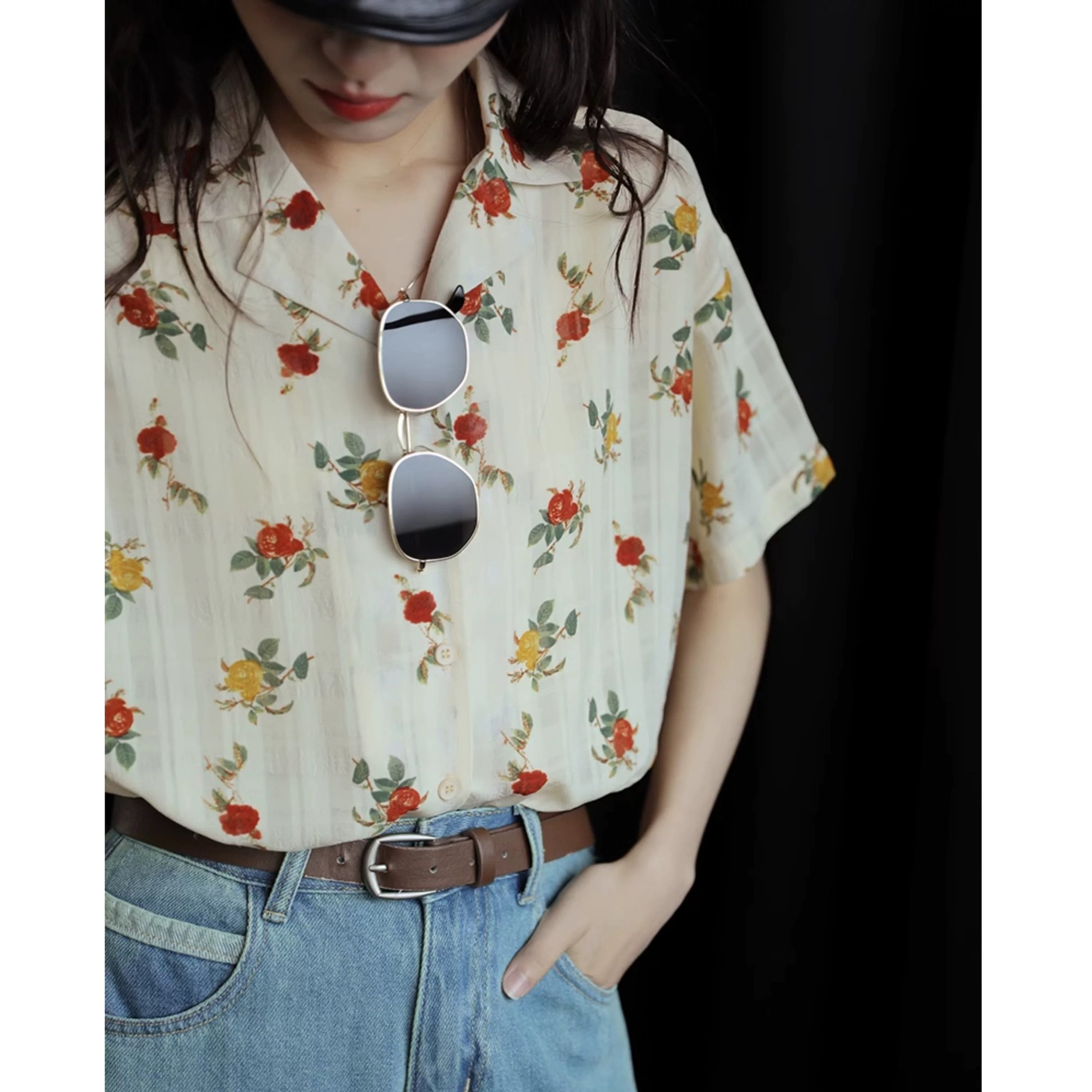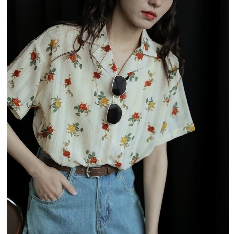 杏色玫瑰花气质翻领简约复古港风设计感短袖衬衫女夏季显瘦上衣服