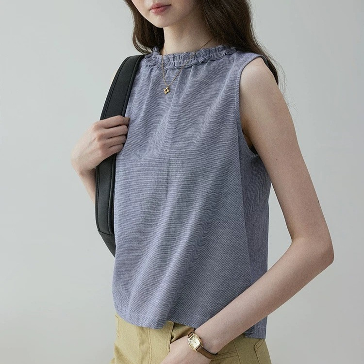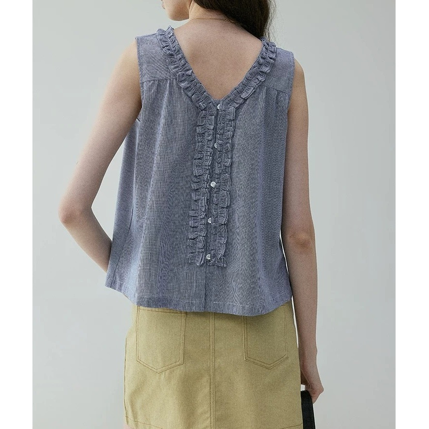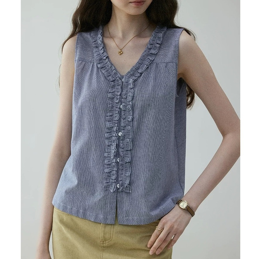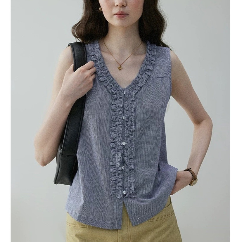 「芥末派VOOE」法式前后两穿花边背心衬衫女夏季百搭V领无袖上衣