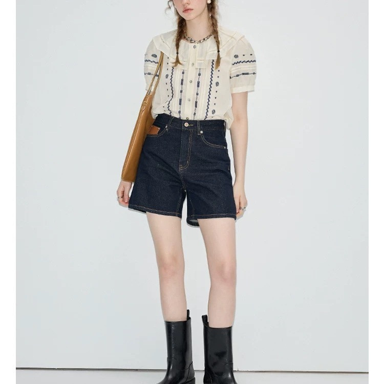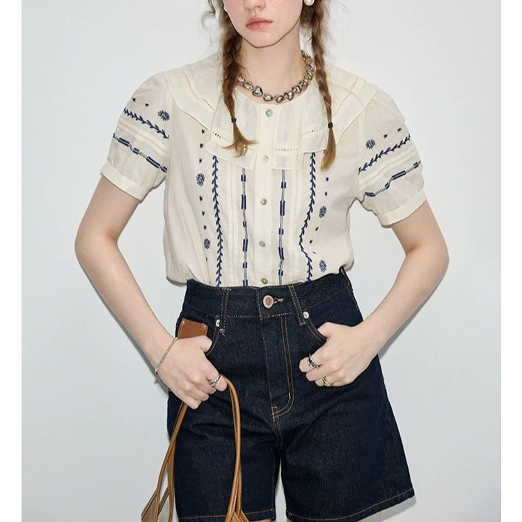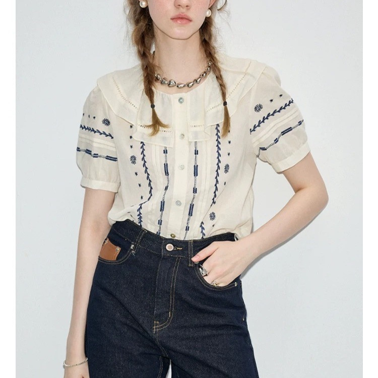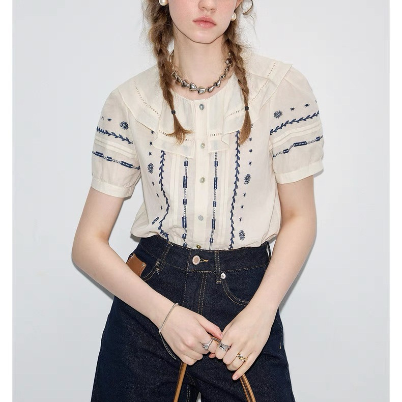 衬衫女2025新款夏季通勤百搭刺绣荷叶边泡泡袖短袖衬衣