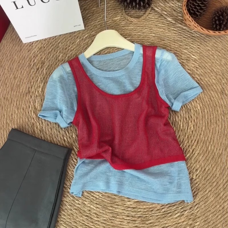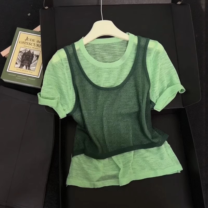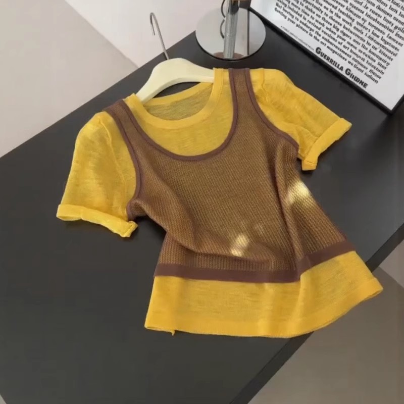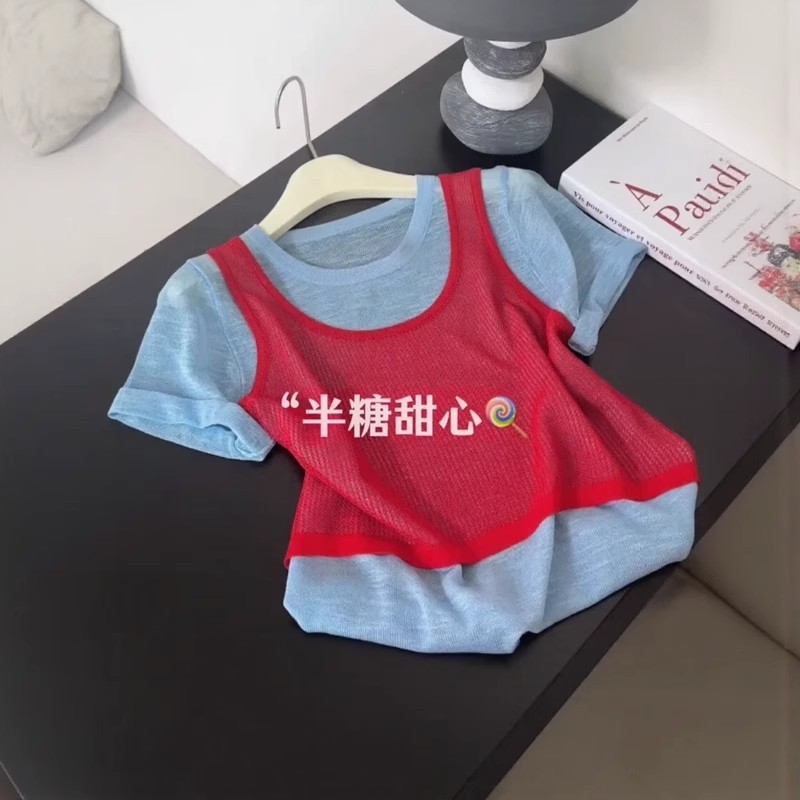 韩系撞色假两件针织短袖t恤女夏季设计感独特减龄宽松显瘦小上衣