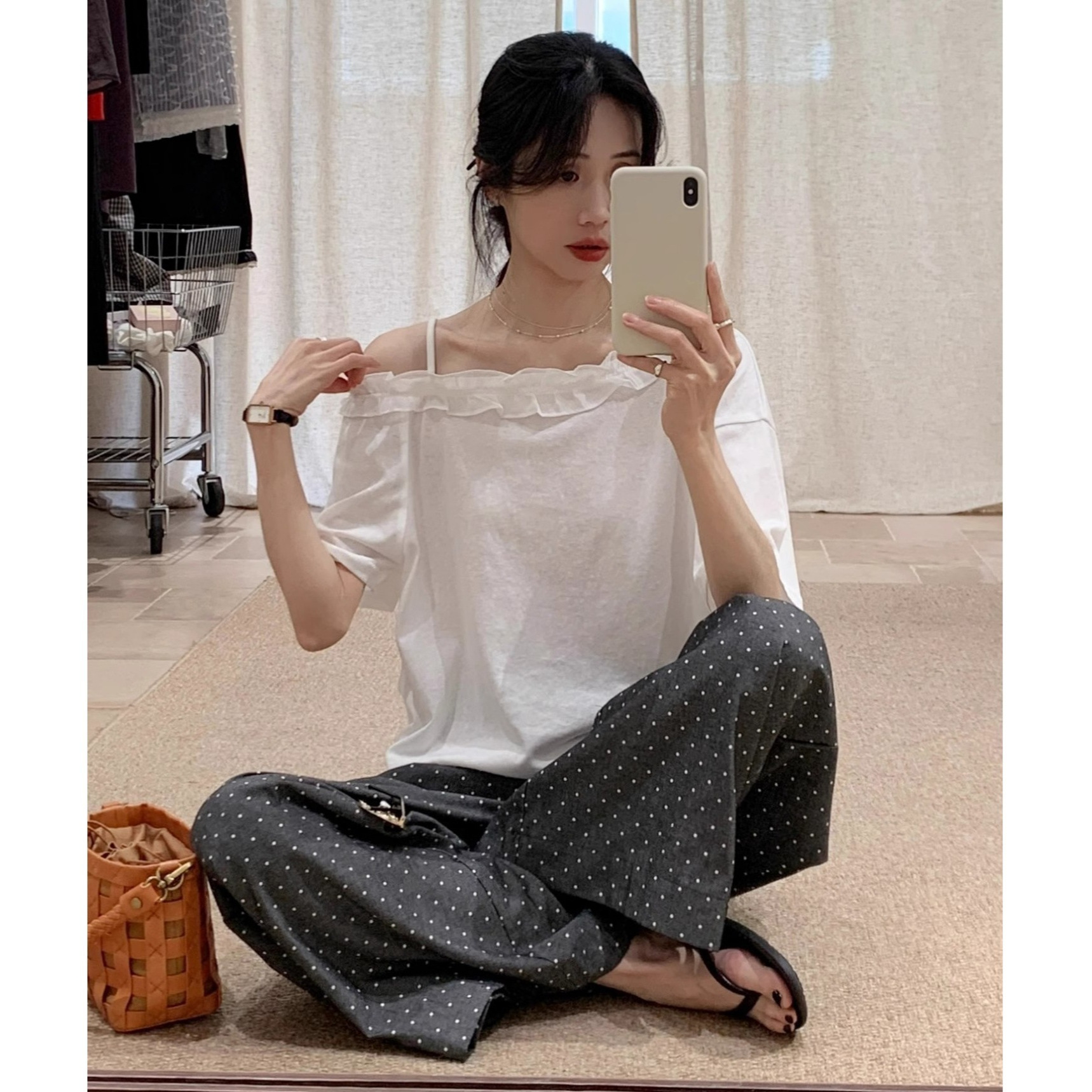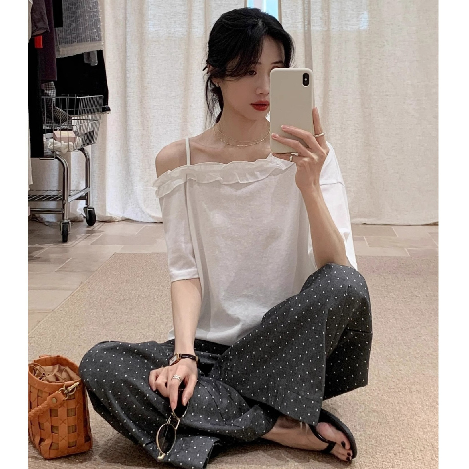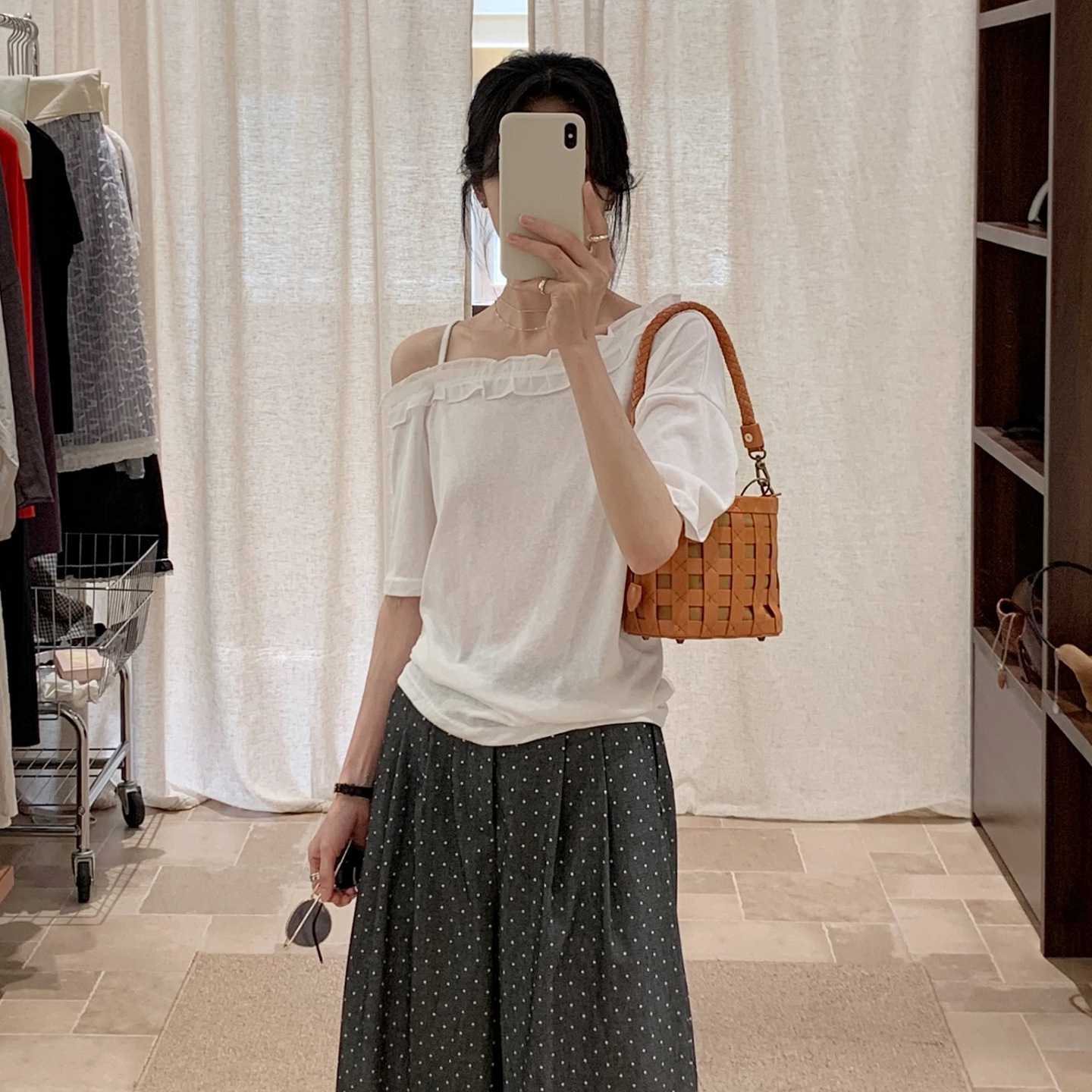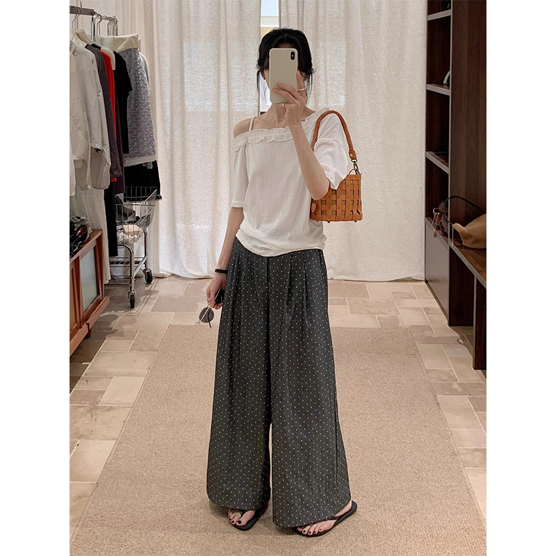 韩系斜肩花边短袖T恤女夏季薄款简约休闲设计感小众白色上衣