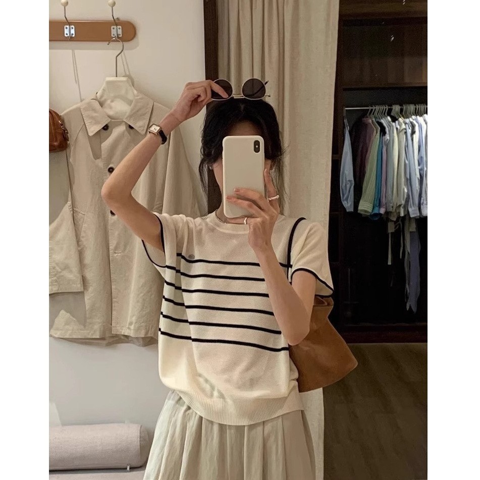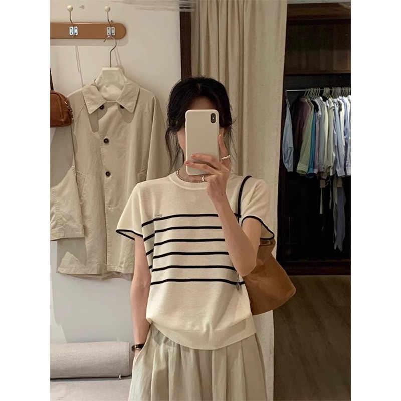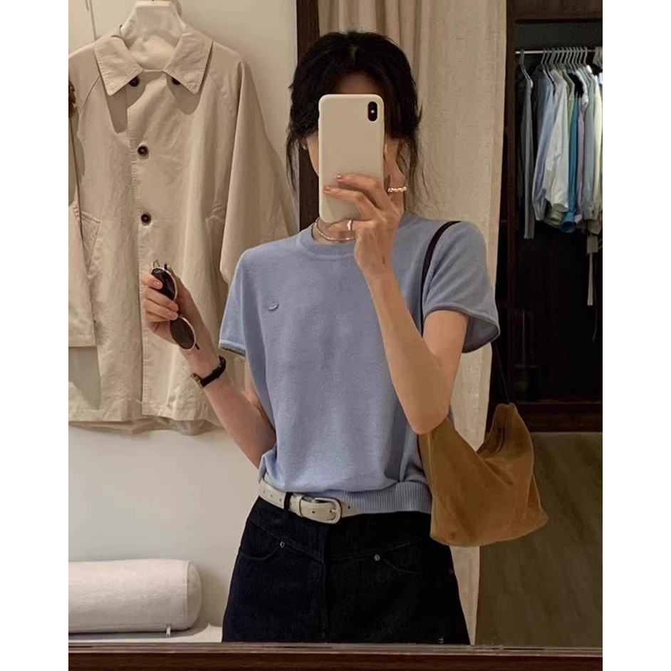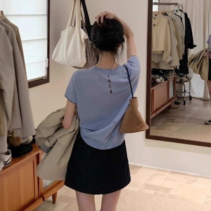 后背镂空蓝色正肩短袖T恤女夏季薄款单穿设计感小众针织上衣