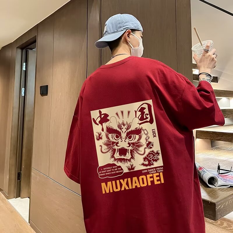 美式复古红色短袖t恤男夏季宽松七分袖设计感衣服潮流
