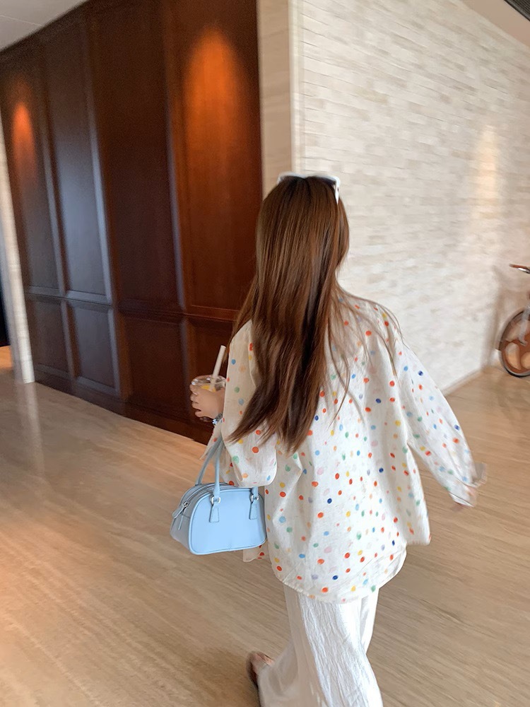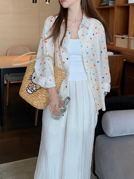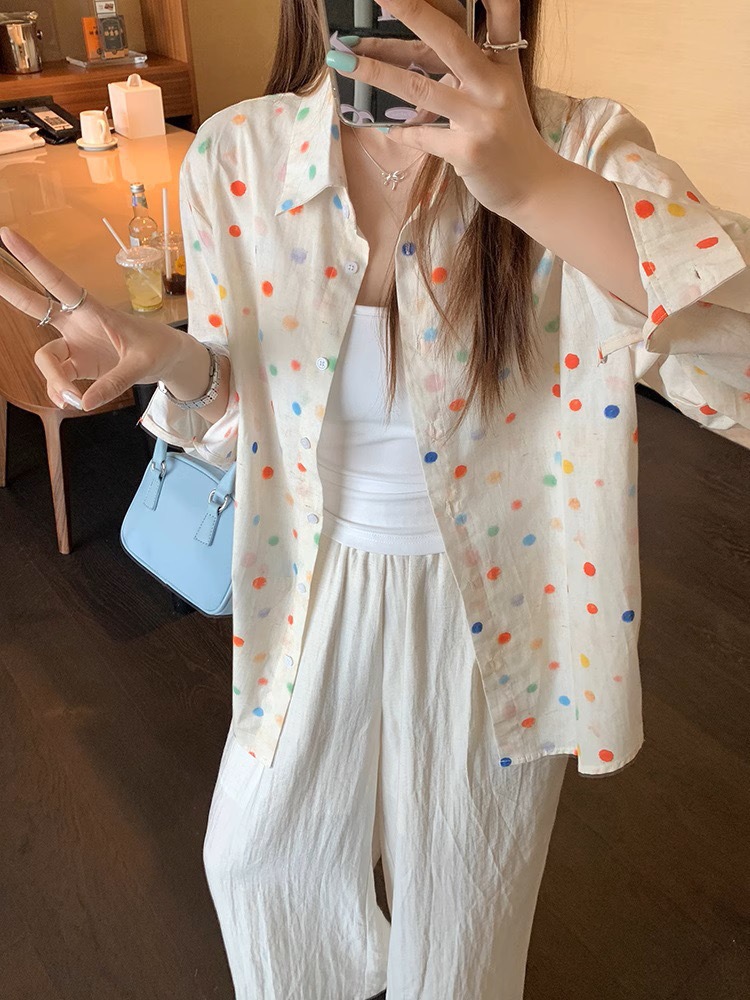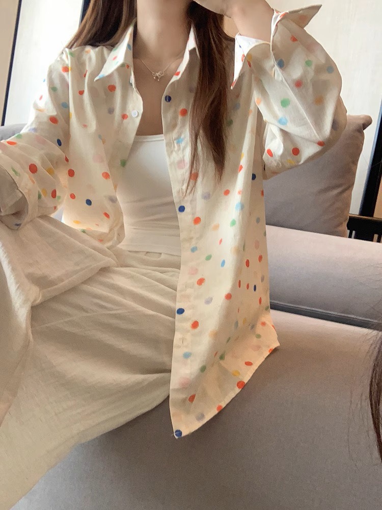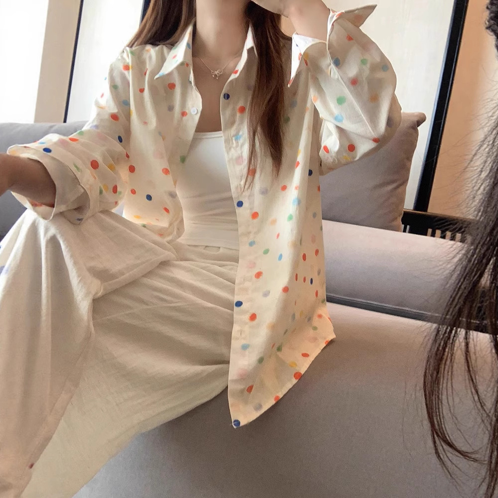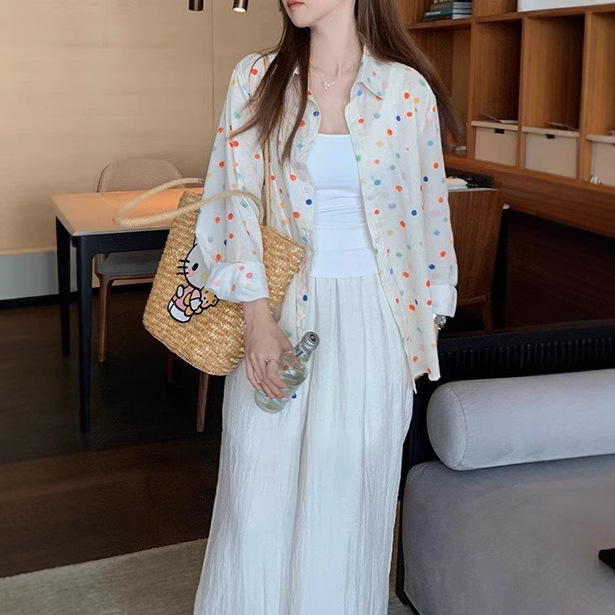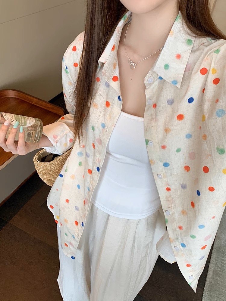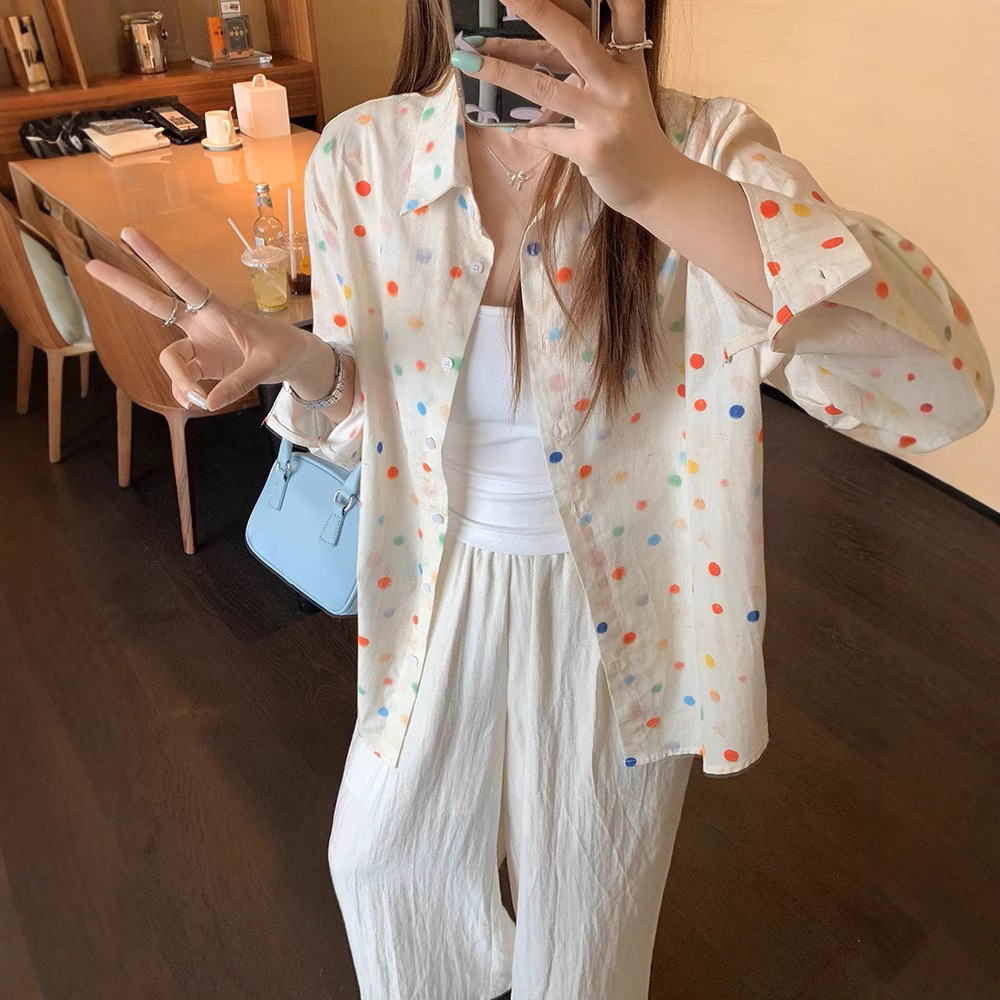 复古彩色波点翻领衬衫女夏季2025新款减龄百搭轻薄显瘦防晒上衣