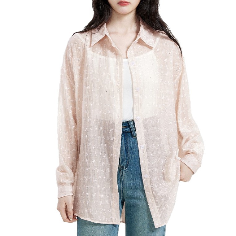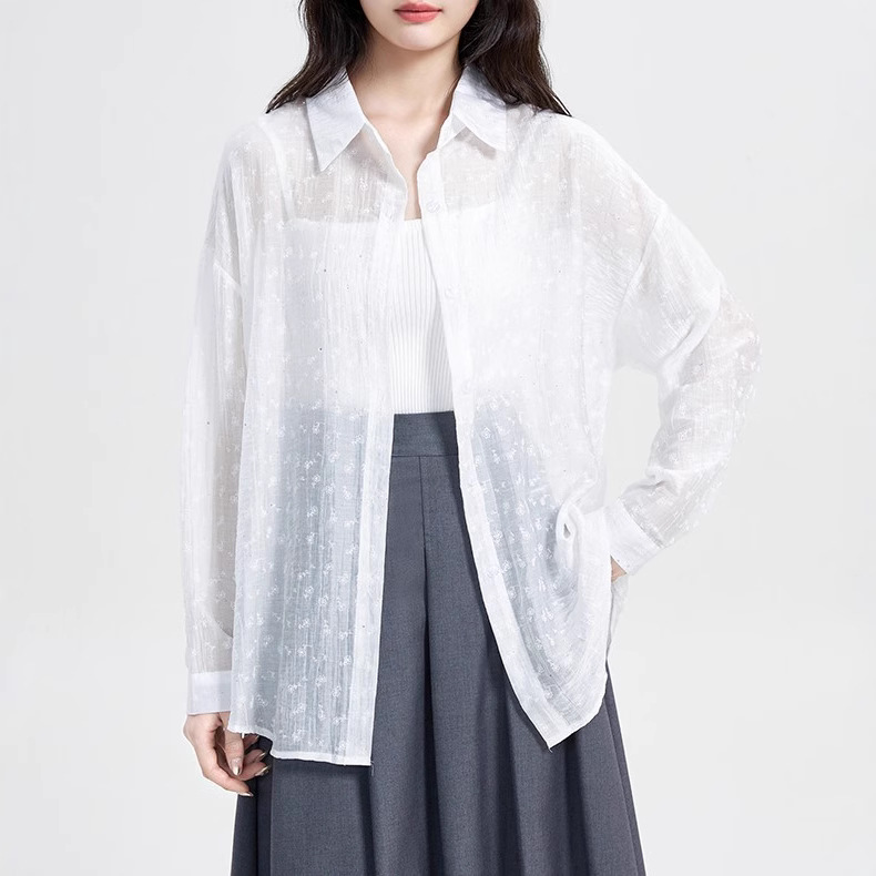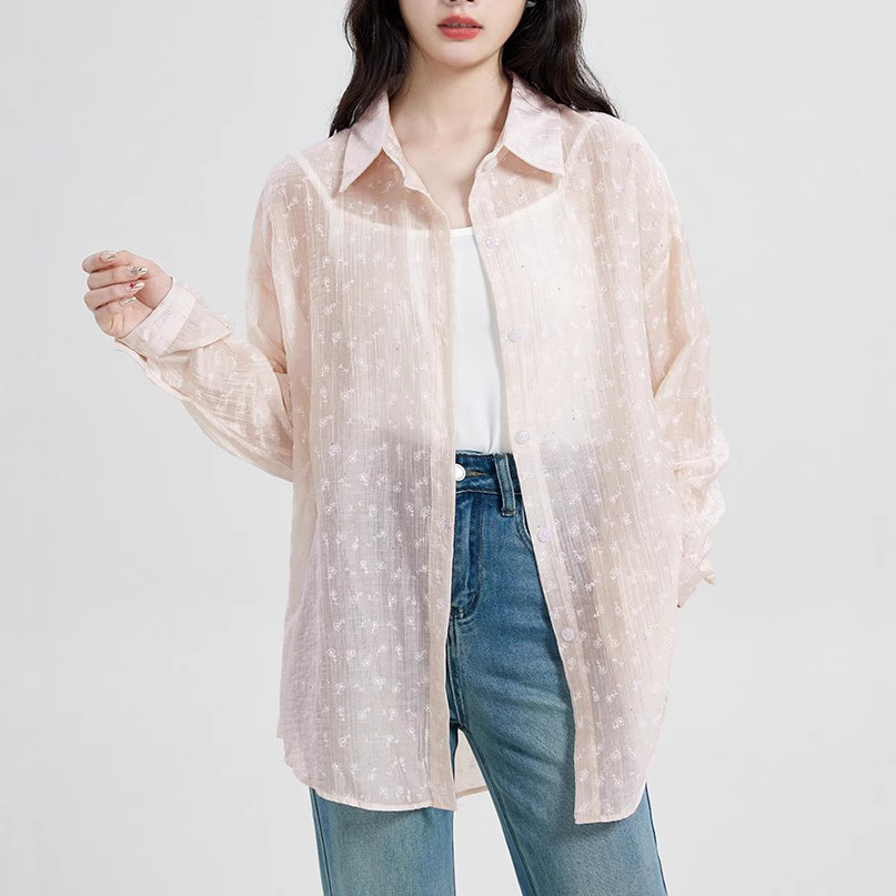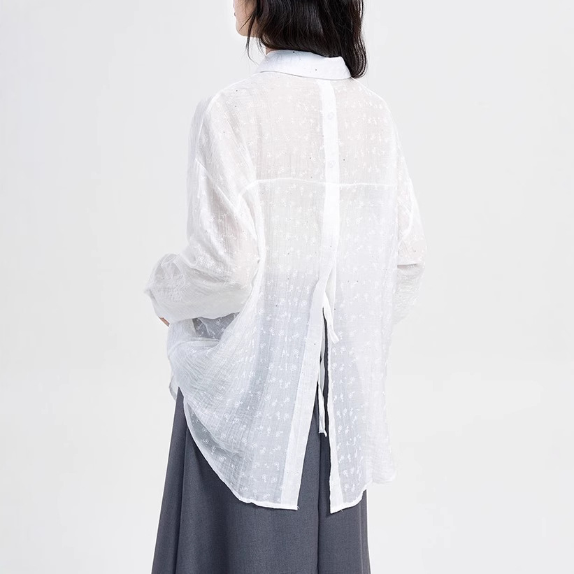 防晒宽松夏季女衬衫长袖开衫背面开叉系带半透雪纺薄款衬衣