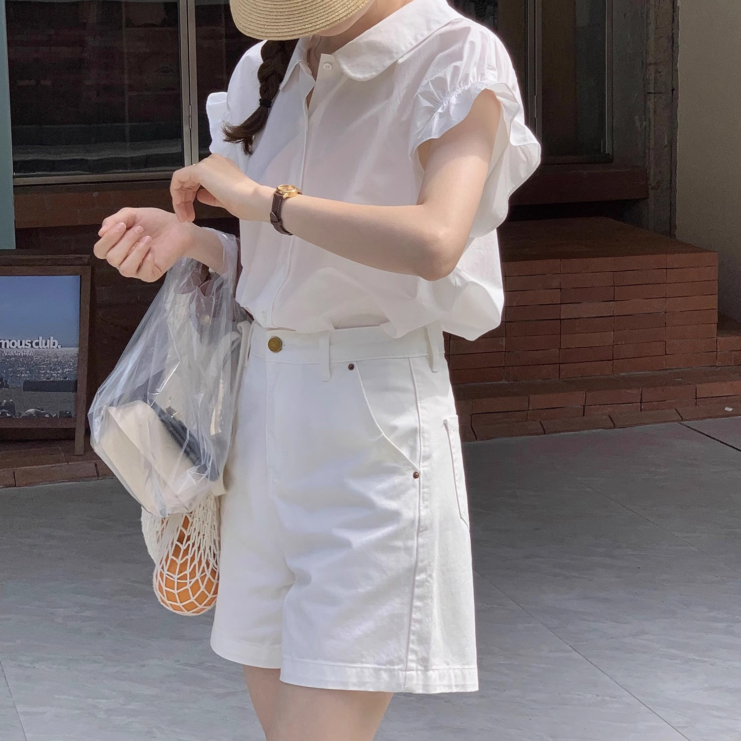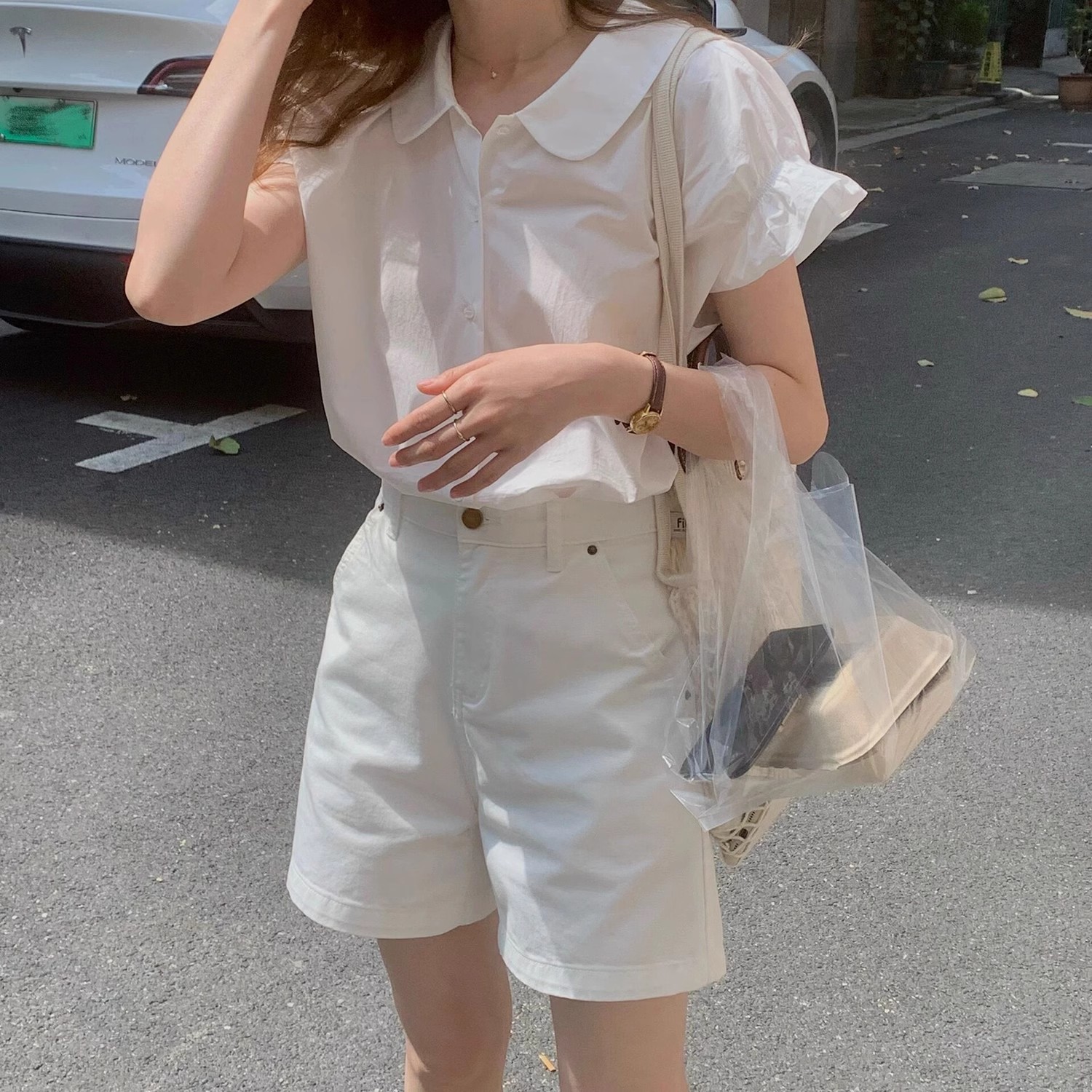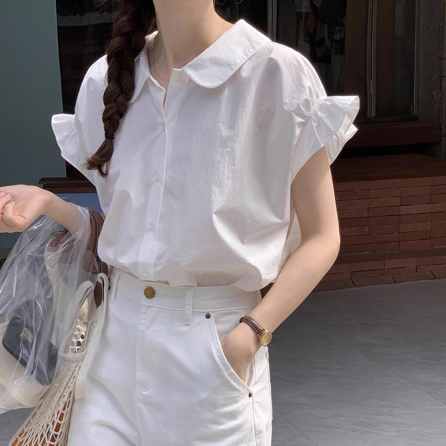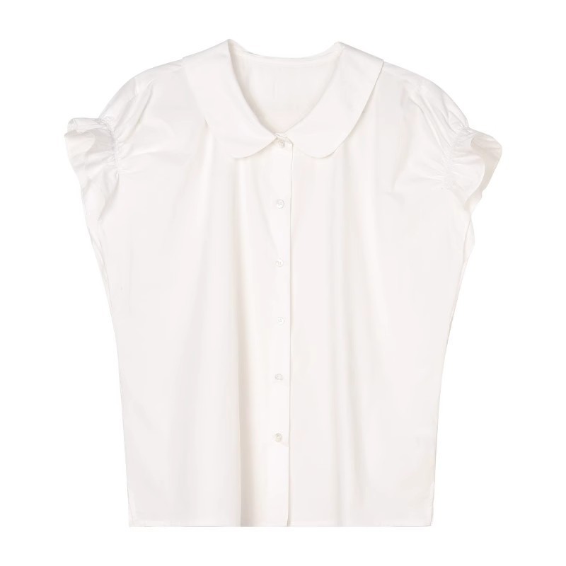 小飞袖白色衬衫女夏季短袖娃娃领小个子大码泡泡袖短款衬衣上衣