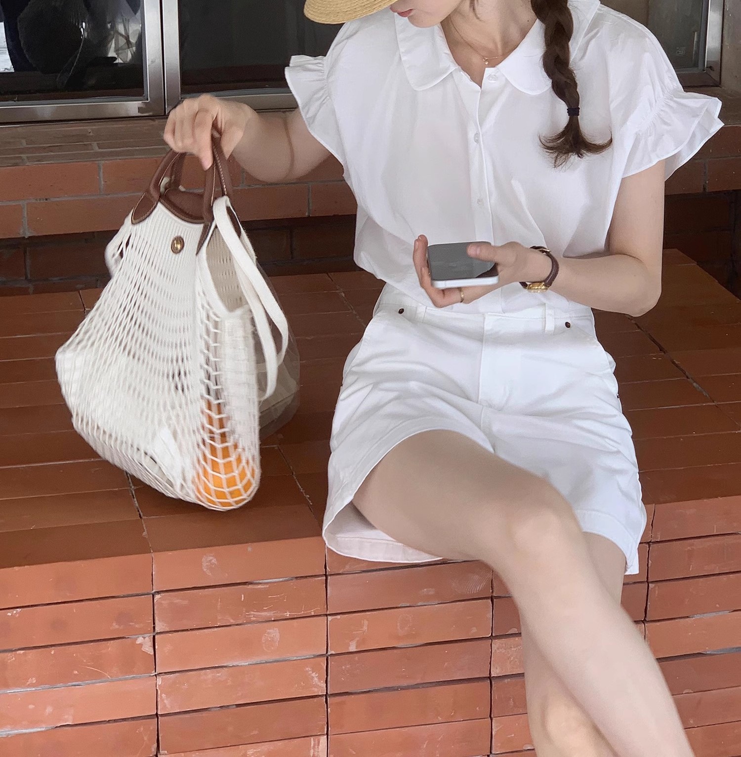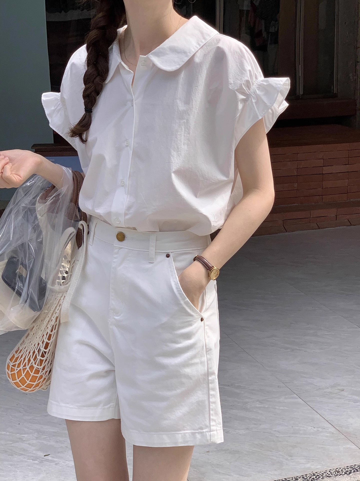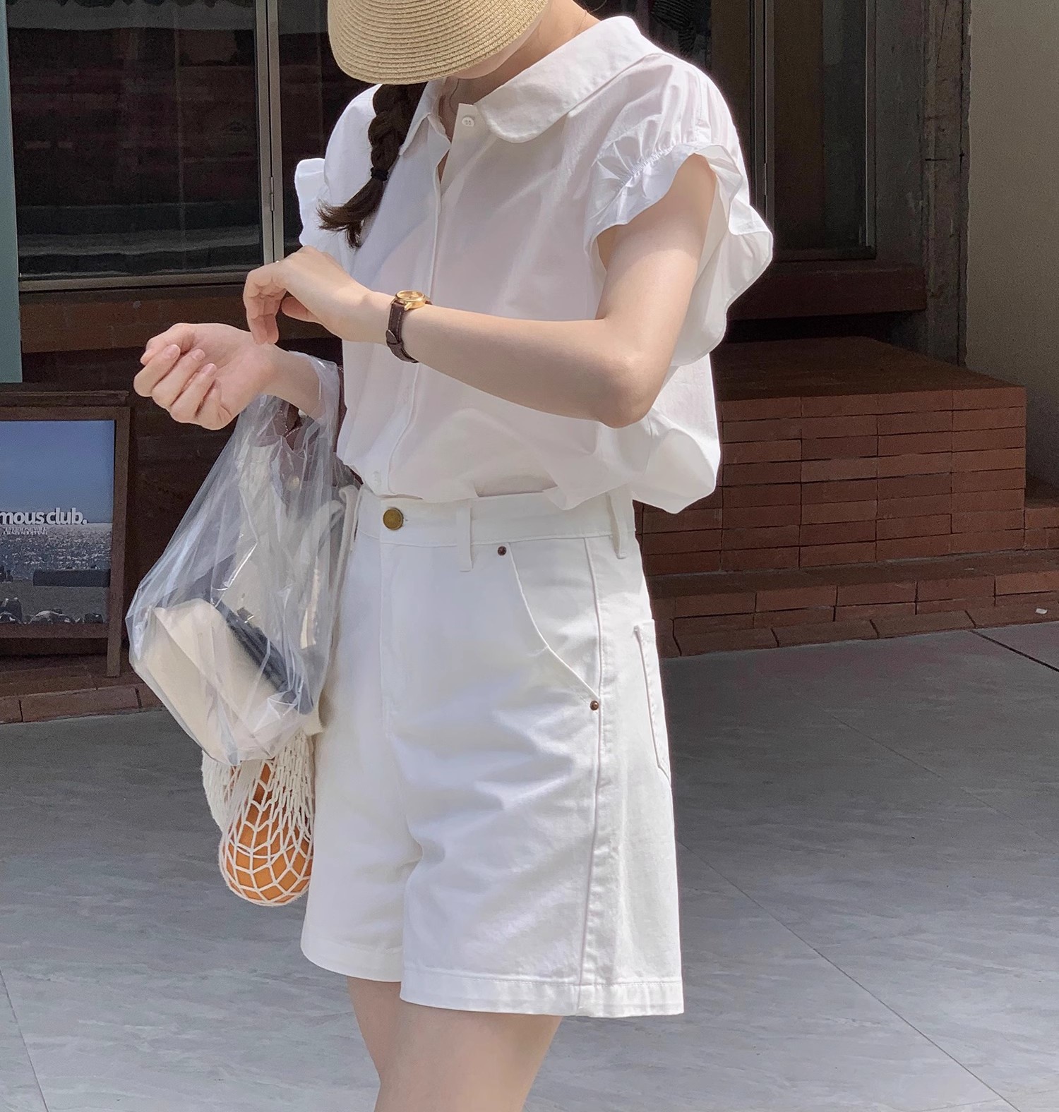 小飞袖白色衬衫女夏季短袖娃娃领小个子大码泡泡袖短款衬衣上衣