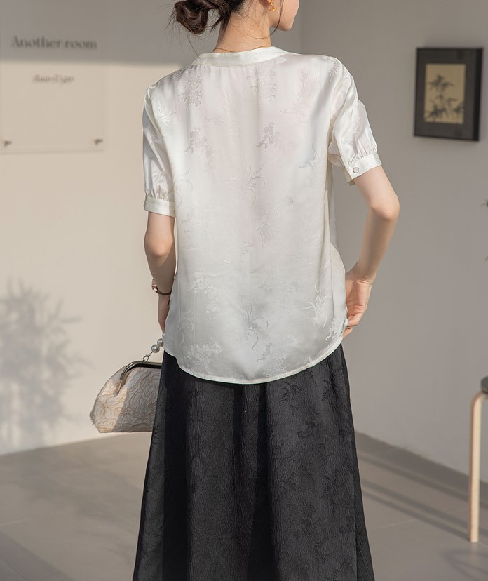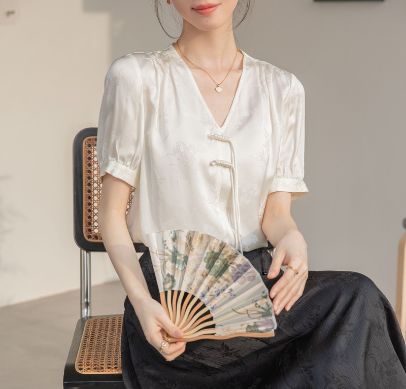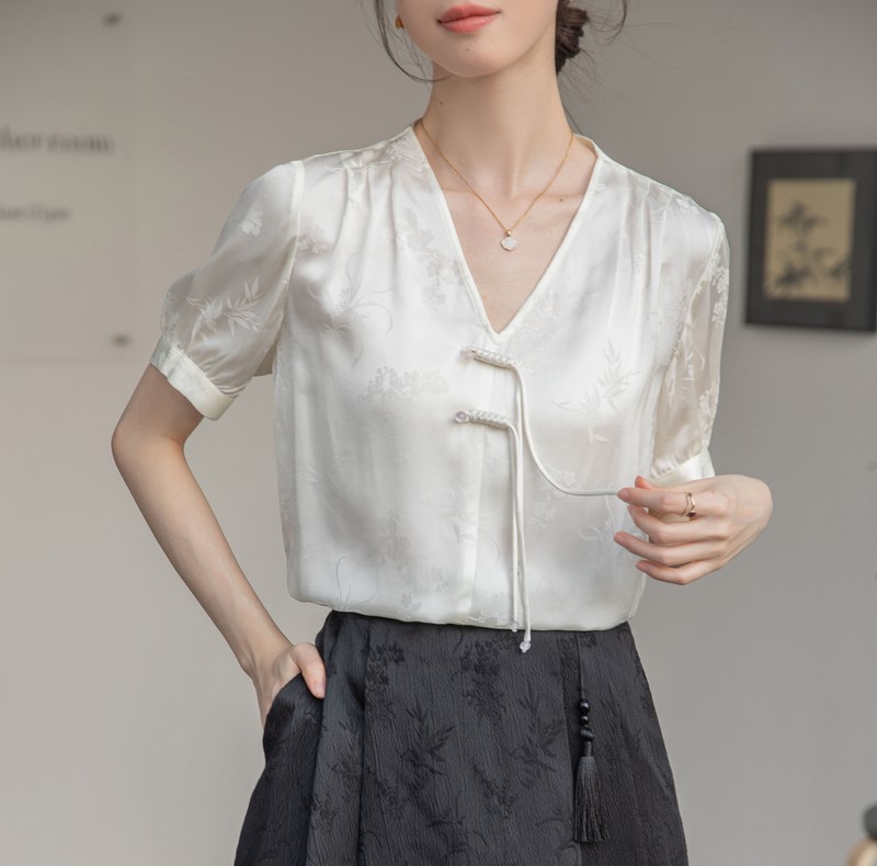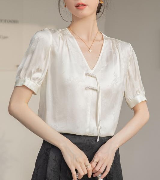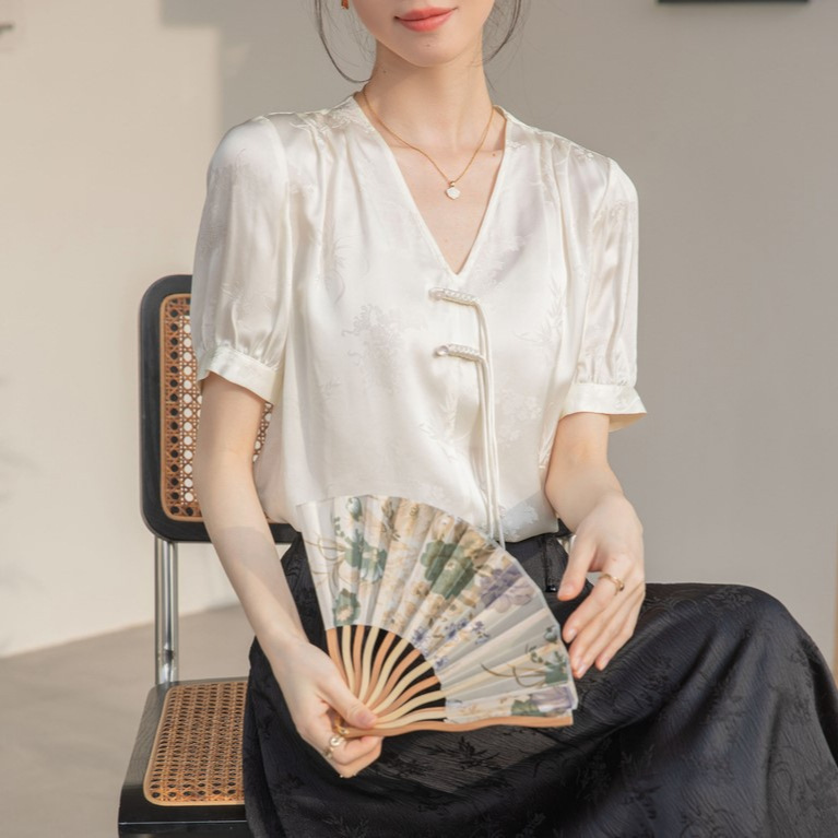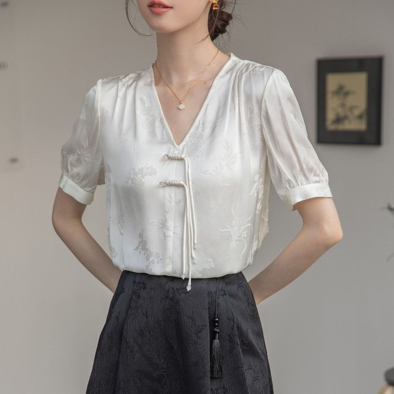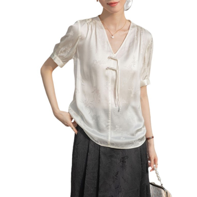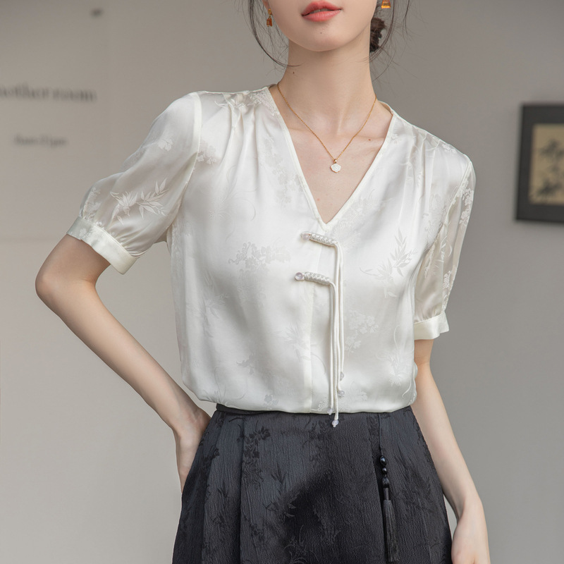 新中式v领醋酸缎面衬衫夏季女2025新款国风复古盘扣上衣短袖小衫