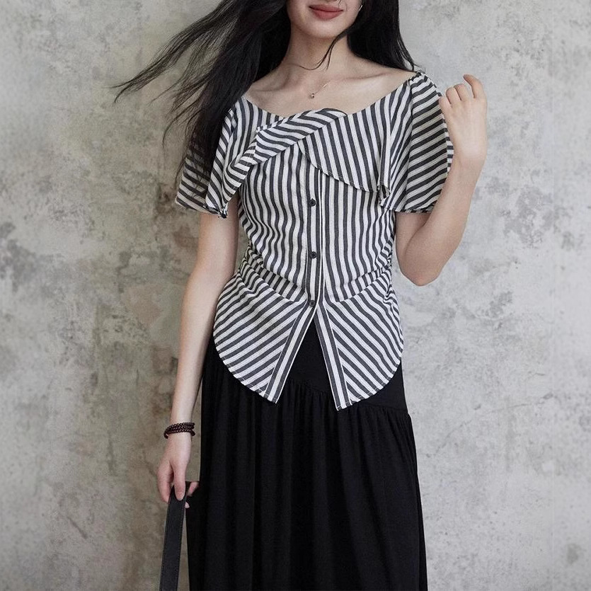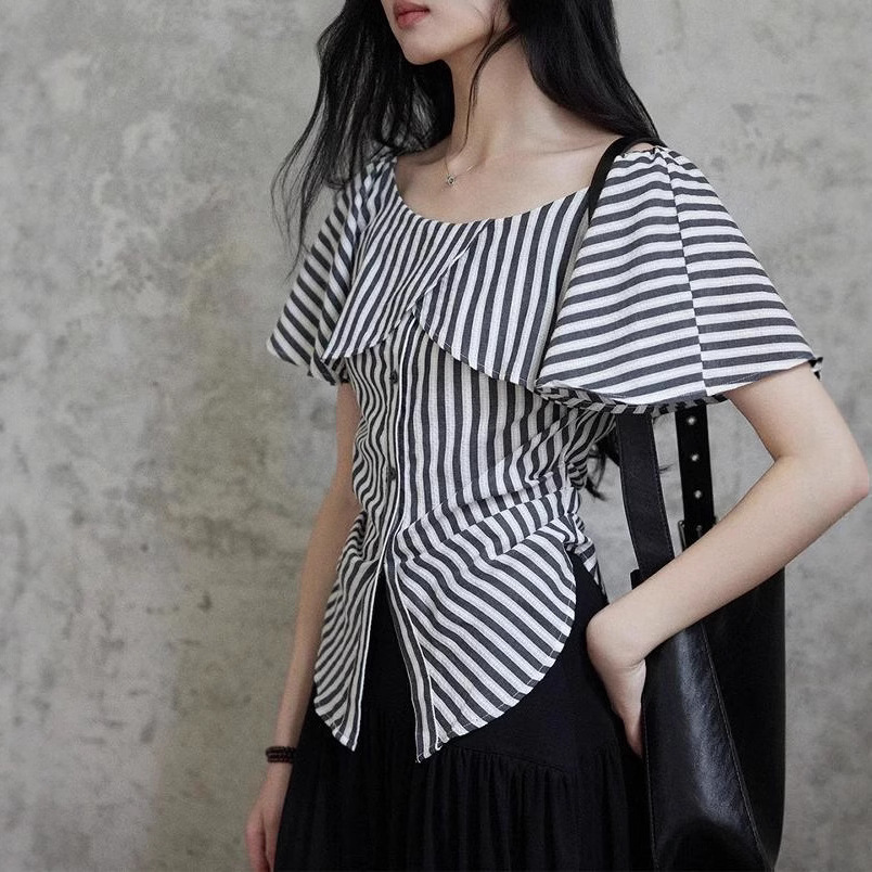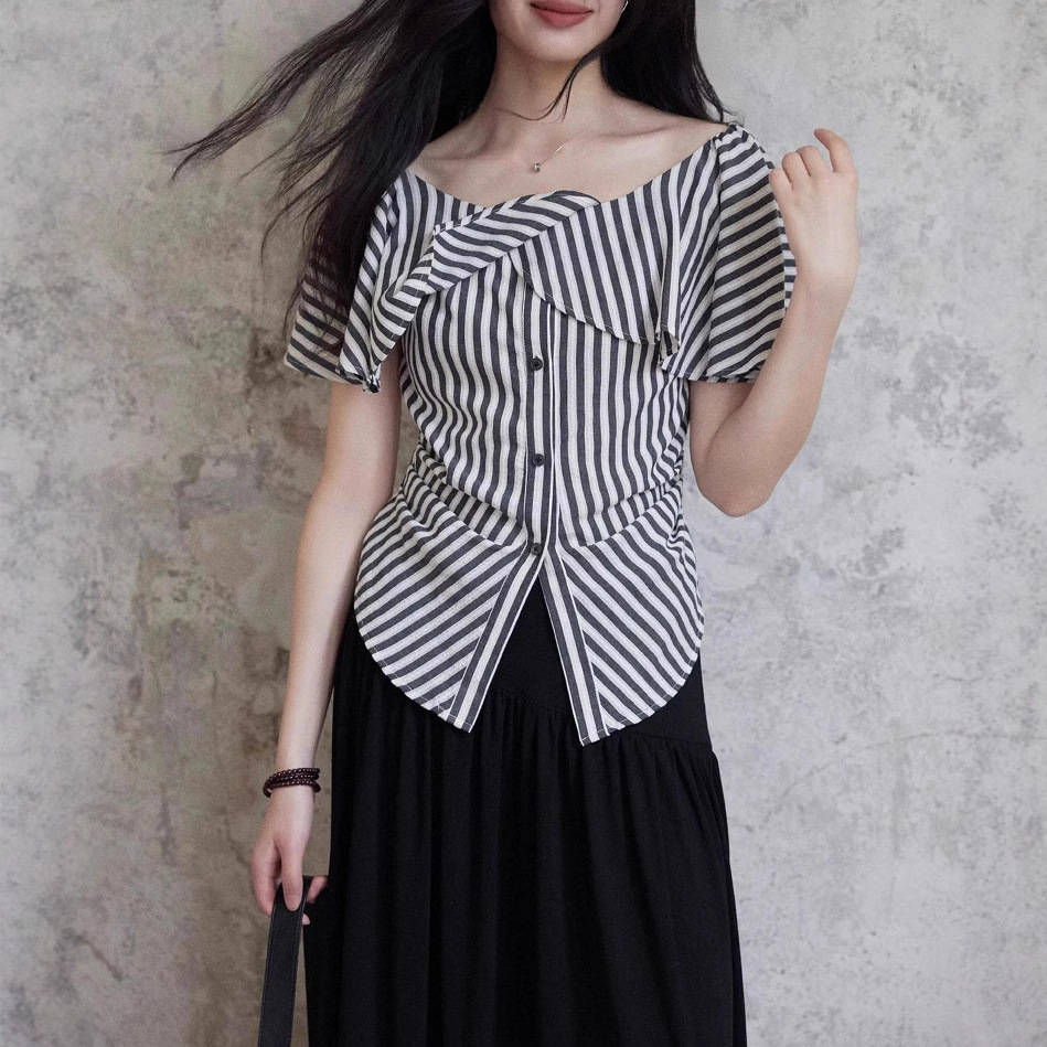 贰羊设计【情弦】黑白条纹短袖衬衫女2025法式荷叶一字肩收腰小衫