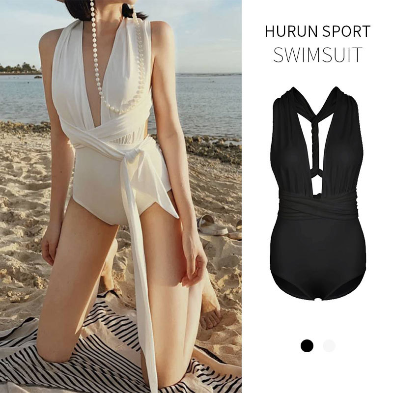 性感连体白色小香风气质绑带度假泳衣女深V领露背游泳装
