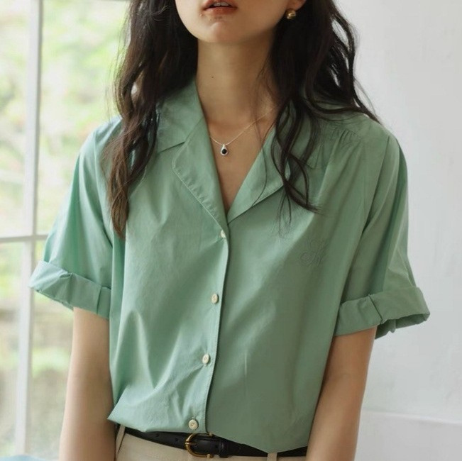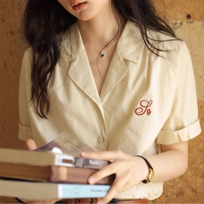 solihgter 法式古巴领字母绣花衬衫女夏季25新款宽松短袖衬衣